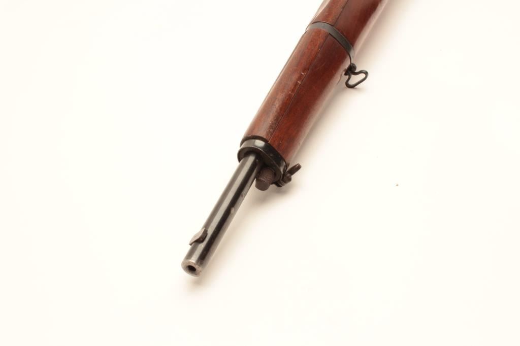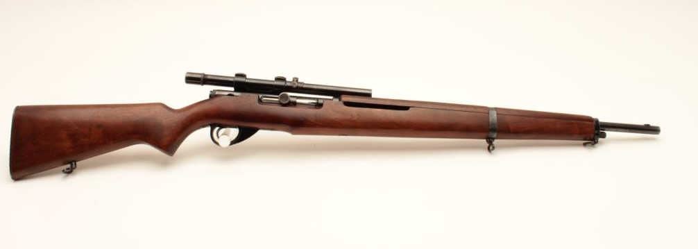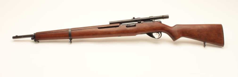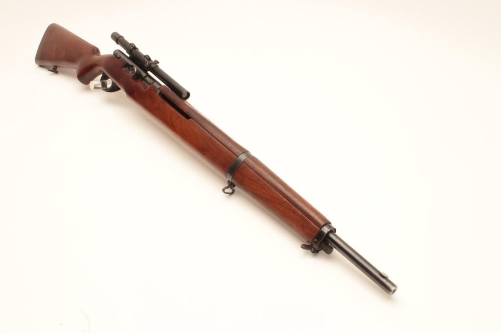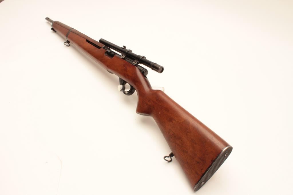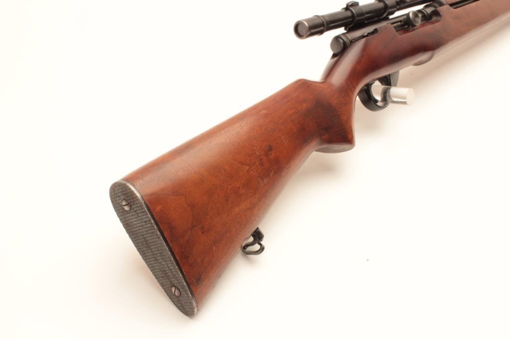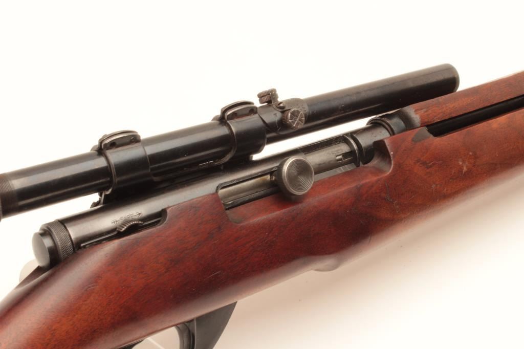 J. Stevens Springfield Model 87M bolt action rifle, .22 caliber, Serial #NSNV. The rifle is in very good overall condition with a 22” barrel with the front sight removed and the dovetail plugged. The rifle retains the Lot Title majority of its blue finish with wear at the muzzle and a plastic trigger guard. The smooth wood stock is in good overall condition with small mars and compressions and ends with a checkered steel butt plate. Lot Title The rifle is configured as a military trainer and comes topped with an El Paso marked Weaver Model 344 fixed power scope. The bore is good, the action crisp and markings are sharp on this desirable Stevens which is Lot Title scarcely seen in this configuration. Est.: $175-$350. (C+R).