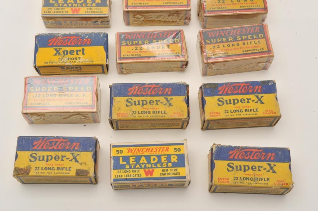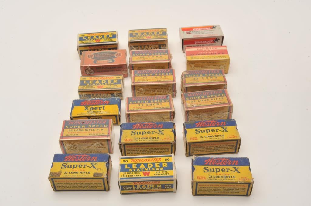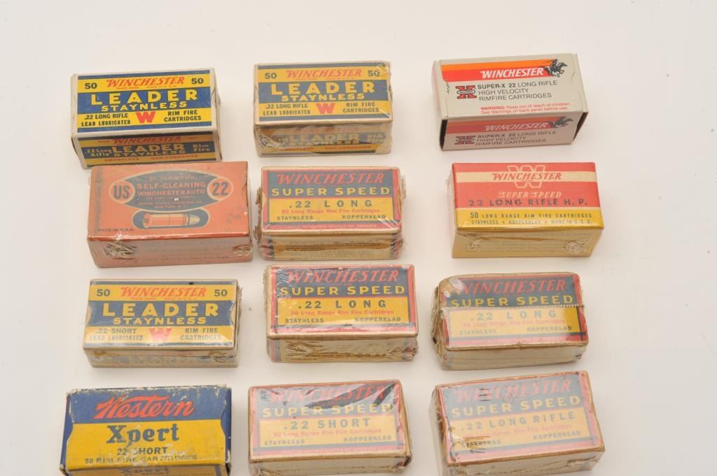 Approximately 18 boxes of mostly Winchester ammo and mostly filled including .22LR, .22LR H.P., .22 Long, .22 short and .22 Auto. Est.: $100-$200.