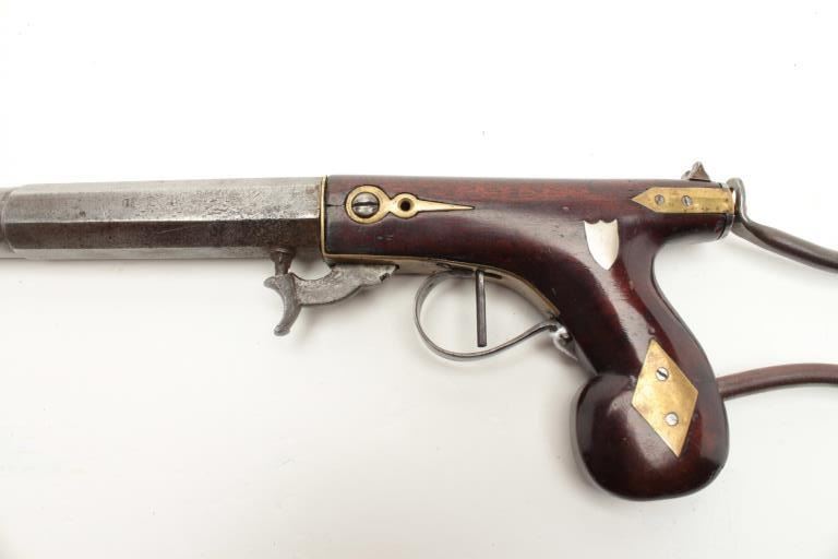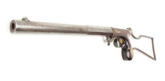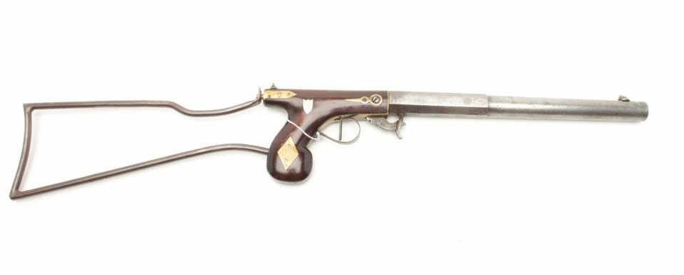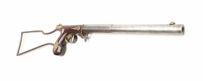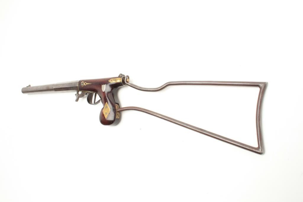 Under hammer percussion buggy rifle with wire frame detachable shoulder stock by “D.H. Hilliard, Cornish New Hampshire” with 11 3/16” half round/ half octagon barrel and 26 ½” overall with stock attached in .44 caliber Lot Title rifled. The top flat is nicely engraved and marker stamped. The stock shows a reddish color violin type varnish with brass inlays and at least very good condition. The metal is a gray patina with minor staining, erosion Lot Title and minor pitting. A very nice under hammer by a well-known New England maker. (Antique) Est.: $800-1600