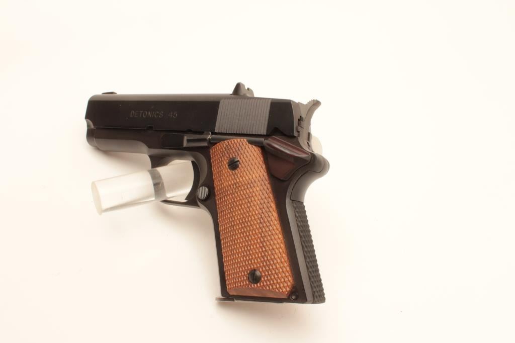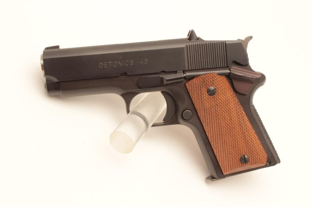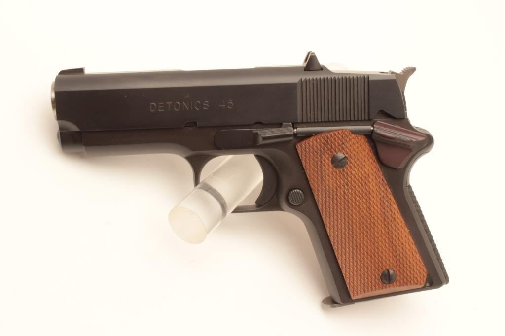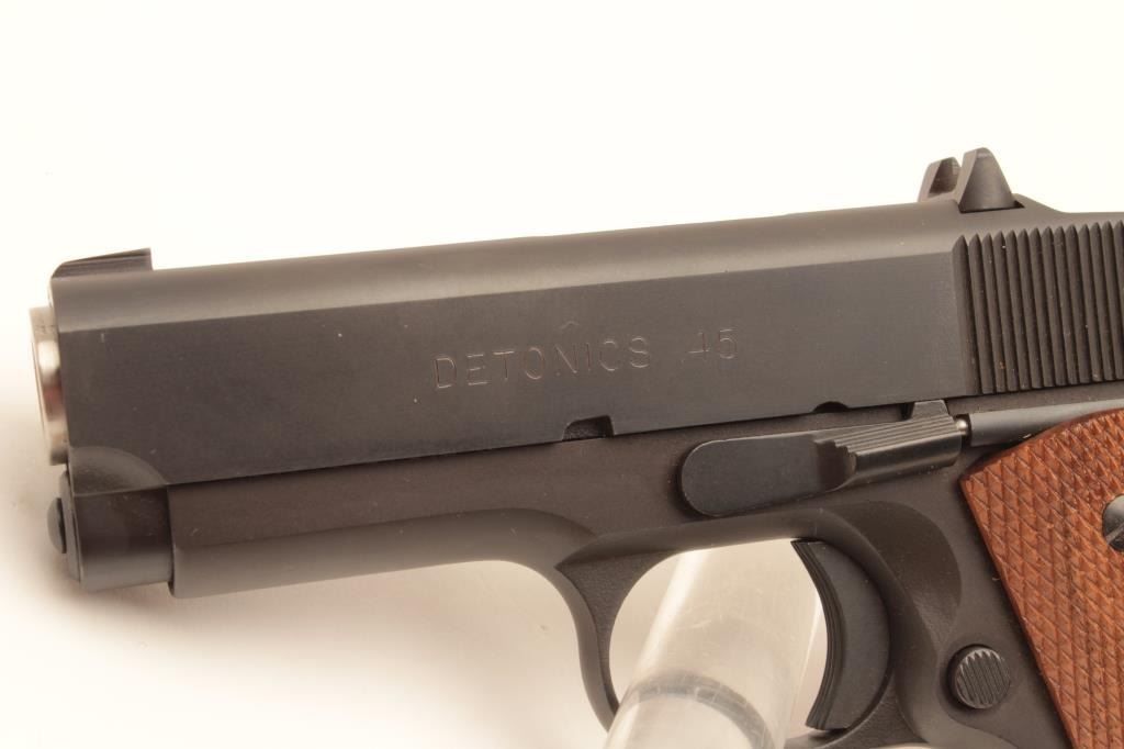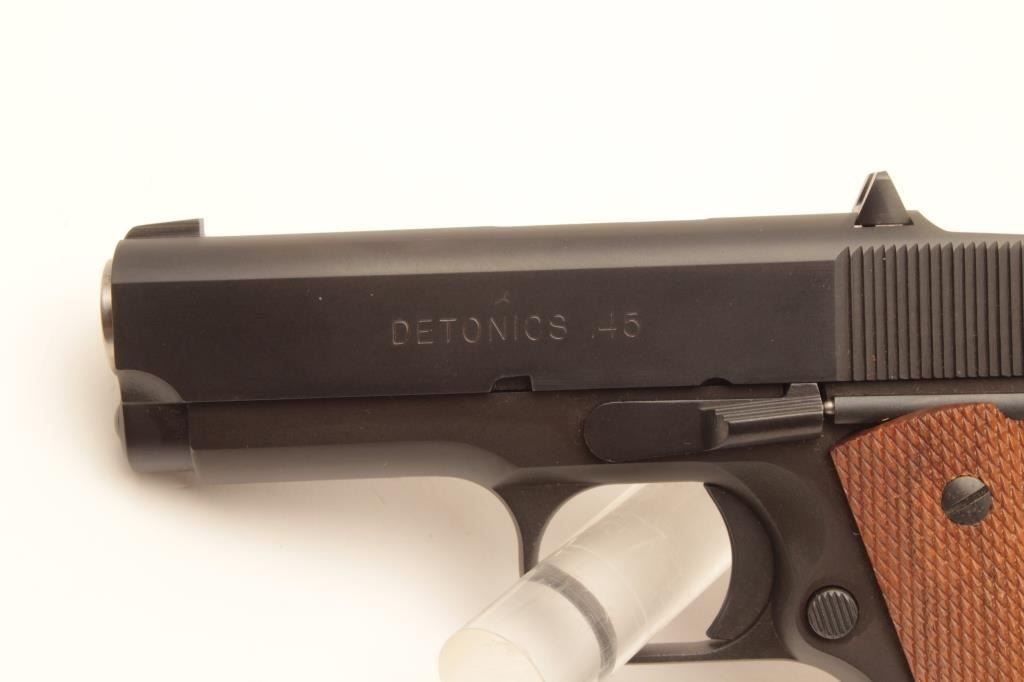 Detonics .45 semi-automatic pistol, .45 caliber, Serial #D8276. The pistol is in fine overall condition with a 3 ¼” barrel with a ramp front and fixed rear sights. The pistol is as new in the factory box retaining Lot Title nearly all of its blue finish. The pistol bears English proof marks at the rear of the slide. The checkered wood grips are in very good condition with only light storage marks noted and a checkered rubber grip strap. Lot Title The bore is very good, the action is crisp. The lot includes one correct magazine and the original factory cardboard box with all associated packaging materials. Est.: $400-$800. (Modern).