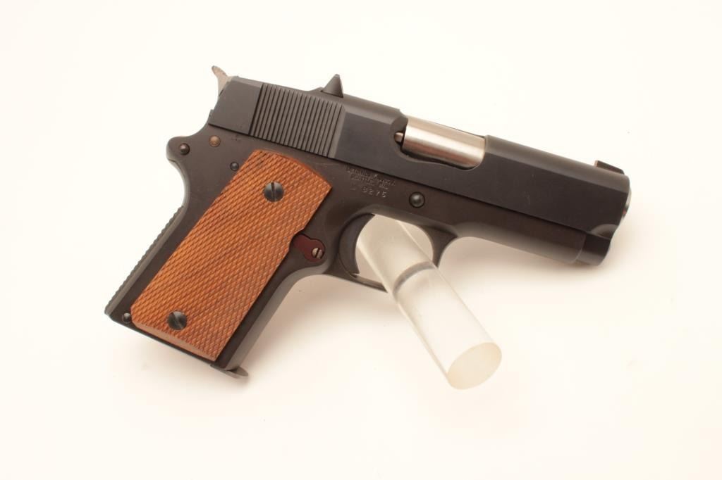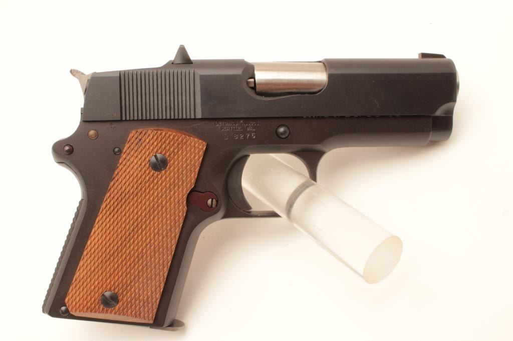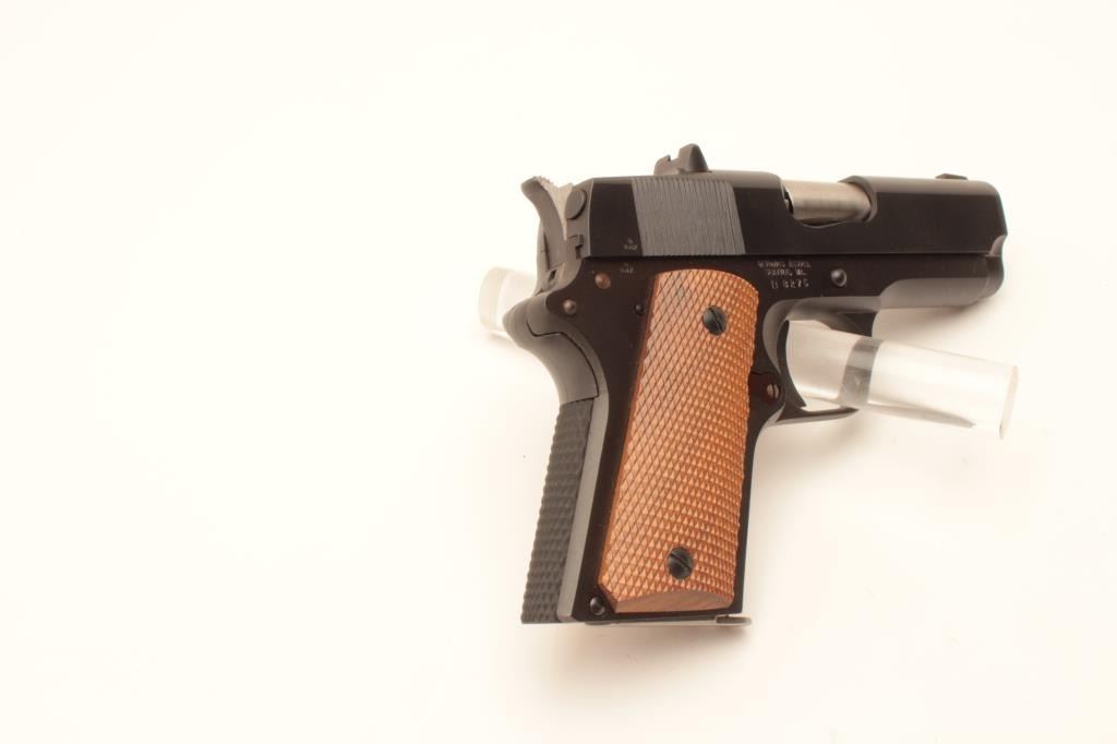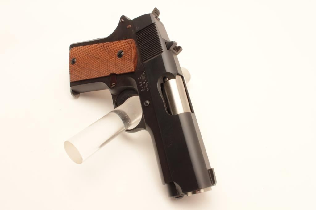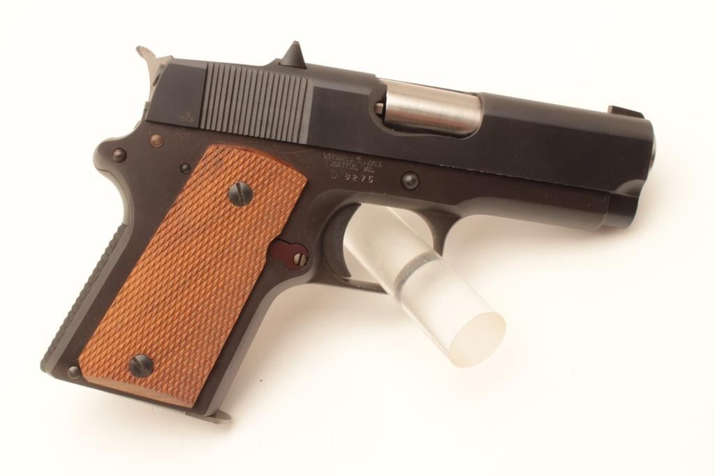 Detonics .45 semi-automatic pistol, .45 caliber, Serial #D8276. The pistol is in fine overall condition with a 3 ¼” barrel with a ramp front and fixed rear sights. The pistol is as new in the factory box retaining Lot Title nearly all of its blue finish. The pistol bears English proof marks at the rear of the slide. The checkered wood grips are in very good condition with only light storage marks noted and a checkered rubber grip strap. Lot Title The bore is very good, the action is crisp. The lot includes one correct magazine and the original factory cardboard box with all associated packaging materials. Est.: $400-$800. (Modern).