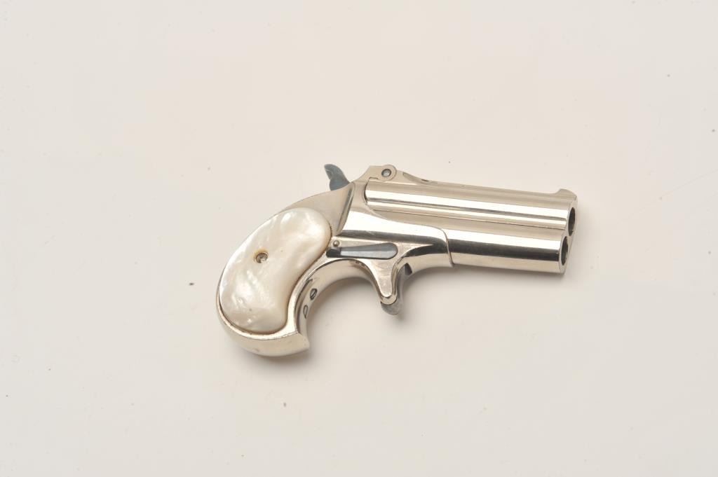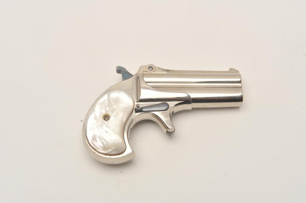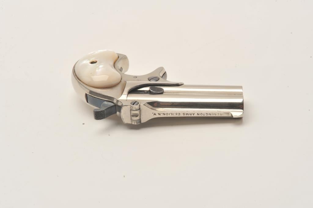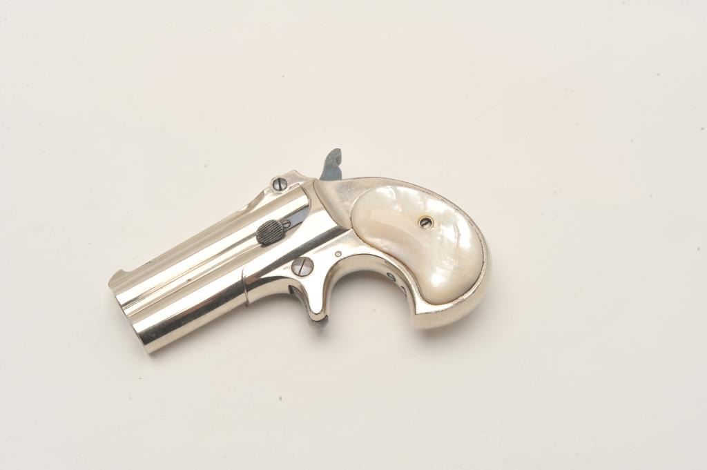 Remington Double Derringer in .41 Rim-fire showing 1 line “Remington Arms Co., Ilion N.Y.” address, (Big C little O), S/N 227. Nickel plated with pearl grips remaining in fine to excellent original condition. 98%-99% Lot Title plus original nickel, bright fire blue on small parts, hammer and trigger. Sharp and crisp with fine grips. Very slight to almost no age. Near mint. The collection of Doug Drummond with a copy of his book included. Lot Title (Antique) Est.: $1600-$3000