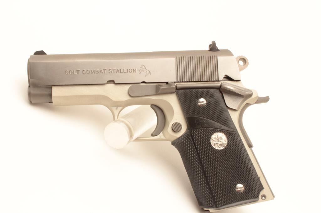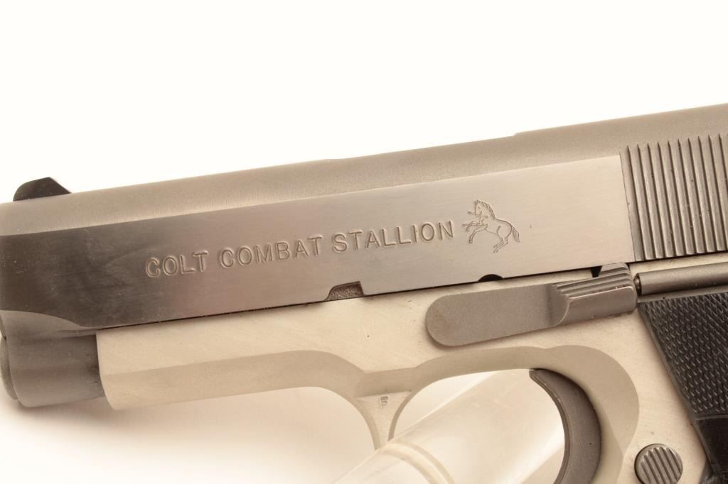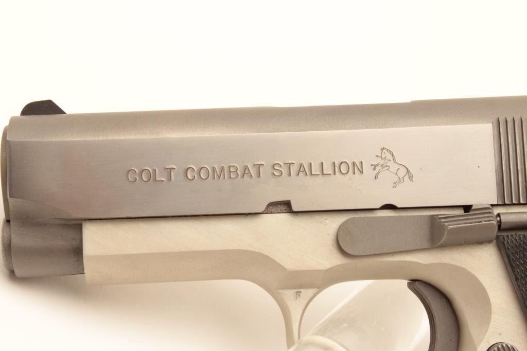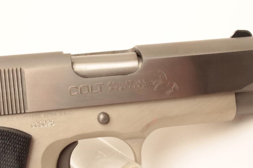 Colt Combat Stallion semi-automatic pistol, .45 ACP caliber, Serial #CCS025. This limited production lightweight officer’s model features a 3 ½” barrel with a matte stainless finish on an alloy frame and Lot Title polished stainless finish on the slide, marked Colt Combat Stallion. The grips are checkered rubber Pachmayr with silver Colt medallions. The pistol comes in the black, plastic Colt factory case with a stainless Lot Title officer’s size magazine and a full size stainless magazine. Extremely limited in production, the pistol is as new in the case with all associated packaging materials. Est.: $1,000-$2,000. (Modern).