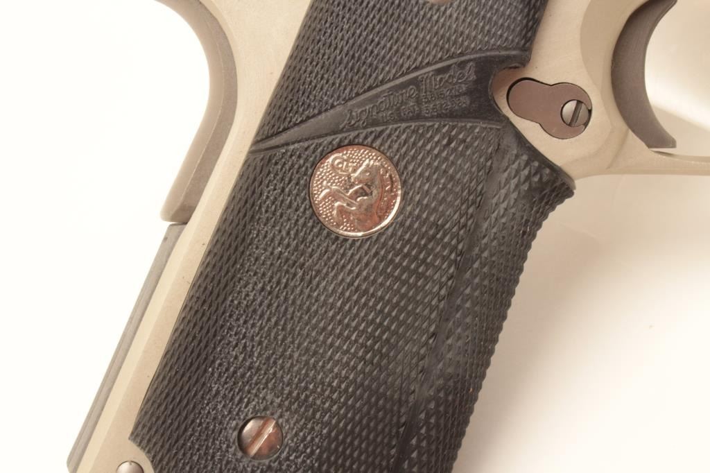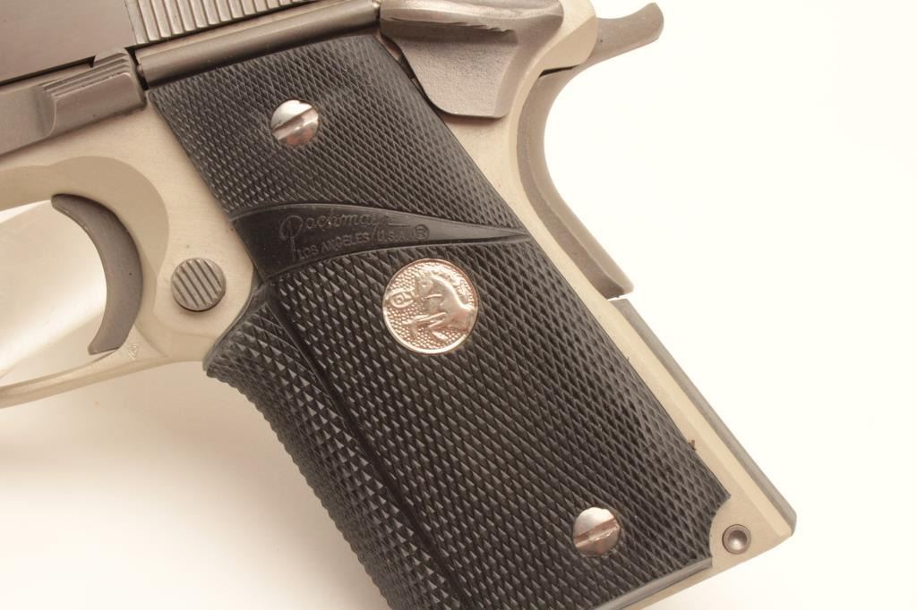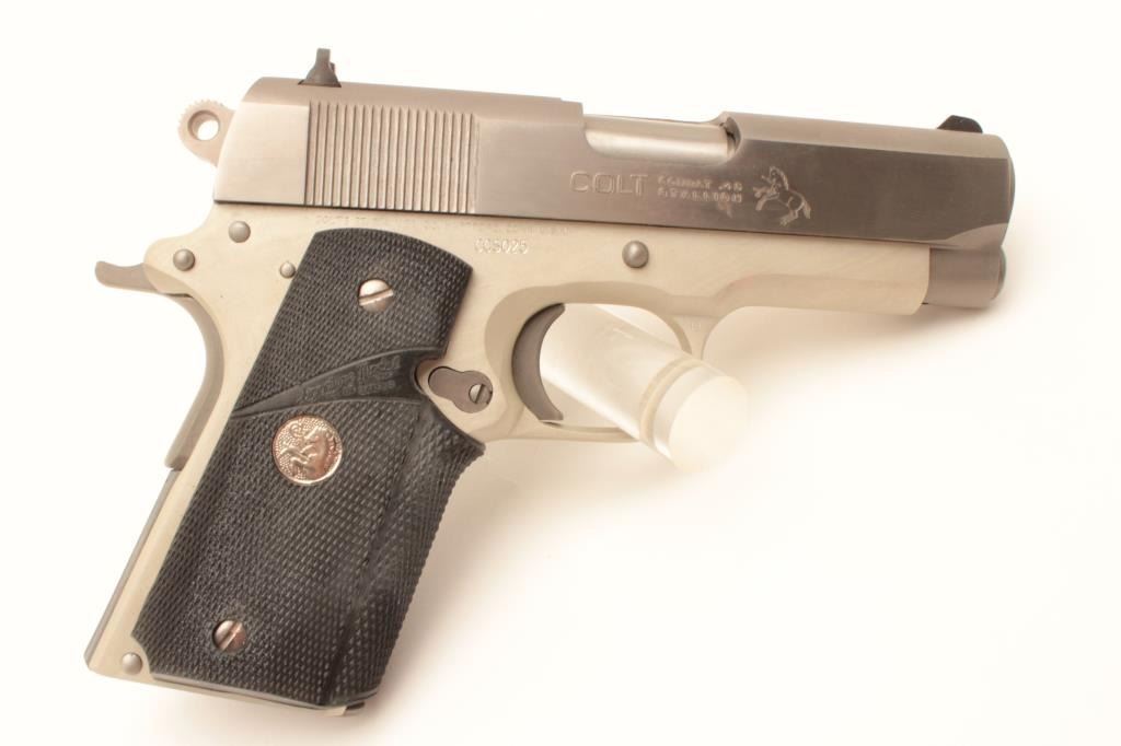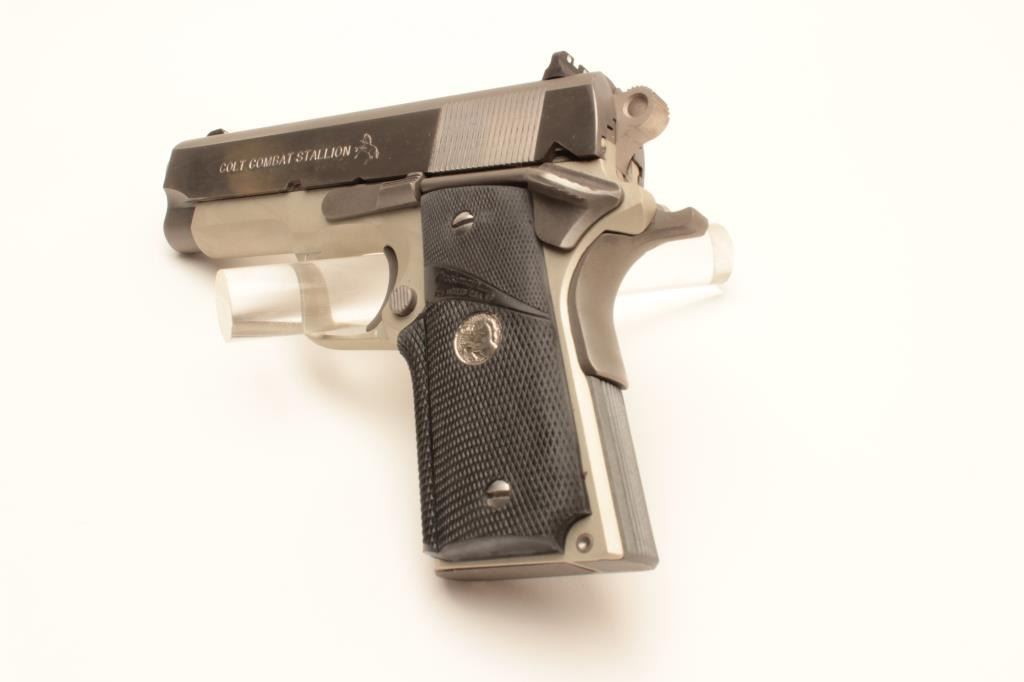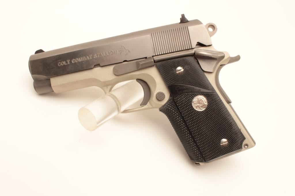Colt Combat Stallion semi-automatic pistol, .45 ACP caliber, Serial #CCS025. This limited production lightweight officer’s model features a 3 ½” barrel with a matte stainless finish on an alloy frame and Lot Title polished stainless finish on the slide, marked Colt Combat Stallion. The grips are checkered rubber Pachmayr with silver Colt medallions. The pistol comes in the black, plastic Colt factory case with a stainless Lot Title officer’s size magazine and a full size stainless magazine. Extremely limited in production, the pistol is as new in the case with all associated packaging materials. Est.: $1,000-$2,000. (Modern).