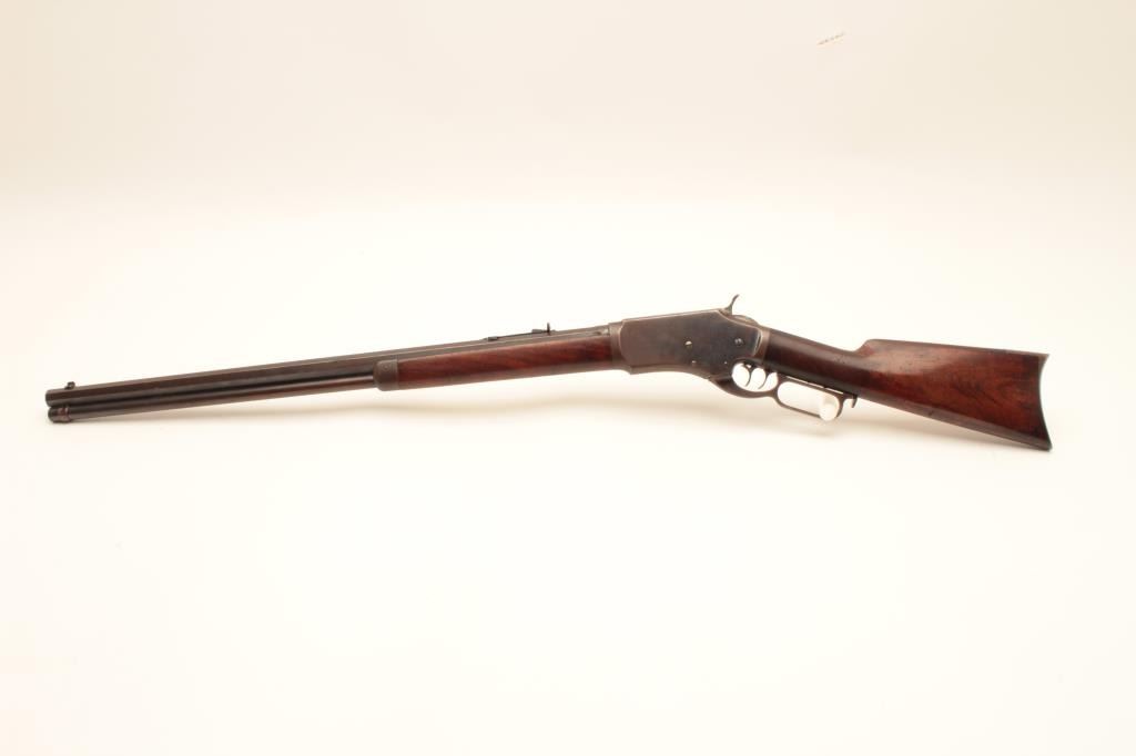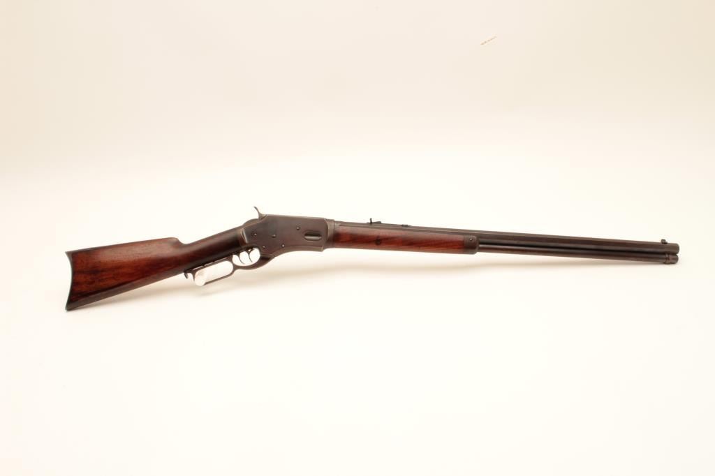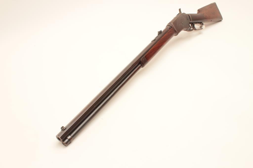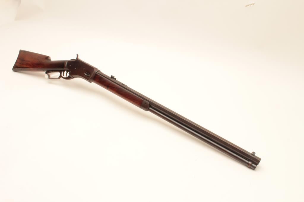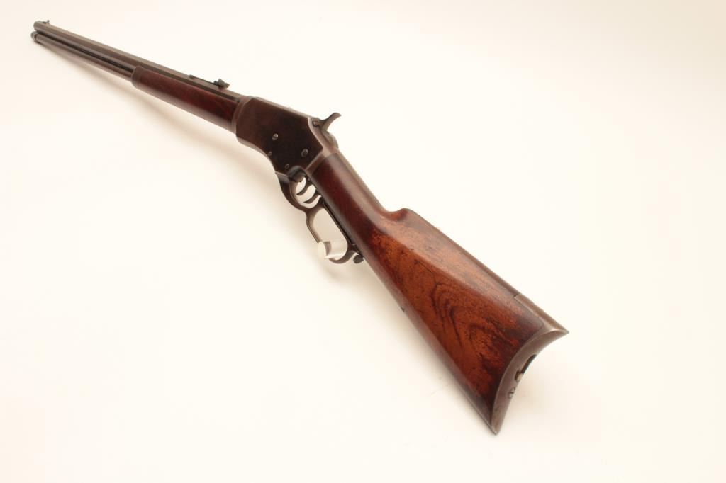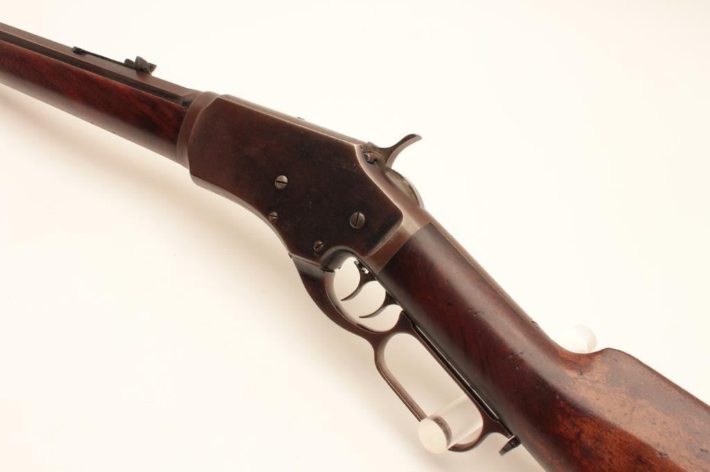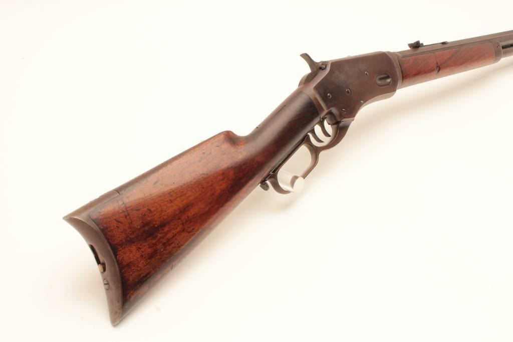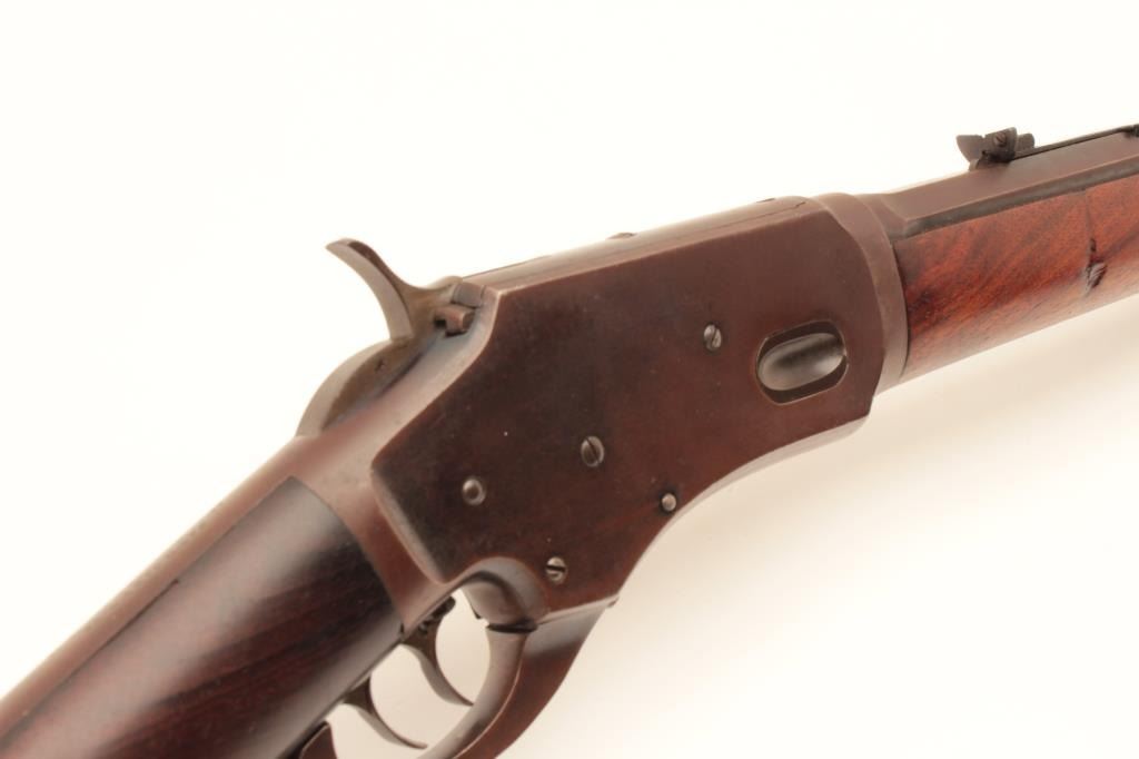Whitney lever action rifle, .44 caliber, Serial #1458. The rifle is in very good to nearly fine overall condition with a 24” octagon barrel with replacement front and rear sights. The barrel and full-length Lot Title magazine retain the majority of their muted blue finish with the remainder going to a plum patina. The receiver shows significant flaking blue with the remainder going to plum patina. The hammer and trigger show old Lot Title toning case hardening and the patent date is clearly visible on the tang. The smooth wood stock is in good condition showing moderate wear with small mars and compressions consistent with carry and use. The butt ends Lot Title with a smooth steel crescent butt plate with trap. The bore is fair, the action functions and the markings are legible. Est.: $1,400-$2,800. (Antique).