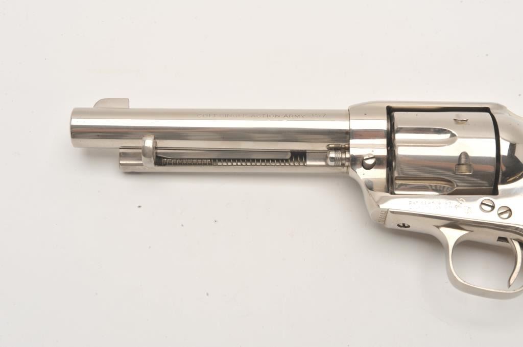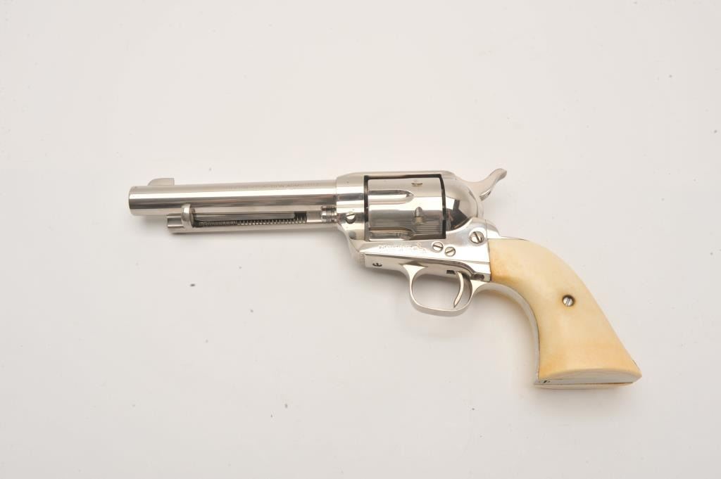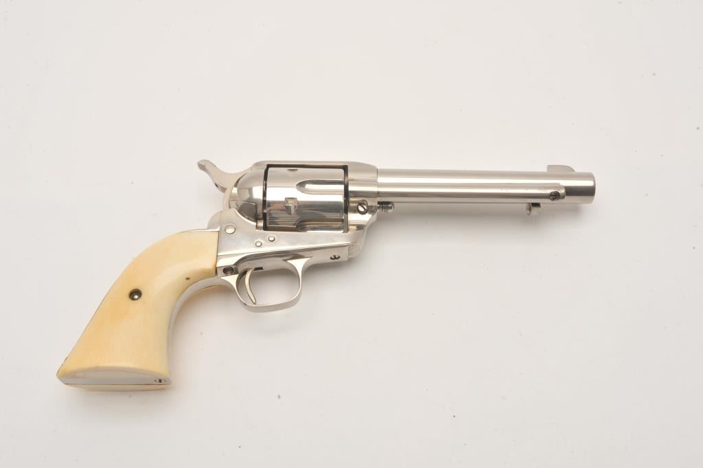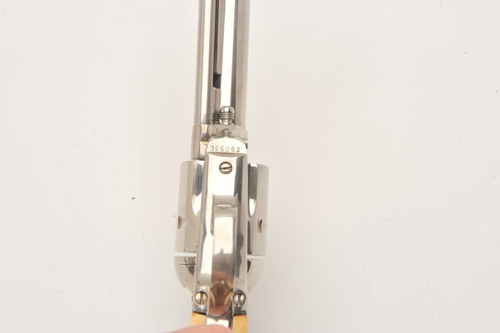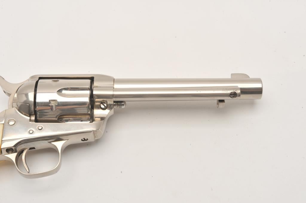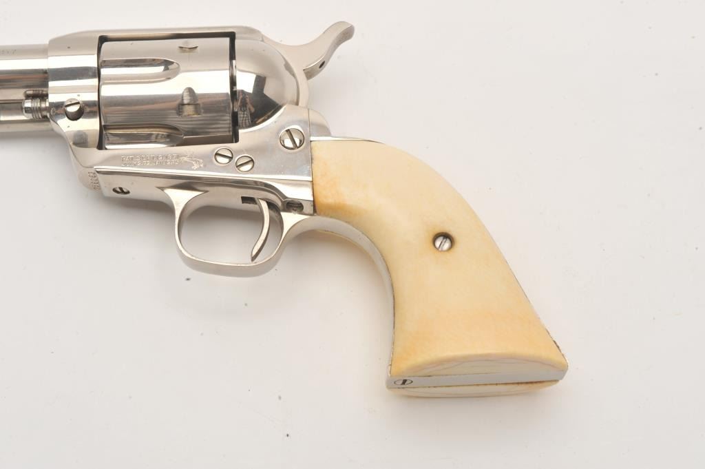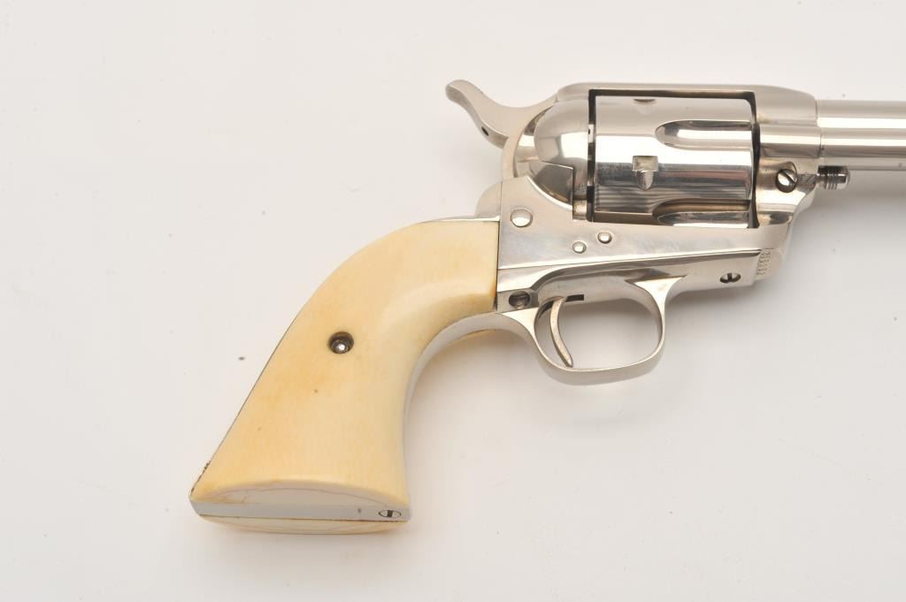 Colt Single Action Army revolver in scarce .357 Mag caliber with a 5 ½” barrel, factory re-nickeled finish, and ivory grips, S/N 356063. Letters from our consignor’s estate dated 1954 confirm original factory nickel Lot Title and colt finally agreeing to re-plate as finish had “Flaked”. 99%-100% 1954 applied factory nickel remains with slight firing and use since refinish and rebuild. The ivory grips show age and are slightly undersized. Lot Title Rework numbers on loading gate. Sharp markings and fine bore. Few 1 generations in .357 magnum caliber were factory nickeled. Made 1939. (C&R/PPT) Est.: $3000-$6000