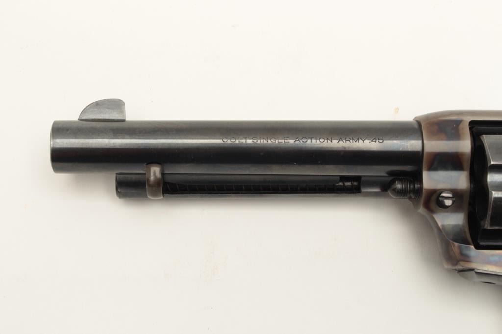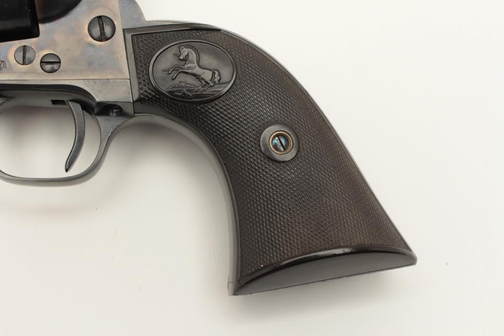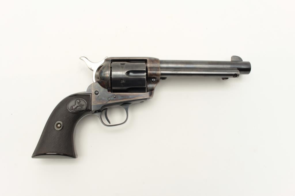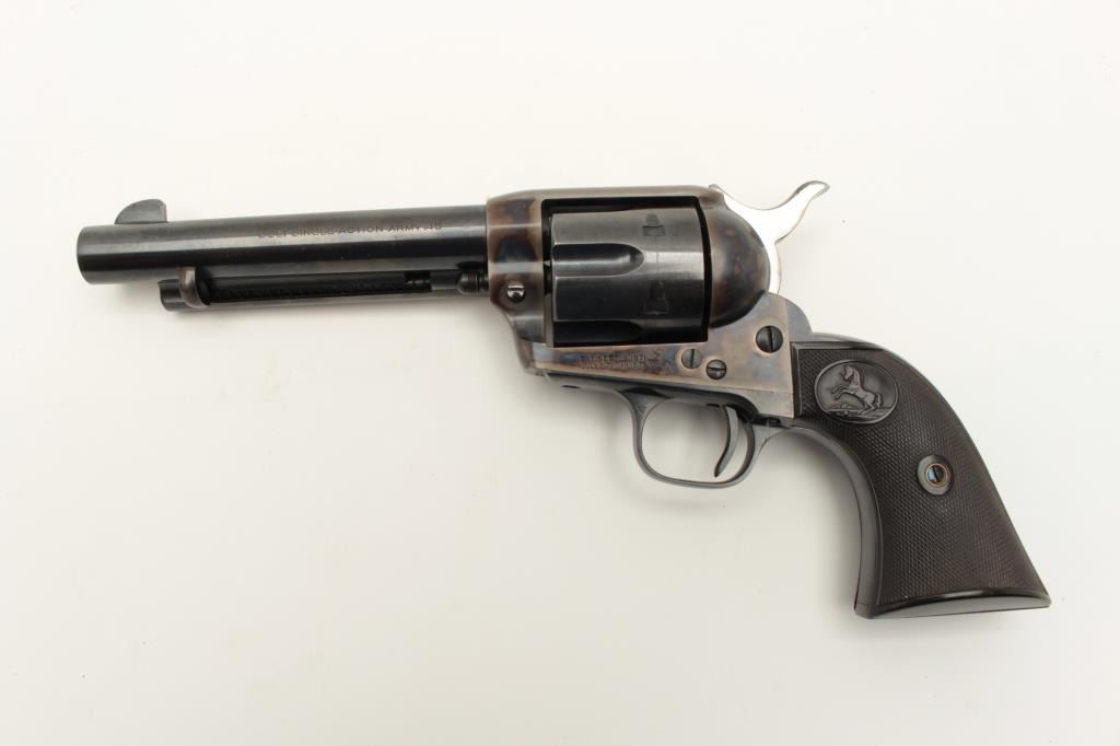 Colt Single Action Army 1st Generation Revolver in .45 Colt caliber with a 5 ½” barrel, blue and case color finish, S/N 357348 made 1940. In last 200 pre-war manufacture. 97%-99% original bright blue and Lot Title case. The grips are near fine with slight normal aging. Excellent interior. A strong 9.5 on a 1-10 scale. (C&R/PPT) Est.: $3000-$6000