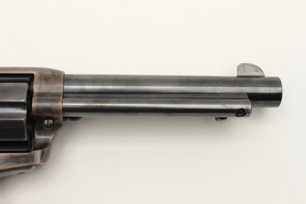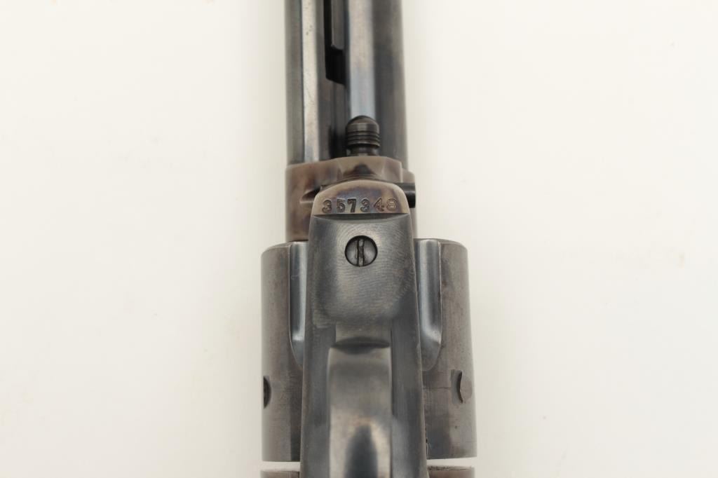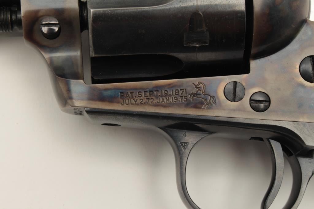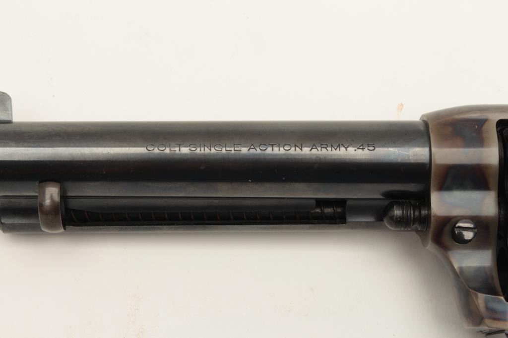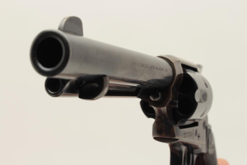 Colt Single Action Army 1st Generation Revolver in .45 Colt caliber with a 5 ½” barrel, blue and case color finish, S/N 357348 made 1940. In last 200 pre-war manufacture. 97%-99% original bright blue and Lot Title case. The grips are near fine with slight normal aging. Excellent interior. A strong 9.5 on a 1-10 scale. (C&R/PPT) Est.: $3000-$6000