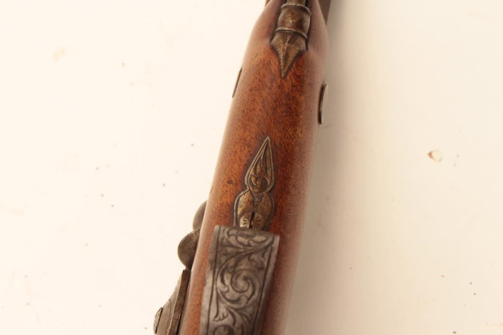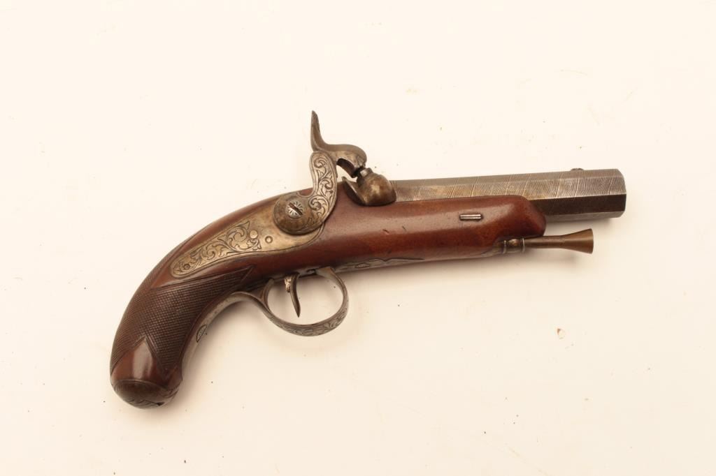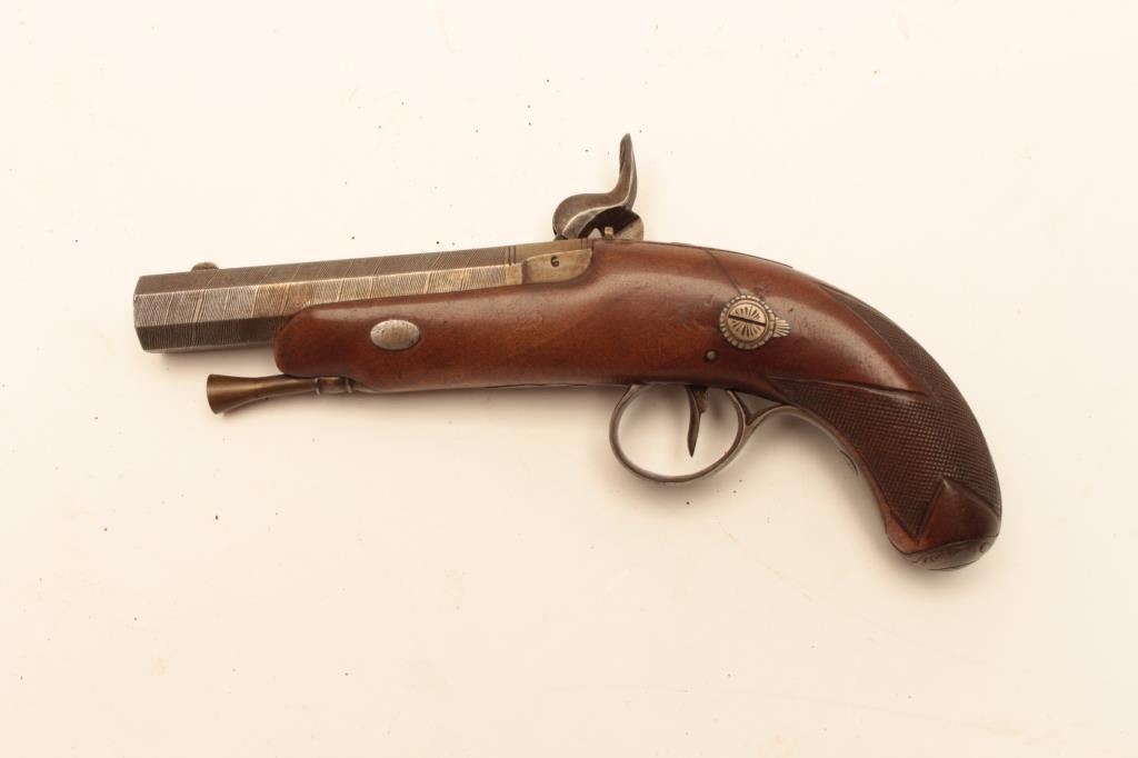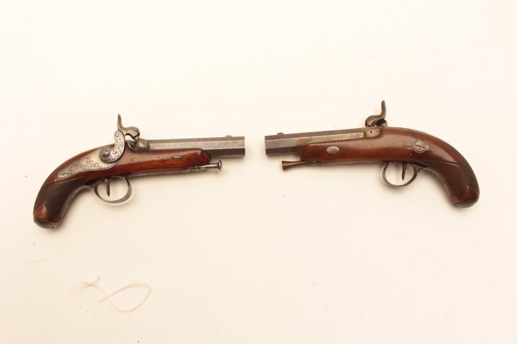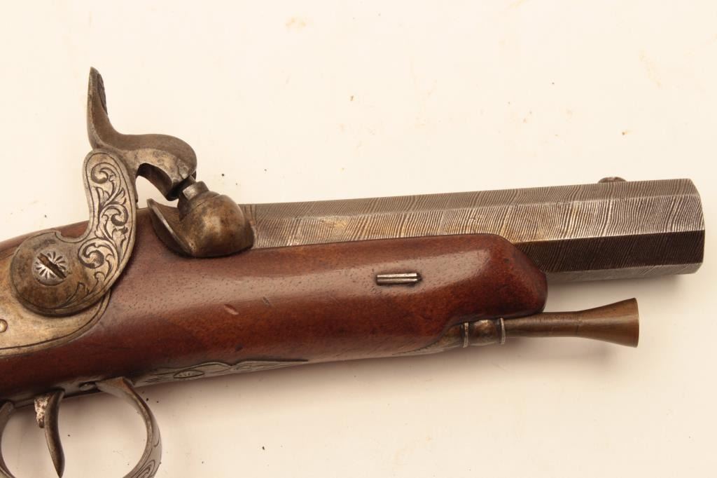 Pair of Central European percussion pocket pistol circa 1860 with 3 ½” octagon barrel of .45 caliber rifled. ¾” stocked with checkered butts. Lightly engraved locks and hammer with Damascus patterned barrel. Cap Lot Title box in butt’s and original ramrods. French or Belgium origin but no name or proofs visible. (Antique) Est.: $600-$1200