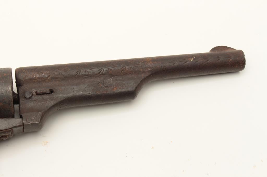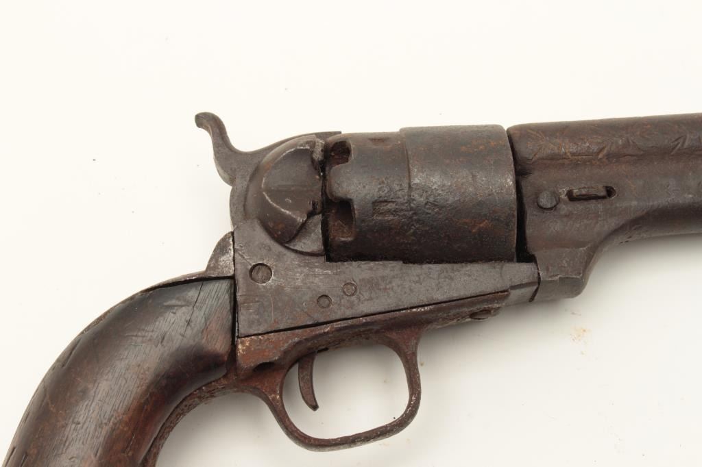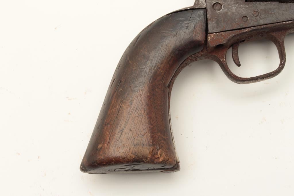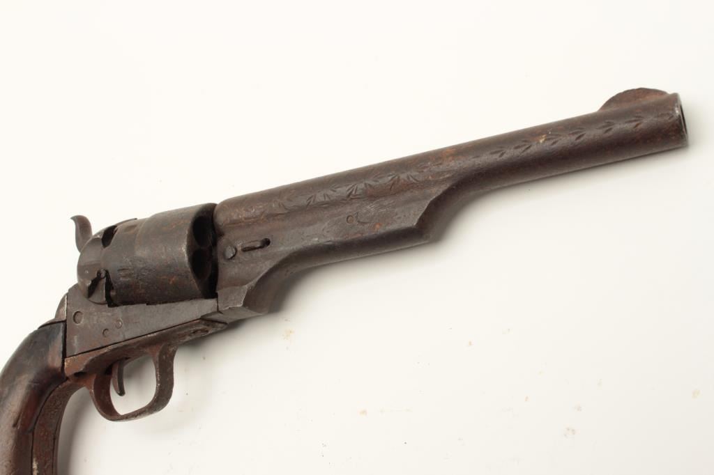Rusty relic Colt Model 1860 Army percussion revolver with engraved Merwin & Hulbert replacement barrel assembly; S/N 33691; wood grips; appears to be a period frontier conversion. From the collection of John O. Lot Title Beckwith. Est.: $200-$400.