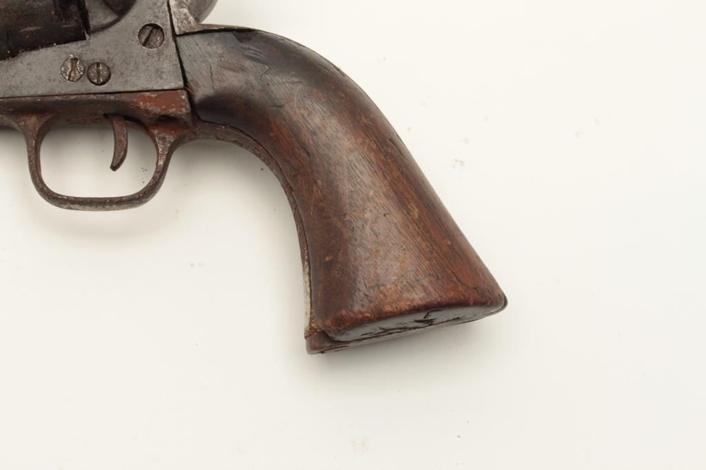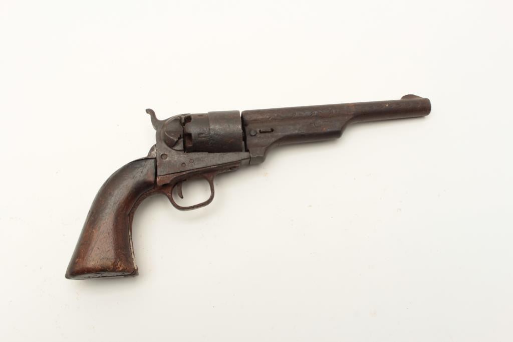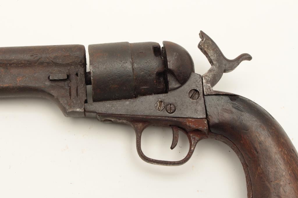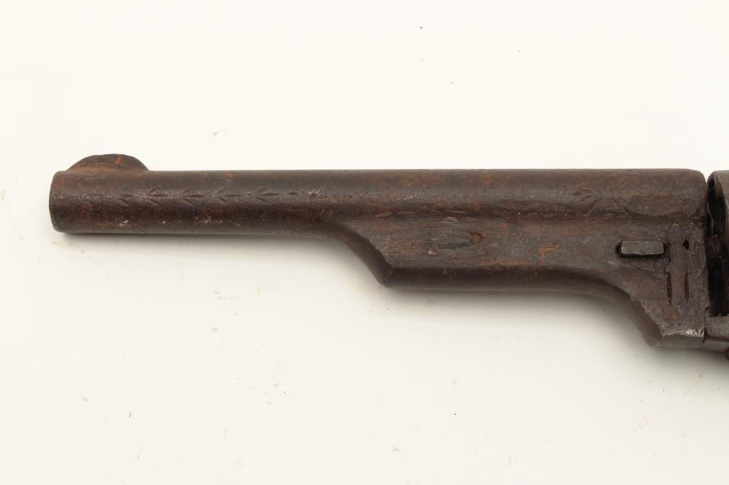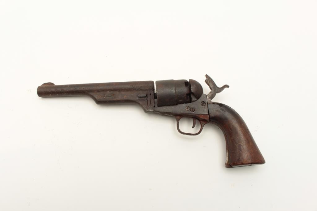 Rusty relic Colt Model 1860 Army percussion revolver with engraved Merwin & Hulbert replacement barrel assembly; S/N 33691; wood grips; appears to be a period frontier conversion. From the collection of John O. Lot Title Beckwith. Est.: $200-$400.