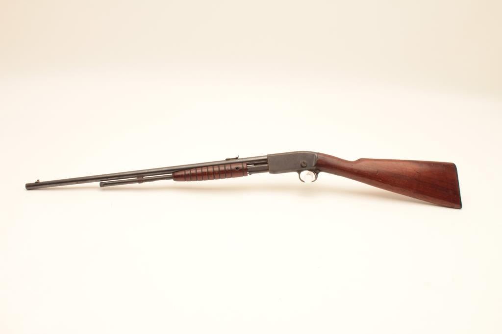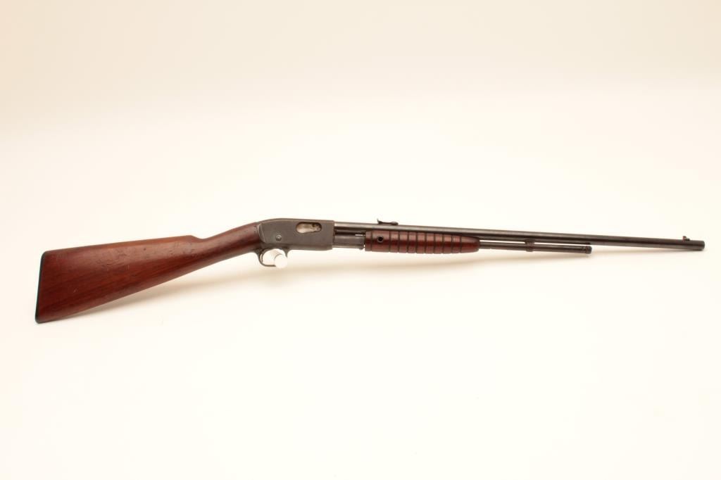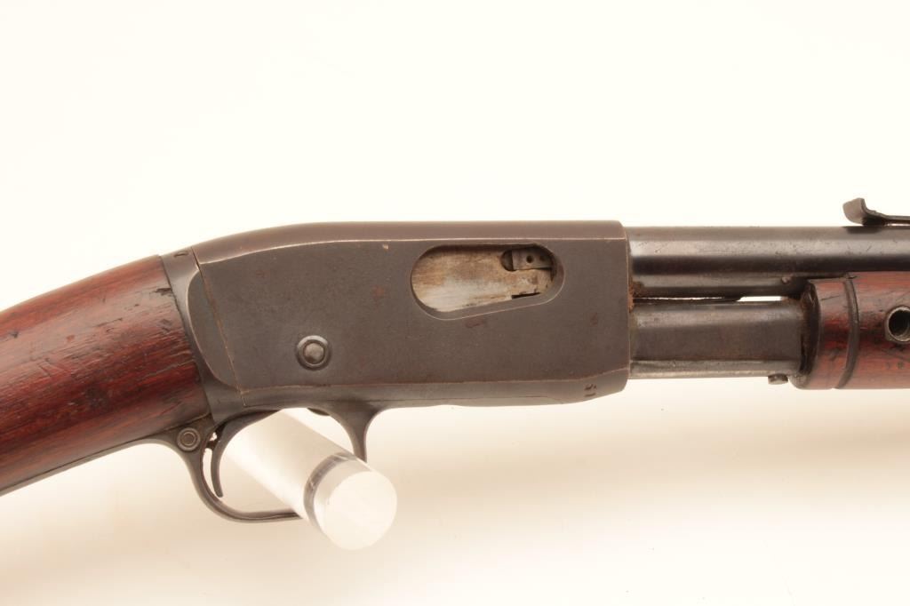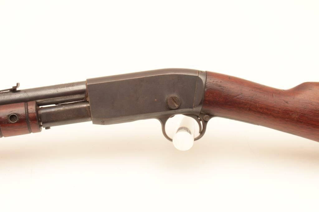 Remington Model 12-A pump rifle, #596020, 22 cal., 22 " barrel, blued finish with walnut stock. Overall good condition. (C&R / PPT) Est. $100-200