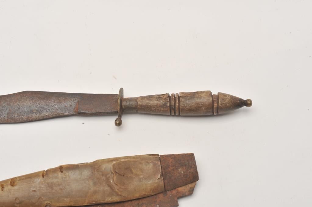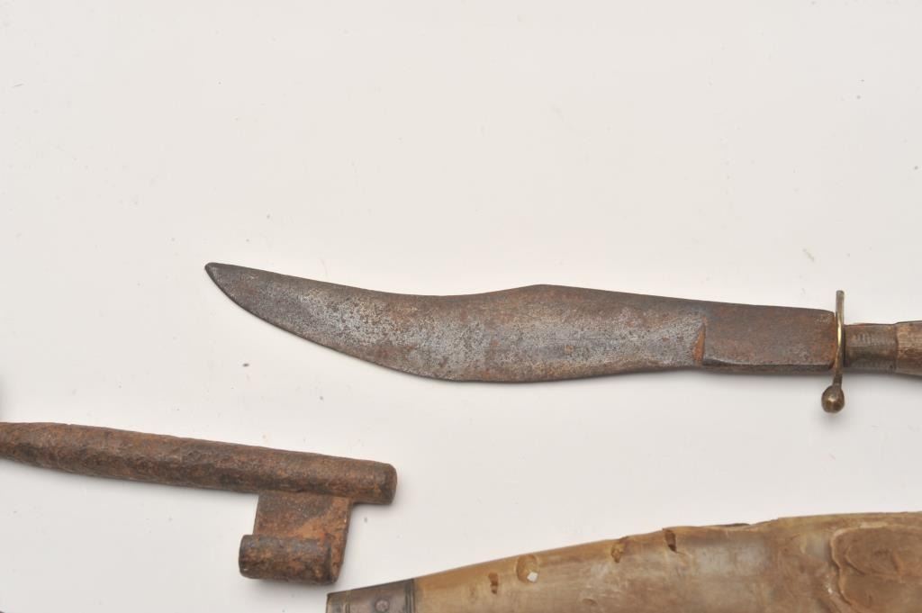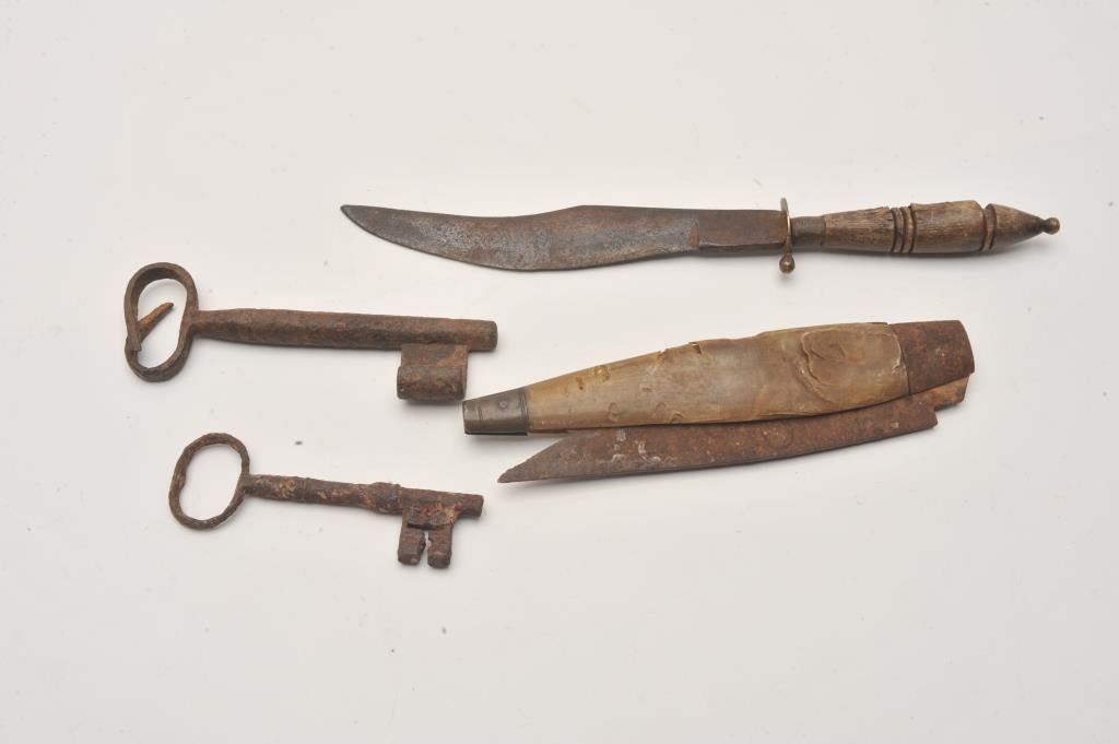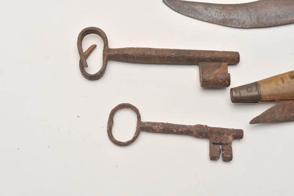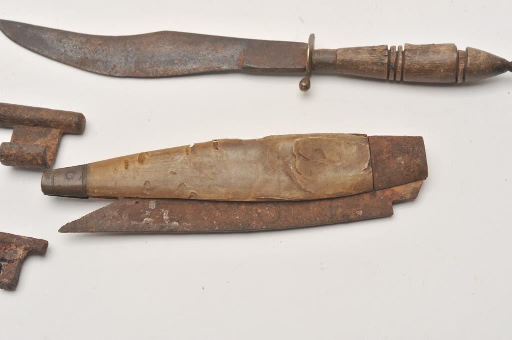 Lot of 4 rusty relics including a large sailor’s clasp folding knife, approximately 7.5” when closed, with horn scales; a Mexican or South American clip point knife, approximately 11” overall with a wood grip Lot Title and two old iron keys, one marked with a tag “Jail Cell key”. From the collection of John O. Beckwith. Est.: $150-$250.