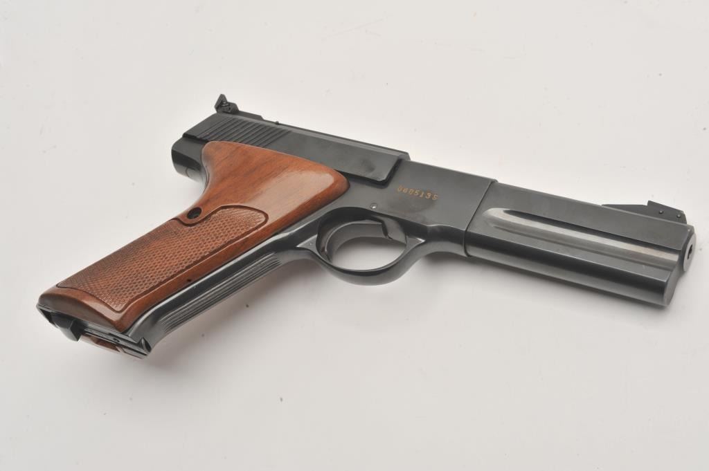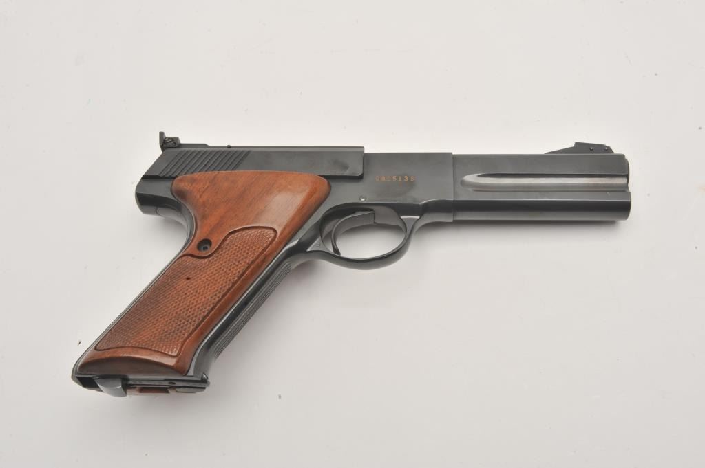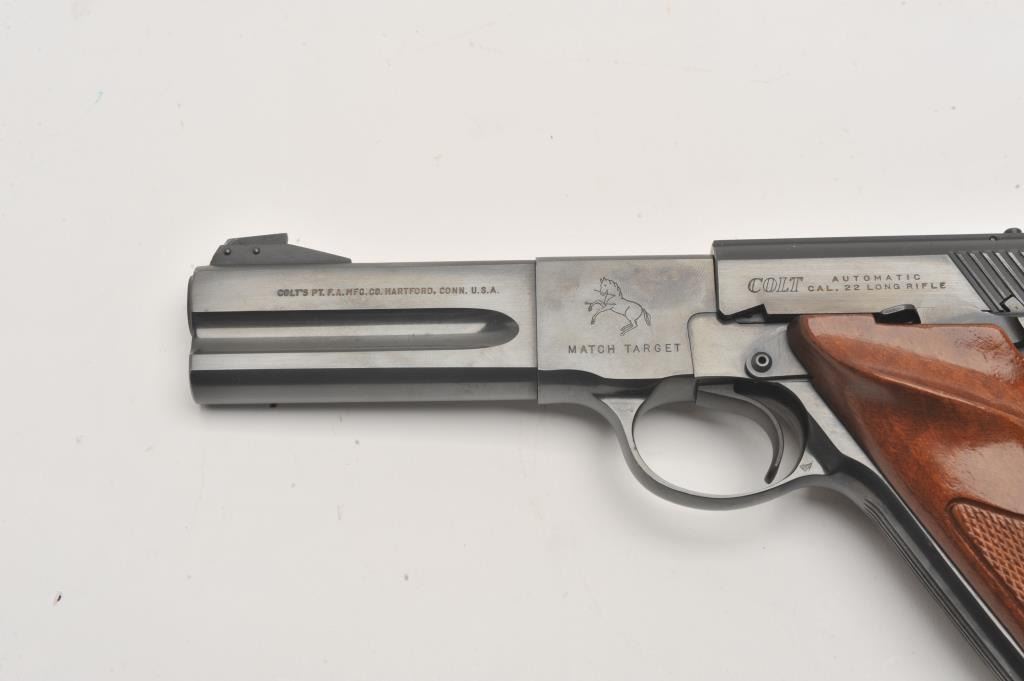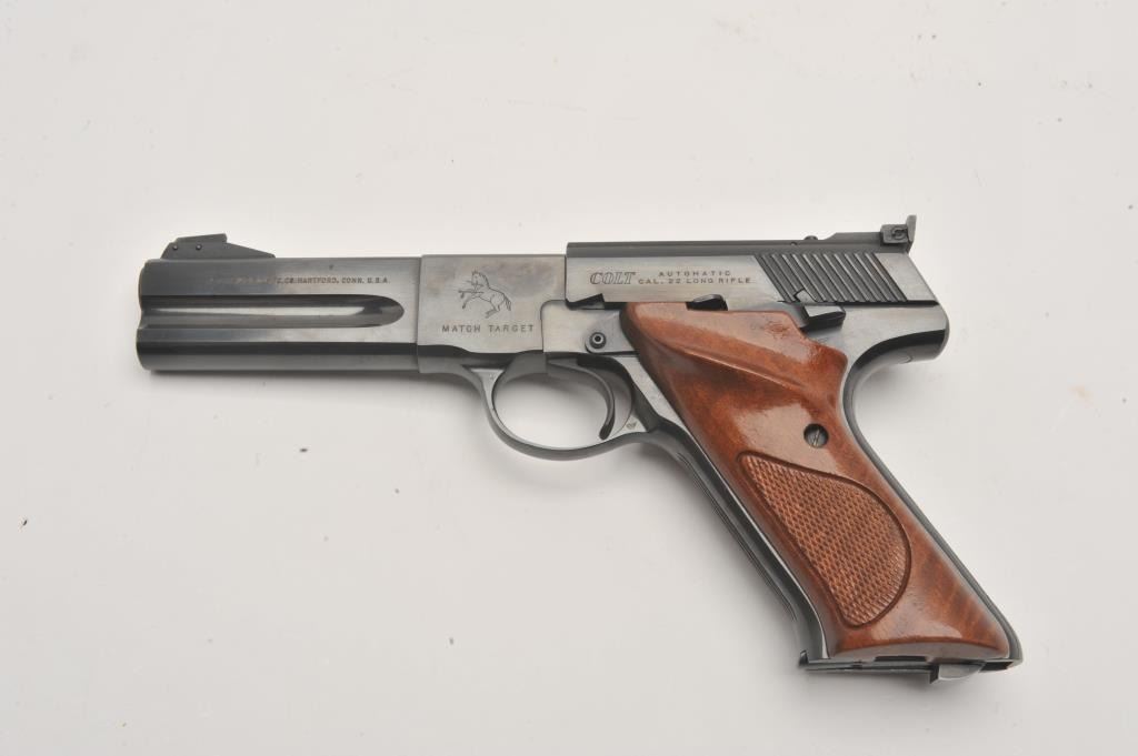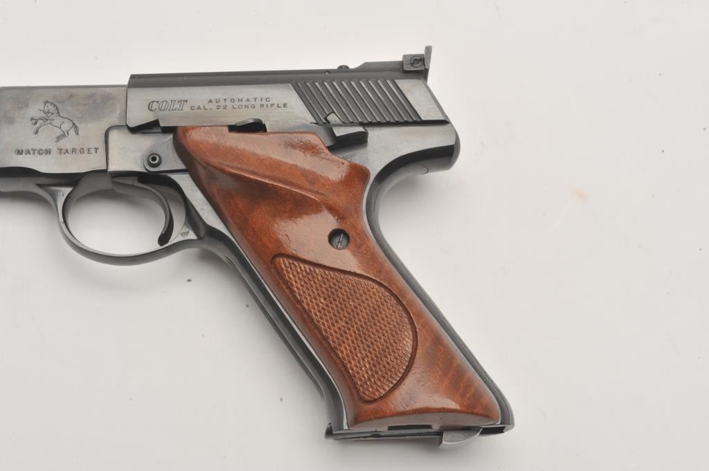 Colt Woodsman Match Target, #088513S, 22 LR cal., 4 1/2" barrel, adjustable sights, checkered wood grips. Near fine condition, hard to find 4" Match Target, very desirable! One mag. (C&R / PPT) Est. $700-1400