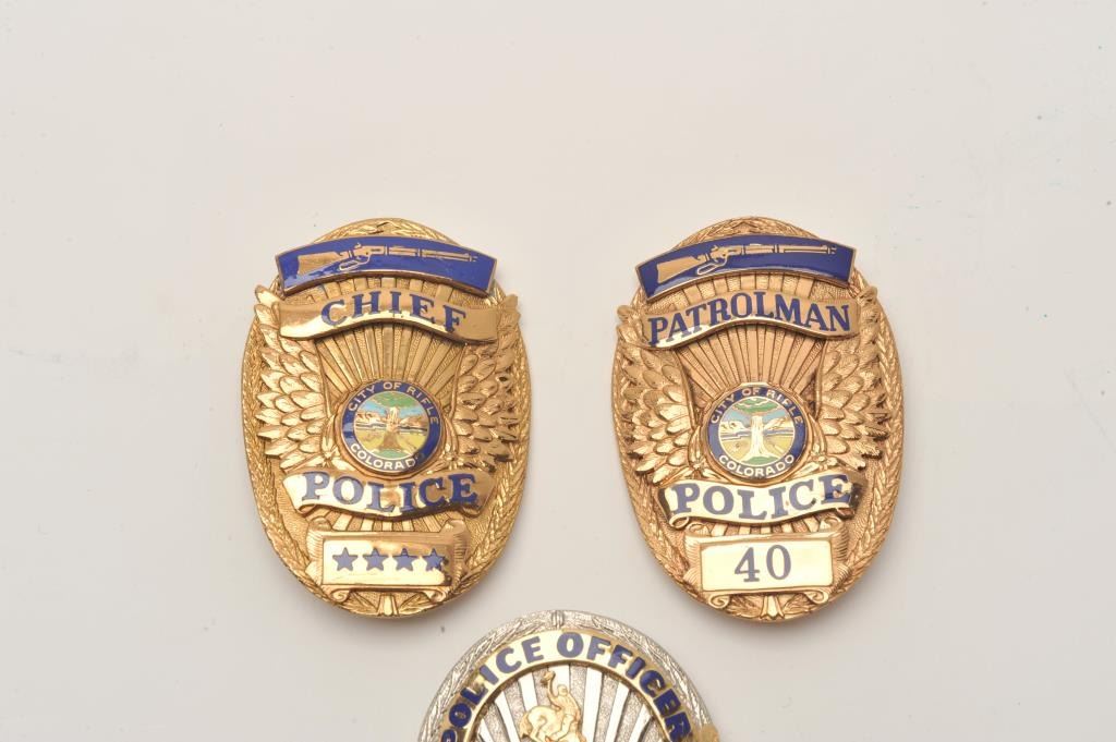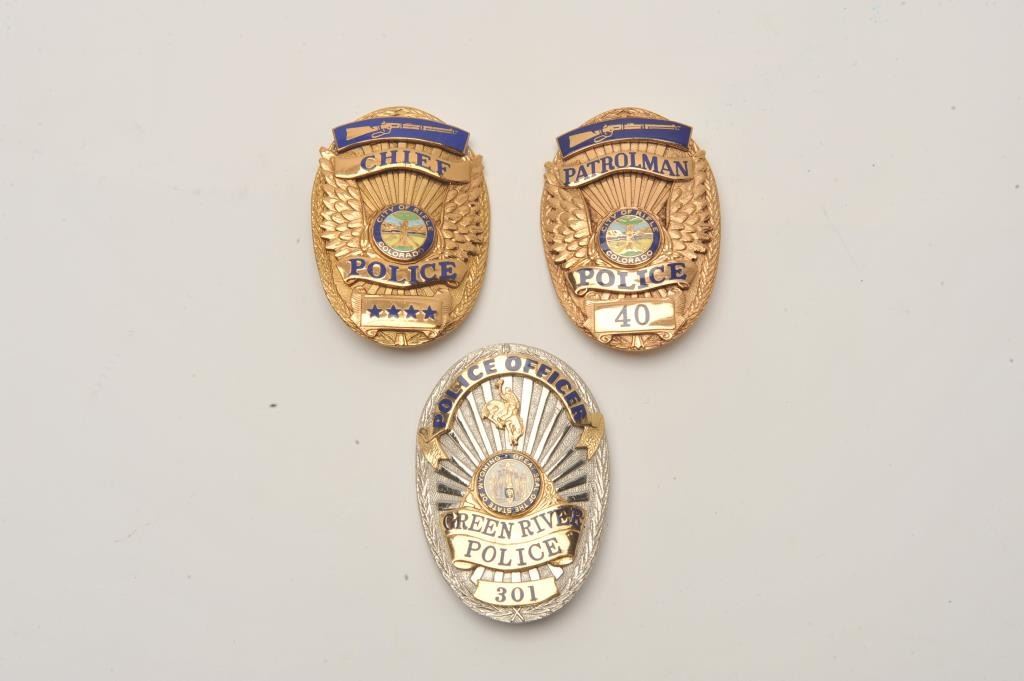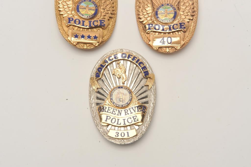 Lot of 3 badges including a Green River (Wyoming) Police Officer (hallmark Sun Badge Co./San Dimas, CA) and two Rifle (Colorado) Police badges including a Chief’s badge and a Patrolman’s badge (both hallmarked “BNB Lot Title Phoenix, AZ”). Est.: $150-$300.