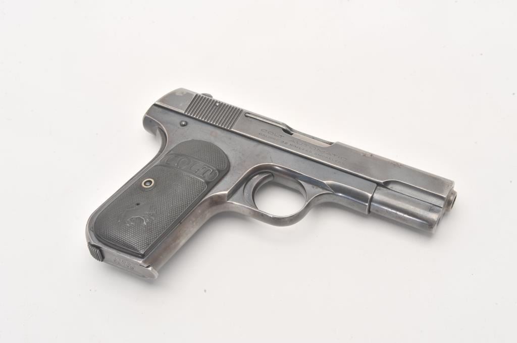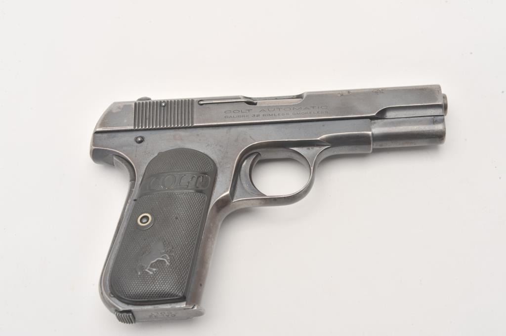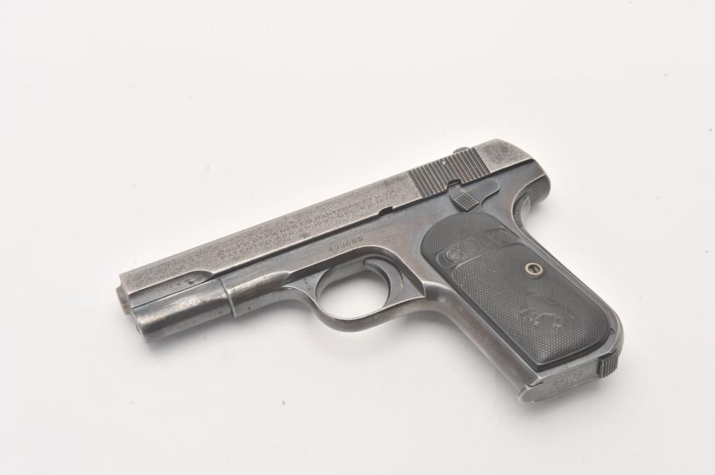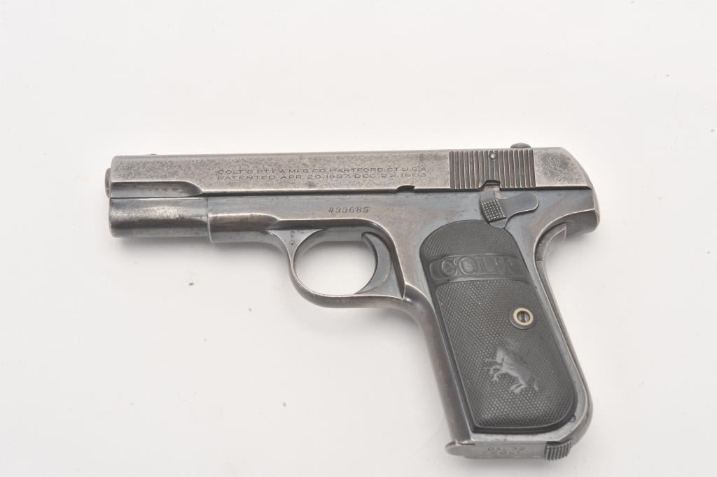 Colt Model 1903 .32 ACP caliber Semi-Auto pistol with blued finish and hard rubber grips, S/N 433685. 50%-70% original blue with even loss of finish and minor pitting and erosion. The grips are good with edge wear. Lot Title Good action and good bore. (C&R/PPT) Est.: $250-$500