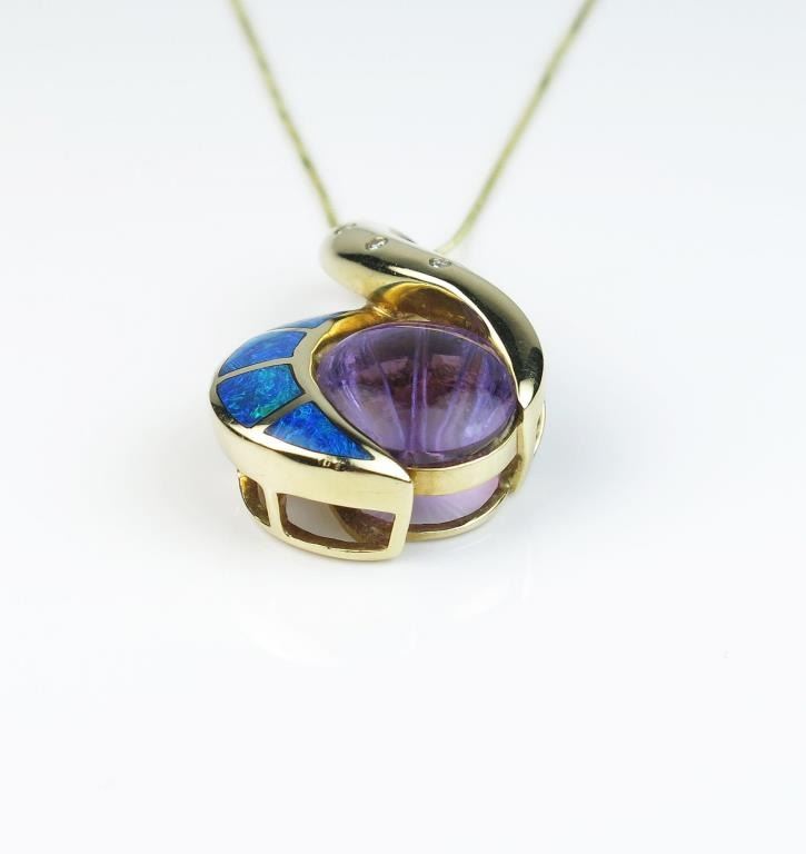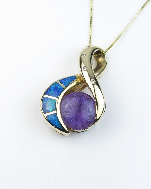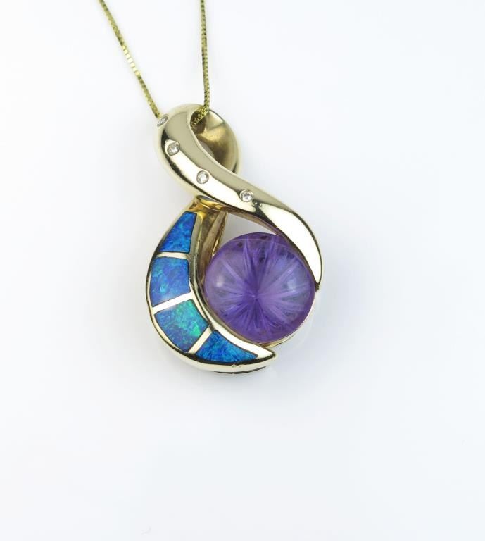 Vibrant Black Opal, Amethyst and Diamond Pendant featuring fine quality inlayed Black Opal with intense flashes of blue and green accenting a unique starburst fantasy cut Amethyst. Hand crafted in 14 karat yellow Lot Title gold. Retail $2,500-$3,000 Estimate $1,200-$1,600
