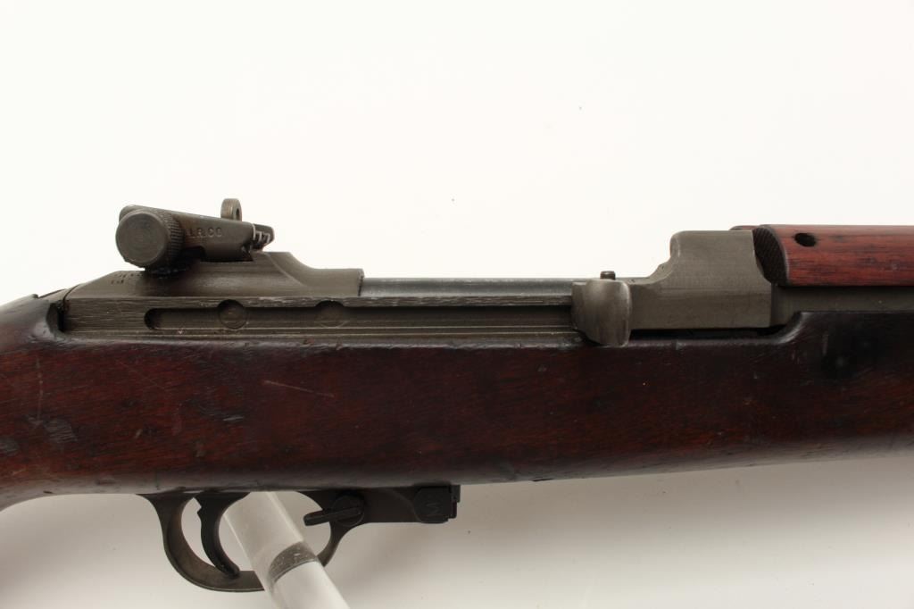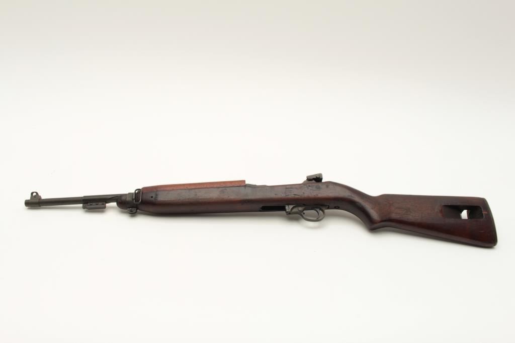 Inland U.S. Carbine Model M1, .30 caliber, Serial #6240253. The carbine is in good overall condition with an 18” Inland marked barrel dated 9-44. The metal surfaces retain the majority of their military finish with Lot Title wear at the muzzle. The smooth wood stock is in good condition showing considerable wear with mars and compressions. There are two cartouches on the rights side including the crossed cannons and the butt ends with a Lot Title checkered steel butt plate. The bore is good, the action crisp and markings are sharp. Est.: $600-$1,200. (C+R).