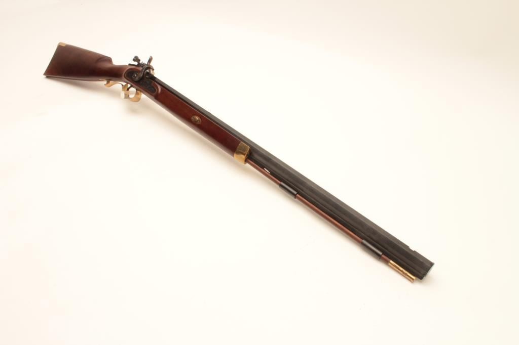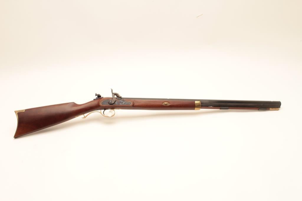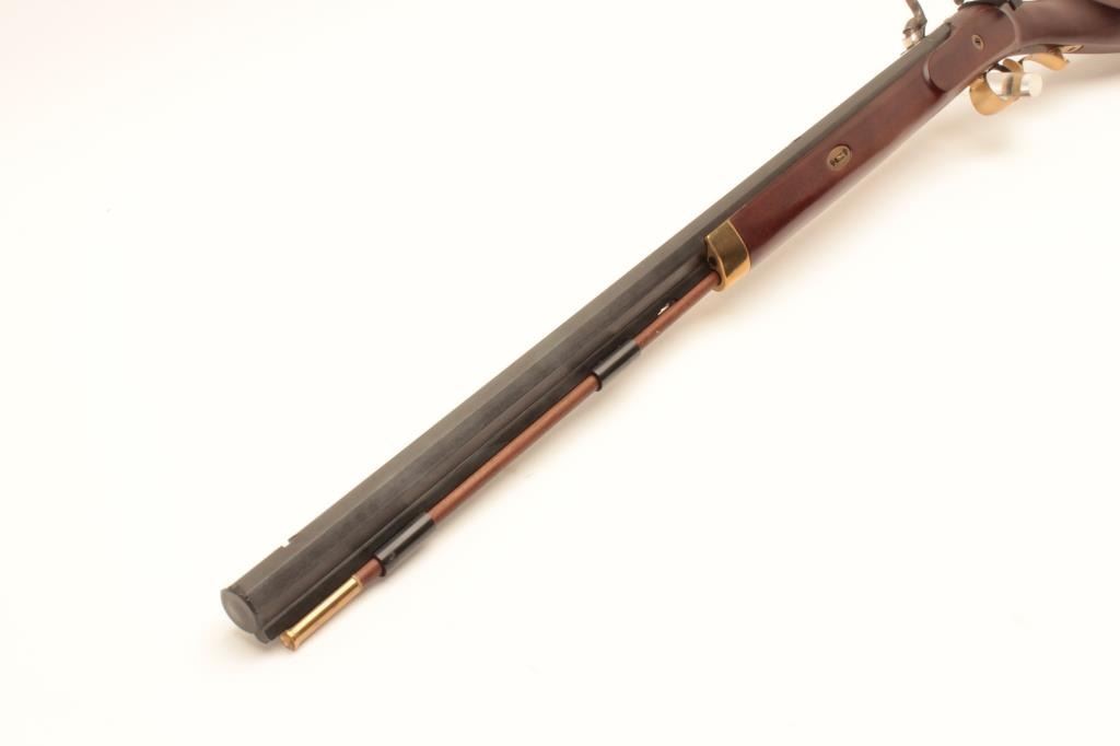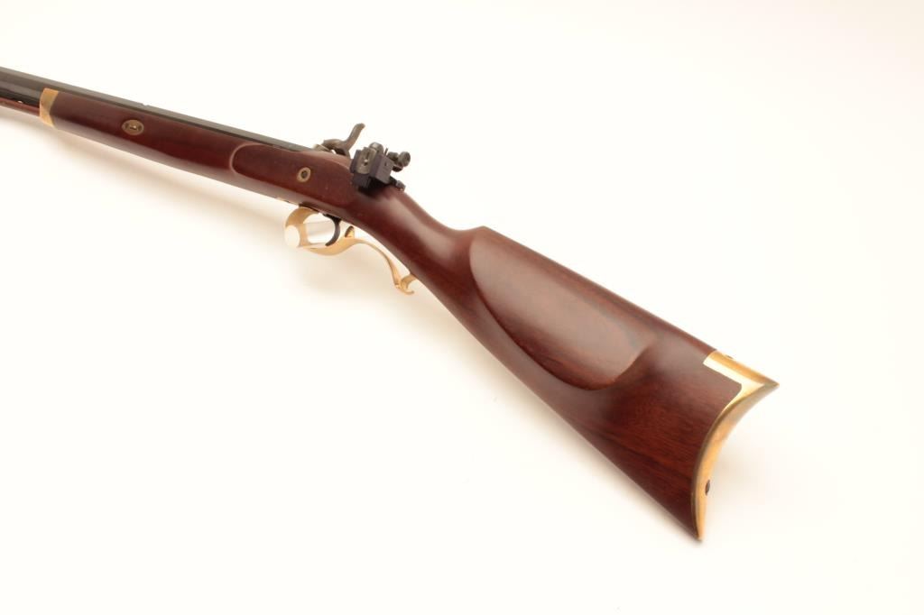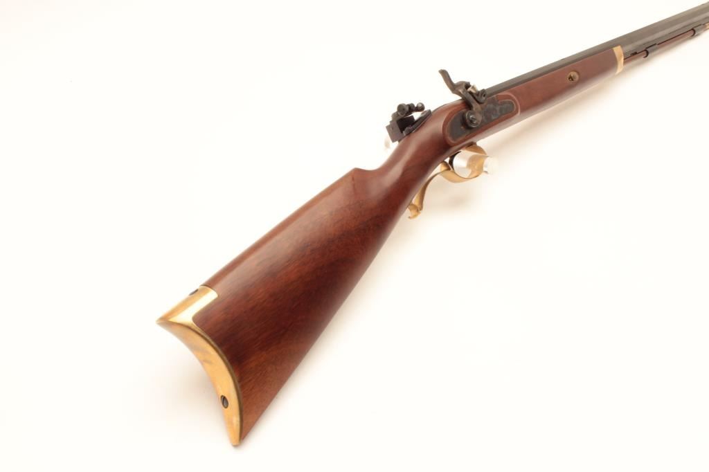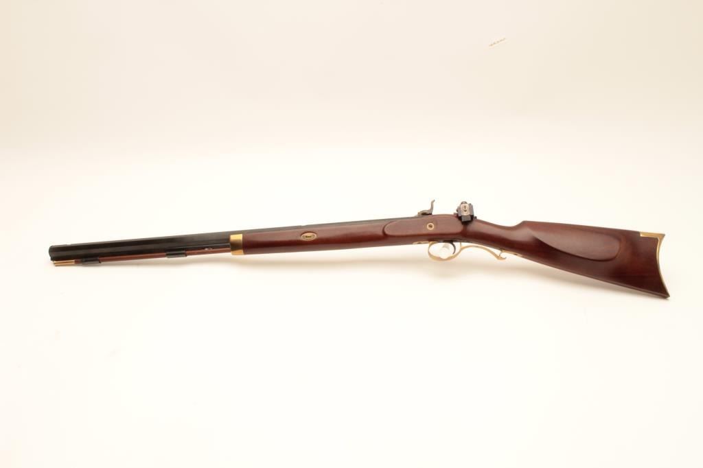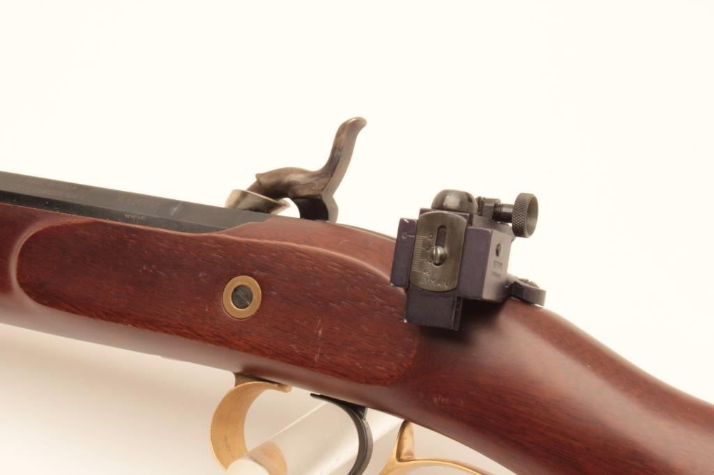 Lyman modern blackpowder percussion half stock “Trade Gun”, .50 caliber, 28” octagon barrel, blued and case hardened finish, brass mounted, single trigger, adjustable Lyman tang sight (no other sights); wood stock, S/N Lot Title A498606, in overall fine condition. (Percussion). Est.: $250-$500.