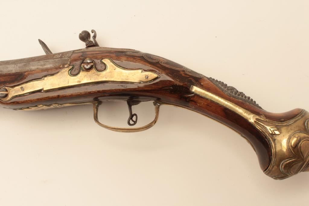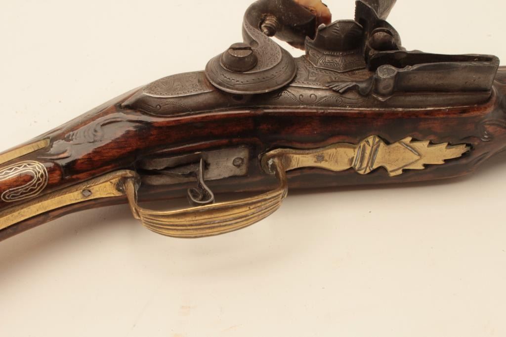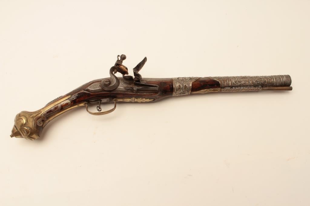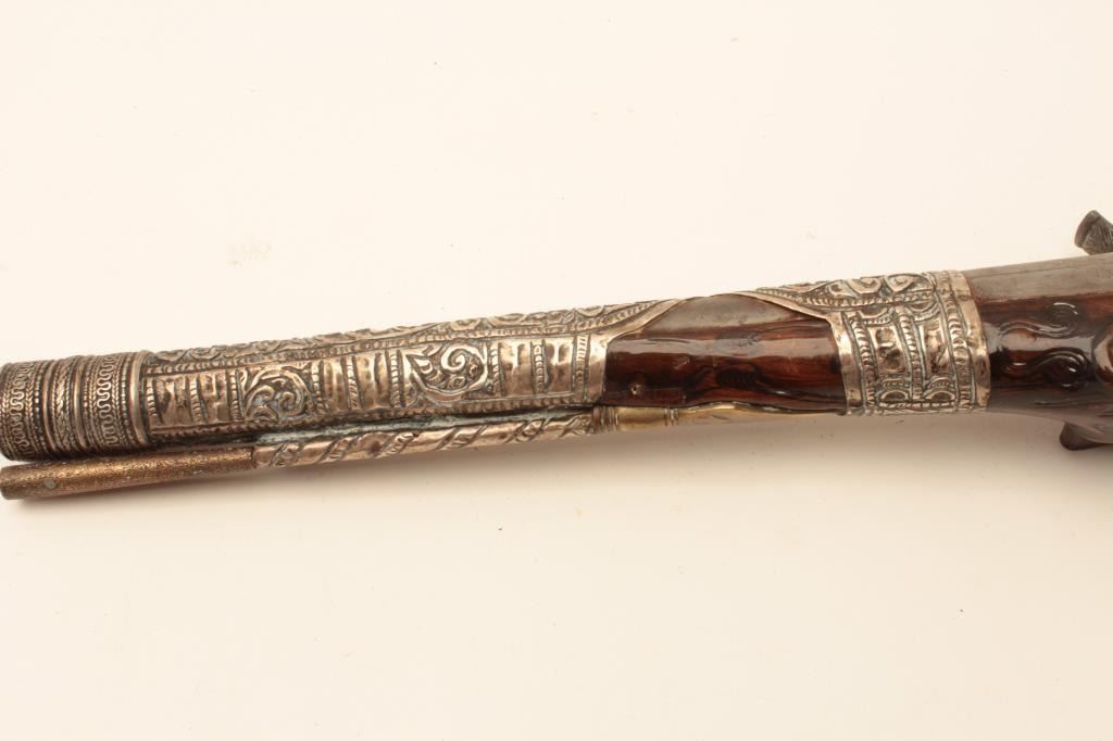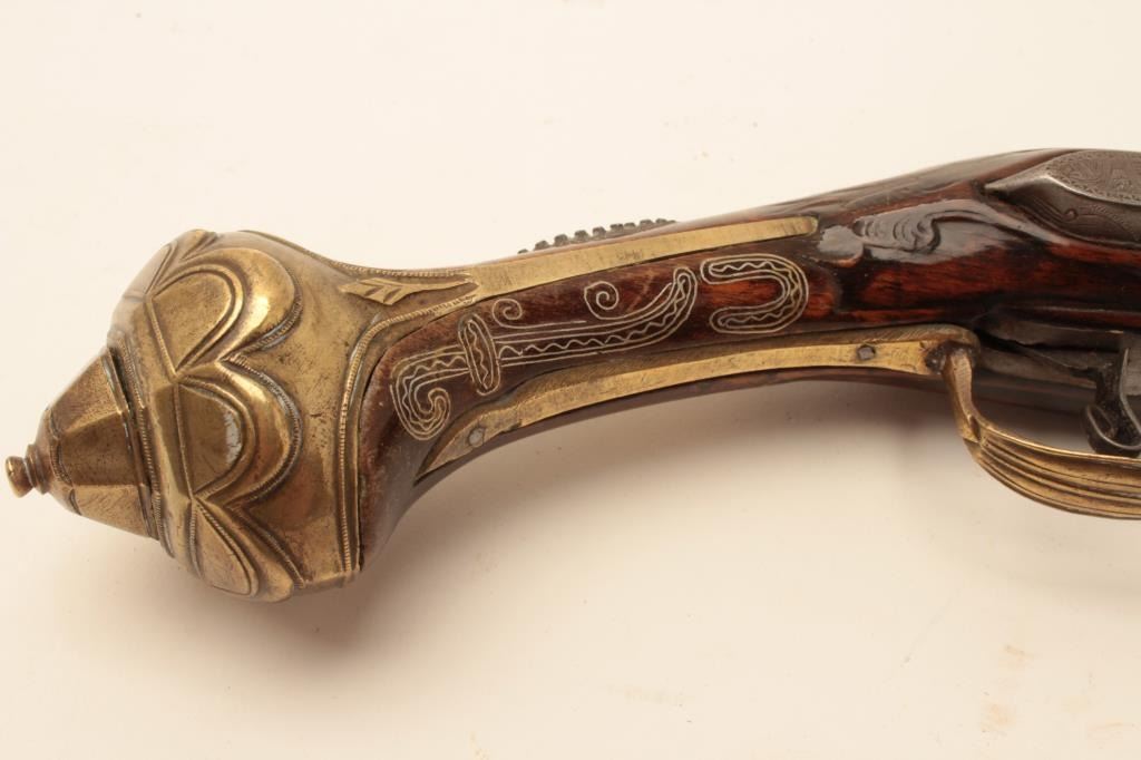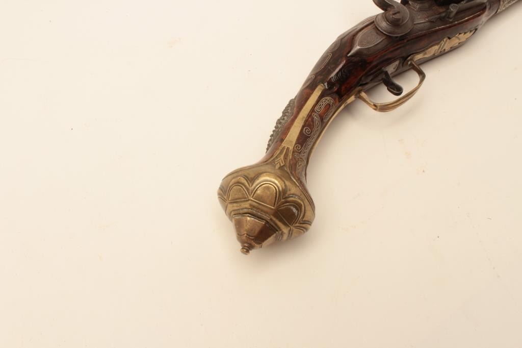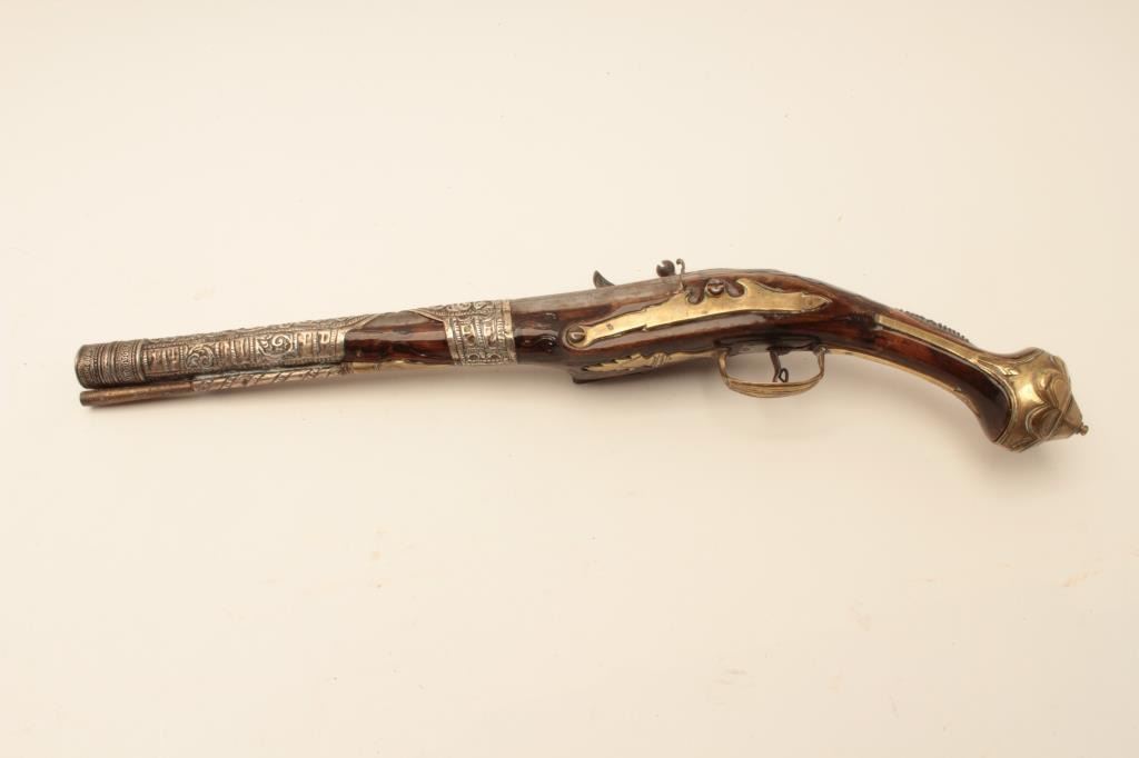 Genuine antique Mid-Eastern flintlock pistol circa 19th century. Silver inlays, mounts with brass and silver. Very good quality early lock. Old San Diego collection. Condition is very good plus. Measures 19 ½” Lot Title overall. Est.: $350-$700