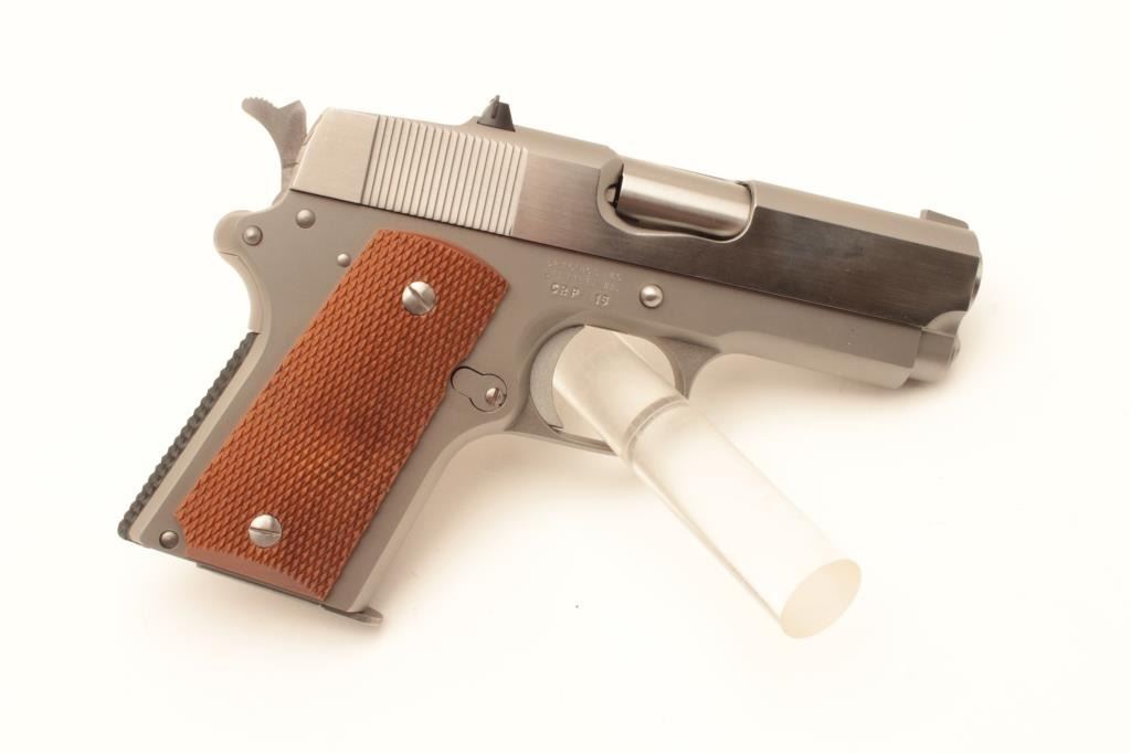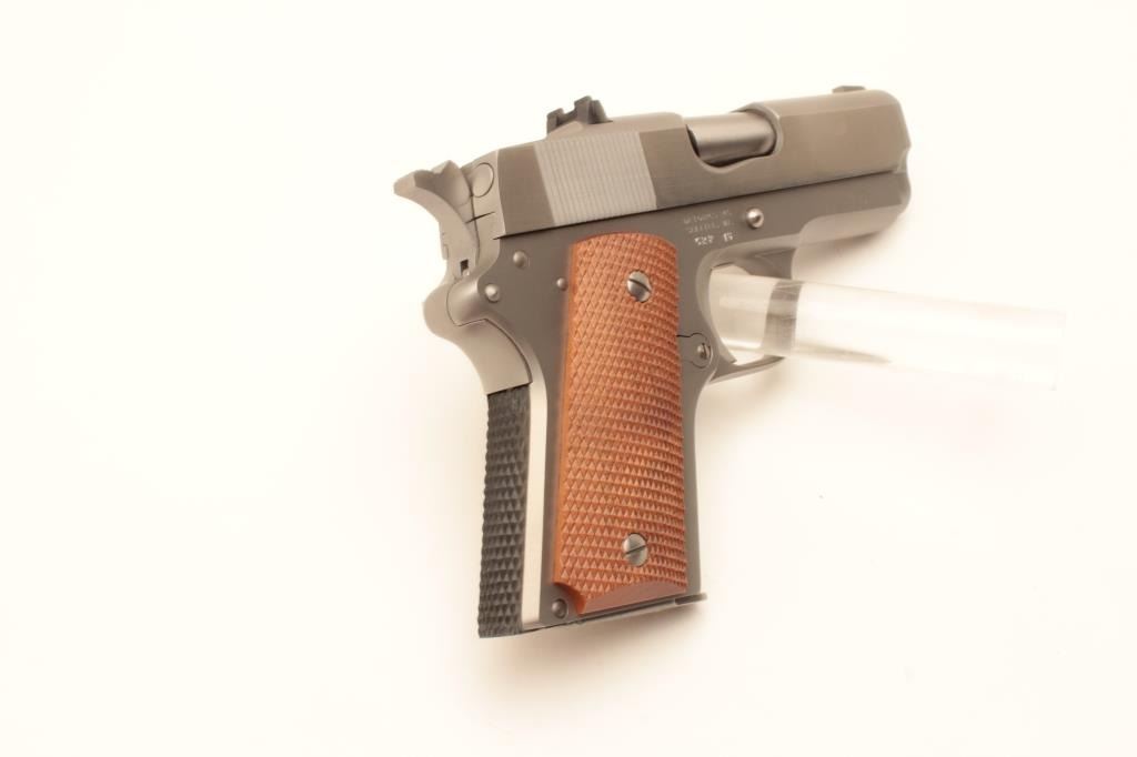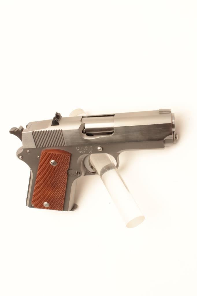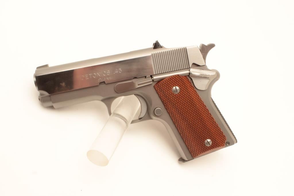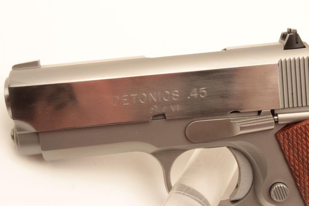 Detonics .45 MK VI semi-automatic pistol, .45 caliber, Serial #CRP16. The pistol is in fine overall condition with a 3 ¼” barrel with a ramp front and fixed rear sights. The slide is polished stainless, while the frame Lot Title is completed in a matte finish. Both show only light handling marks. The checkered wood grips are in very good condition with only light storage marks noted and a checkered rubber grip strap. The bore is Lot Title very good, the action is crisp. The lot includes one correct magazine and a Detonics marked vinyl pistol rug. Est.: $600-$1,200. (Modern).
