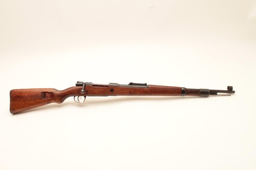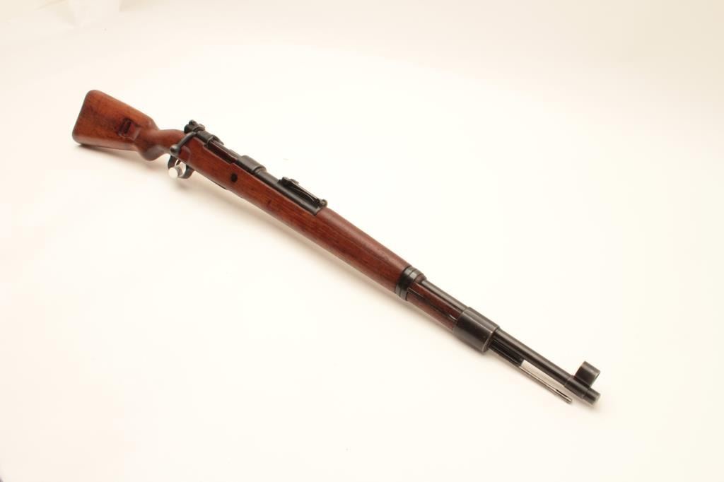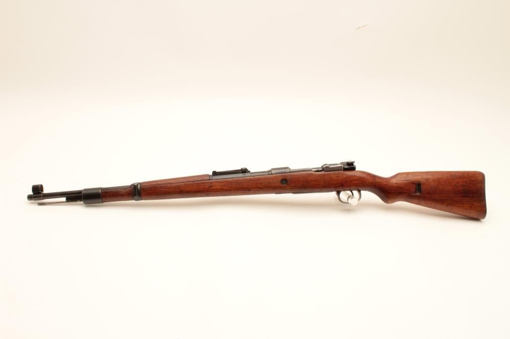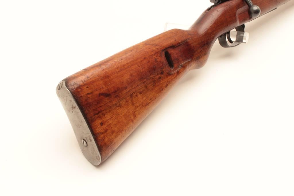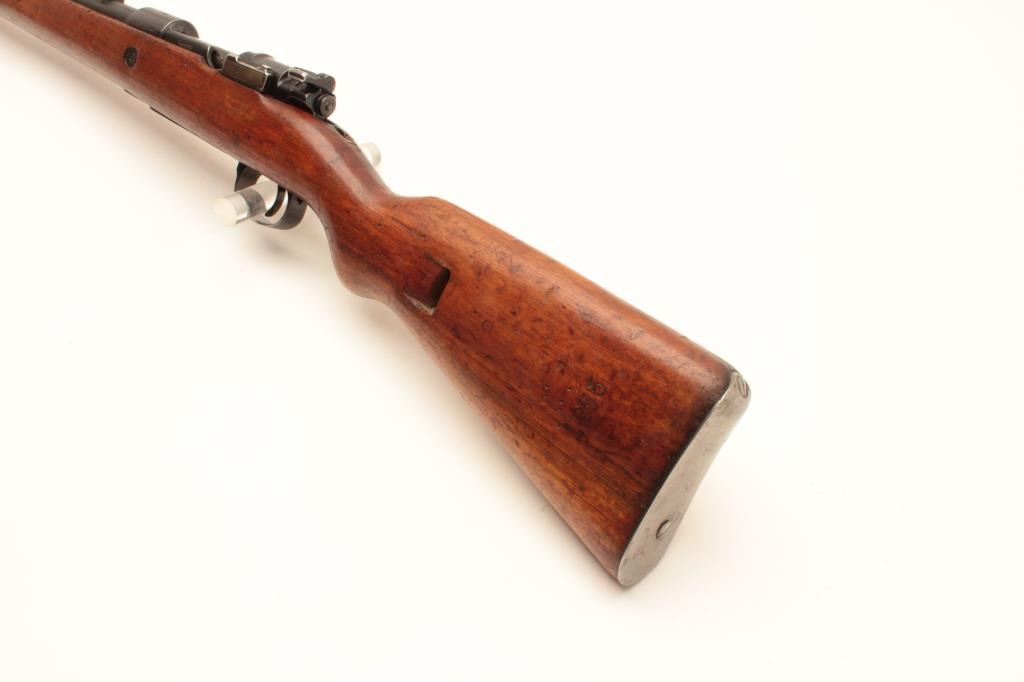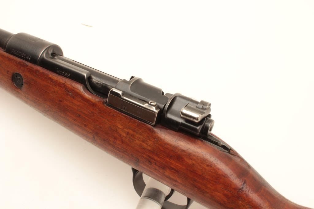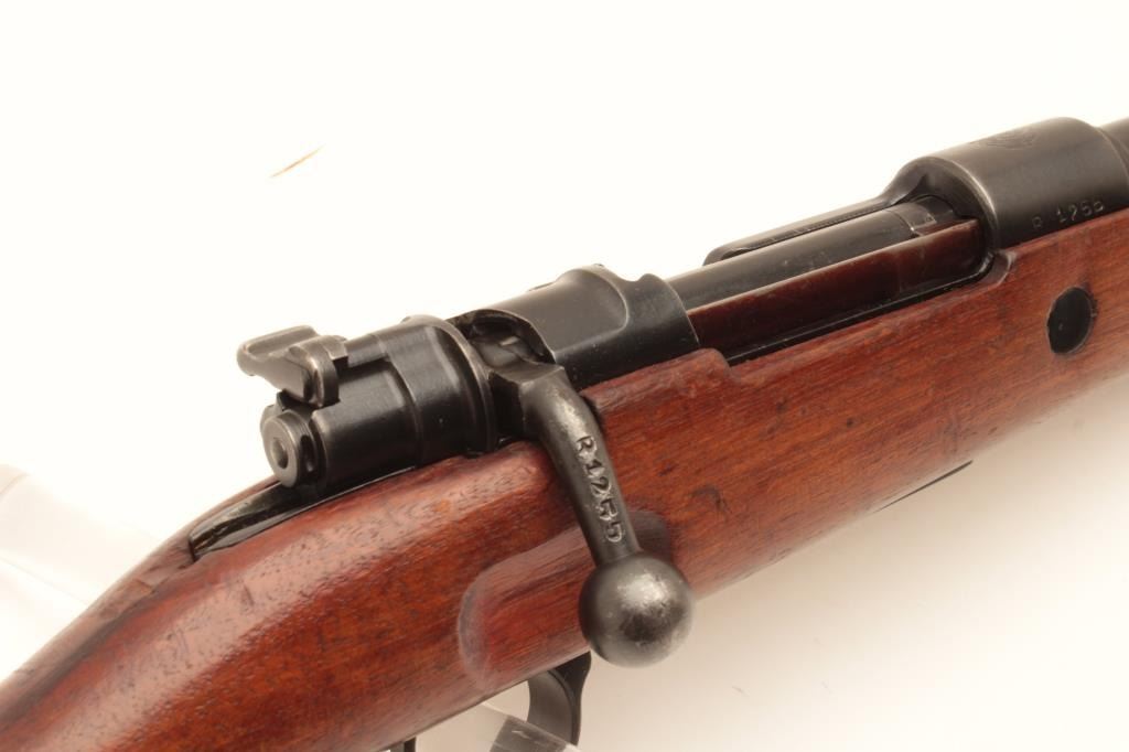 Yugoslavian K98 bolt action rifle, 8mm caliber, Serial #R1255. The rifle is in very good overall condition with a 24” import marked barrel with a hooded front and military tangent style rear sights. The Lot Title metal surfaces retain a significant amount of their blue finish wear at the muzzle. The front ring features the Yugoslavian crest and is marked, “PREDUZECE 44”. All visible serial numbers are matching, including the Lot Title butt stock. The smooth wood stock is in good condition with small mars and compressions consistent with service use and cartouches behind the trigger guard. The butt stock ends with a smooth, steel butt plate. The Lot Title bore is good, the action crisp and markings are sharp. Est.: $200-$400. (C+R).
