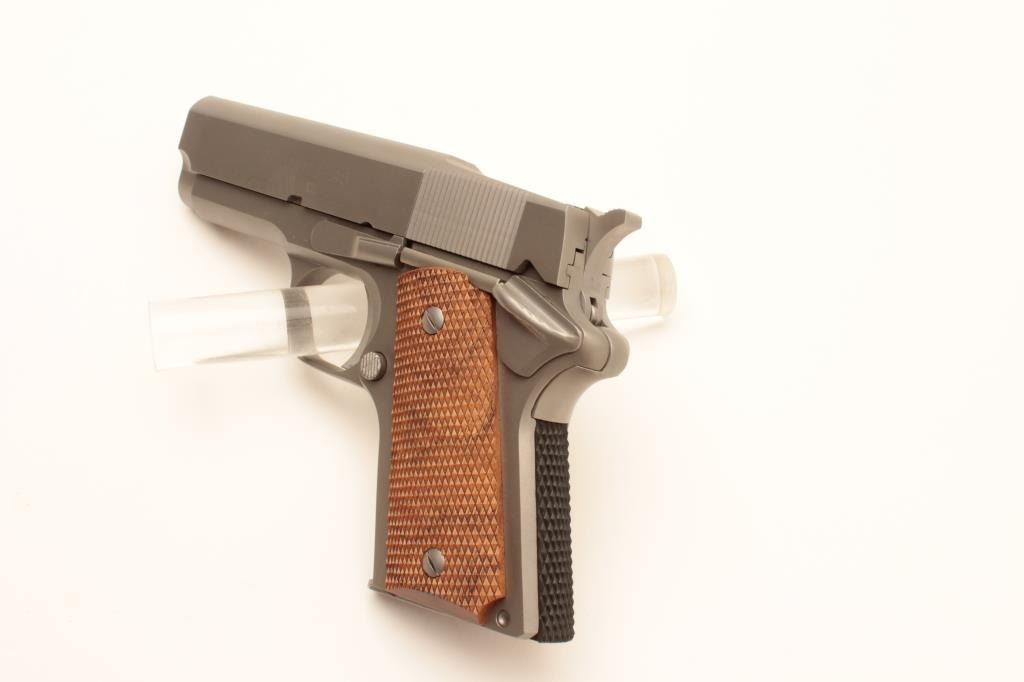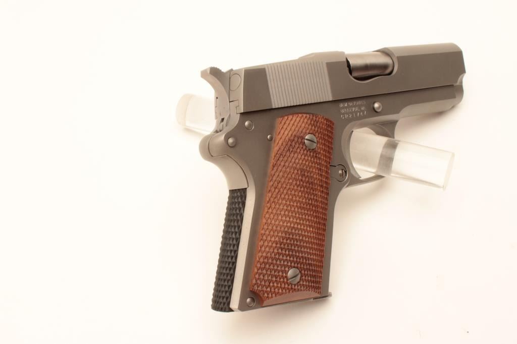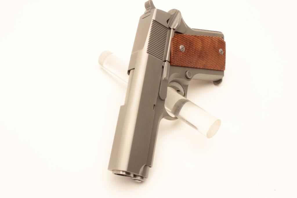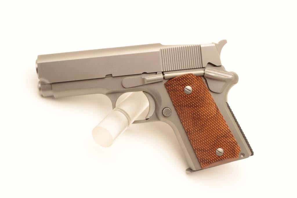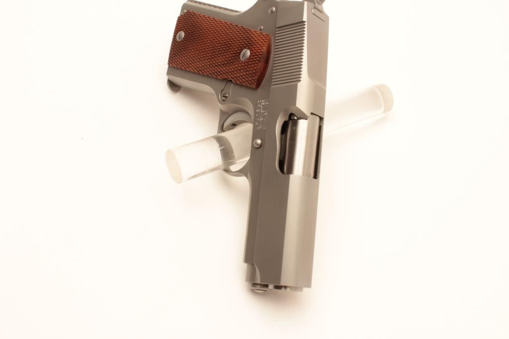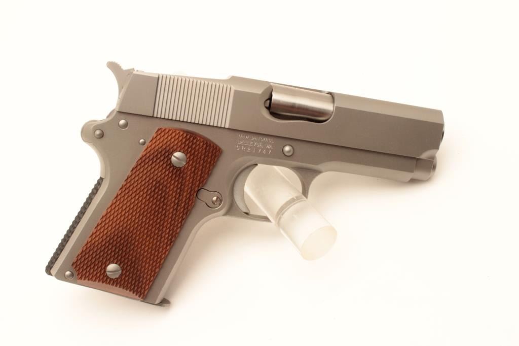 Detonics .45 MK VII semi-automatic pistol, .45 caliber, Serial #CR21747. The pistol is in fine overall condition with a 3 ¼” barrel with no sights. The pistol retains nearly all of its matte stainless finish. The Lot Title checkered wood grips are in very good condition with only light storage marks noted and a checkered rubber grip strap. The bore is very good, the action is crisp. The lot includes one correct magazine and a Detonics Lot Title marked vinyl pistol rug. Est.: $600-$1,200. (Modern).