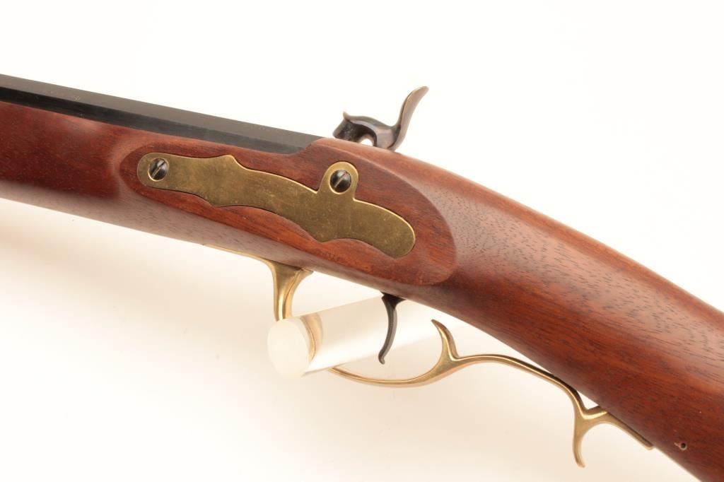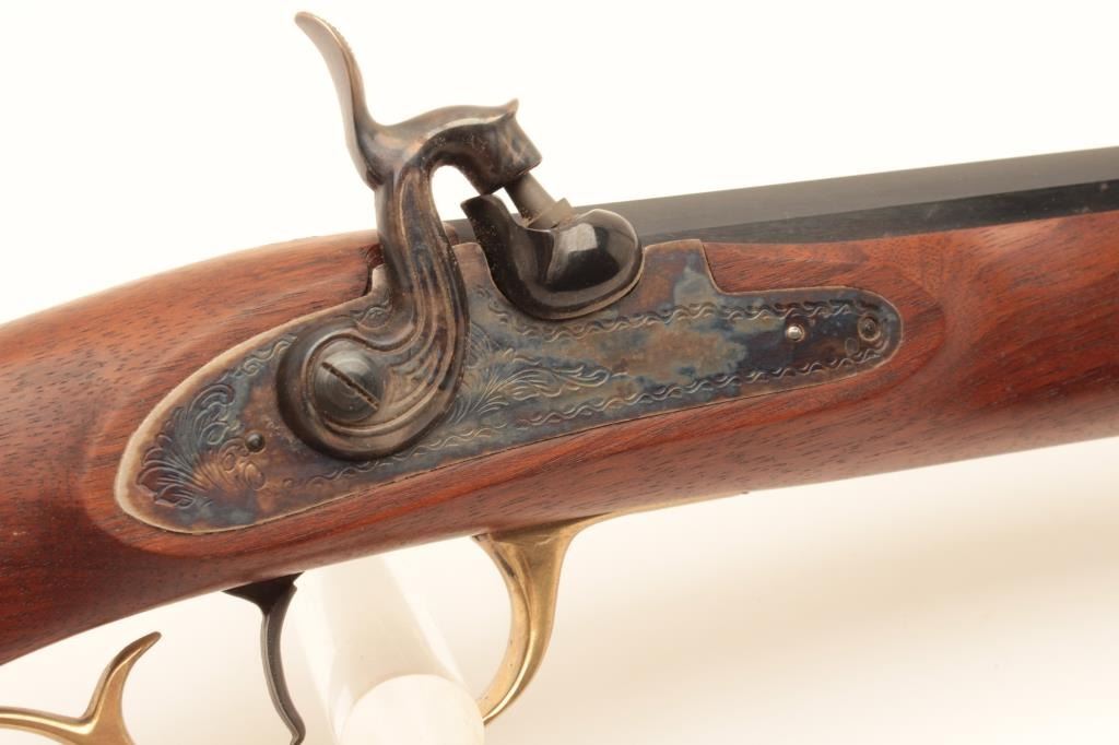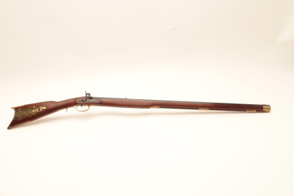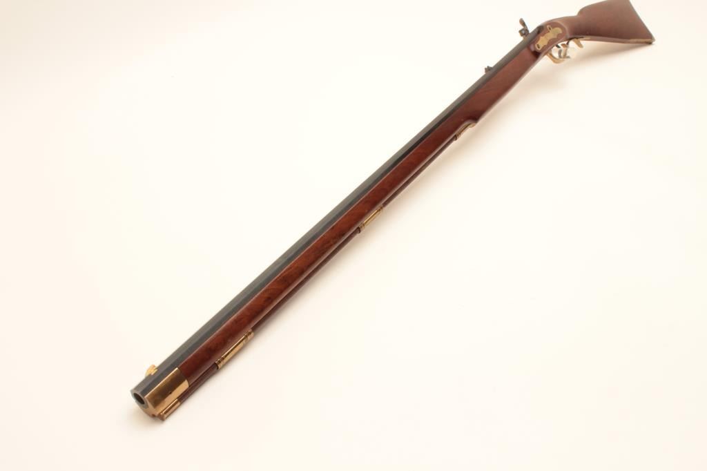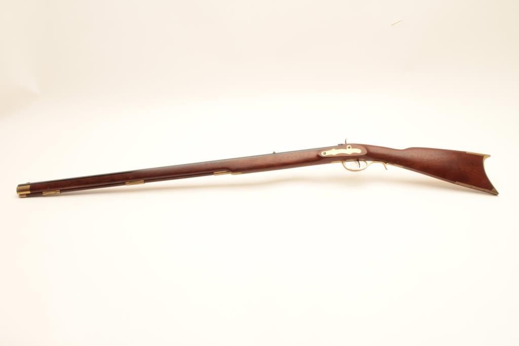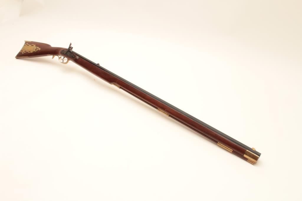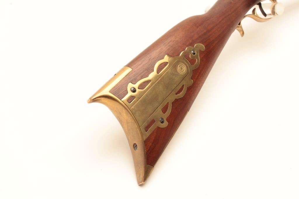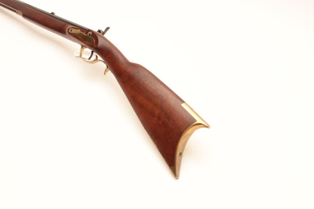 Reproduction full stock Kentucky black powder rifle by Armi Sport, .50 caliber, Serial #53829. The rifle is in very good overall condition with a 35” octagon barrel. The barrel retains the majority of its blue Lot Title finish with only handling marks. The rifle features a full-length wood ramrod with brass tip and brass trigger guard, patch box and butt plate. The smooth wood stock is in very good condition with light storage marks. Lot Title Est.: $150-$300.