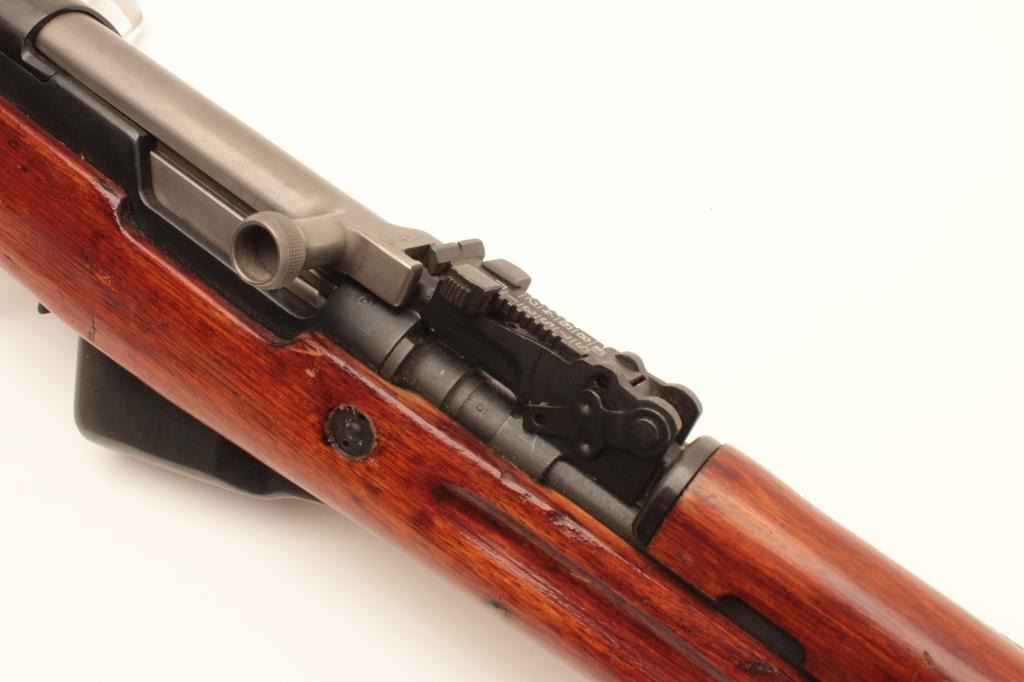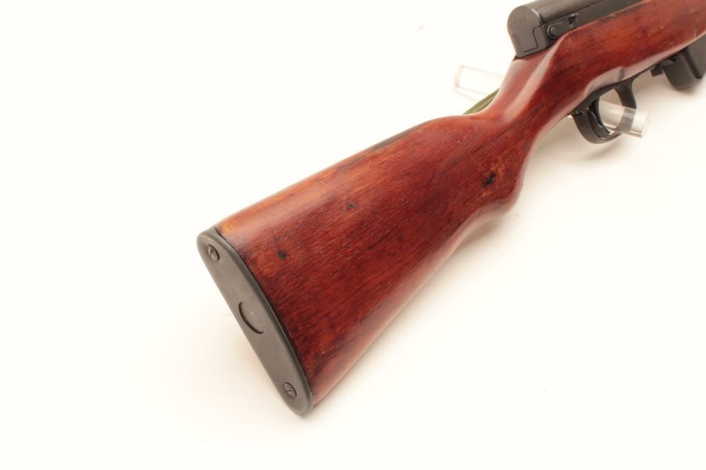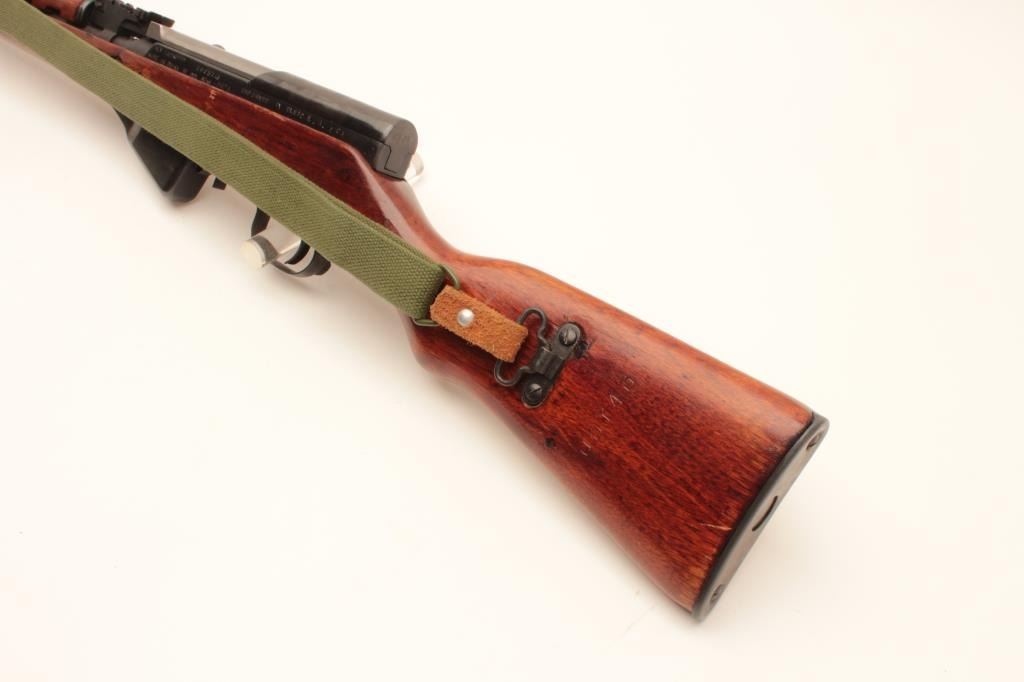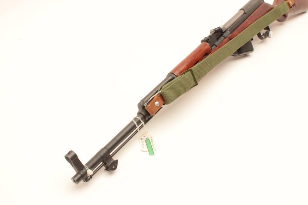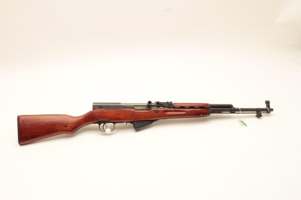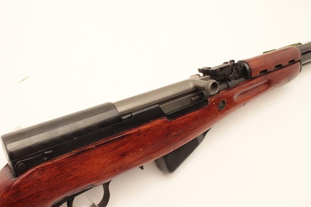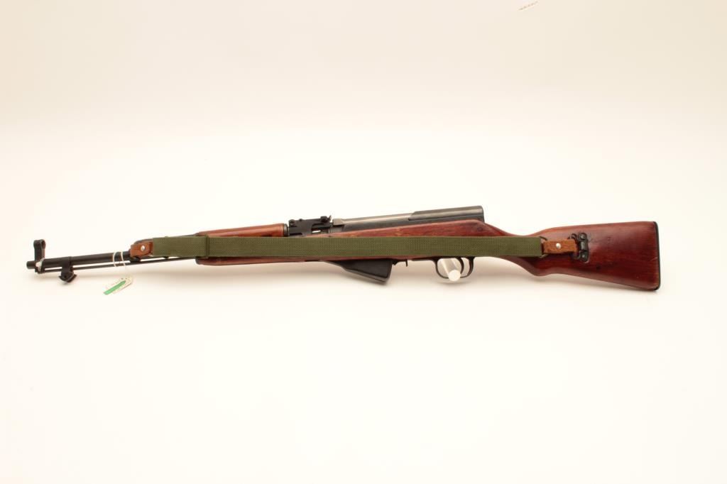 Chinese SKS Type 56 semi-automatic rifle, 7.62 x 39 caliber, Serial #8905743. The rifle is in very good overall condition with a 20” barrel with hooded front and military tangent style rear sights. The metal Lot Title surfaces retain the majority of their military finish with only light handling and storage marks. The left side of the receiver is import marked and all visible serial numbers are matching, including the butt Lot Title stock. The smooth wood stock is in very good condition and includes an OD green canvas sling. The butt ends with a smooth steel butt plate with trap. The bore is good, the action crisp and markings are sharp. Est.: Lot Title $250-$500. (Modern).