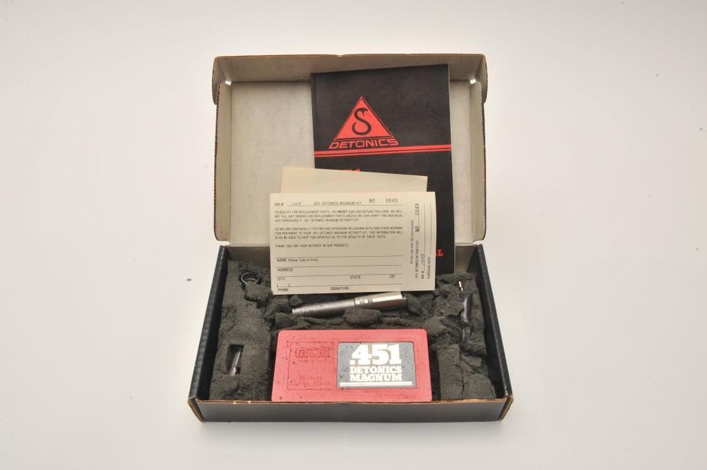 Detonics .451 Magnum barrel in box with accessories, 50 new cases and reamer. The lot includes a Detonics factory cardboard box with a new 4 ½” .451 Magnum barrel, reamer for conversion of .308 brass and box of 50 Lot Title new Detonics head stamped .451 Magnum brass. The box is in good condition while the packing foam inside has begun to deteriorate. Est.: $150-$300.