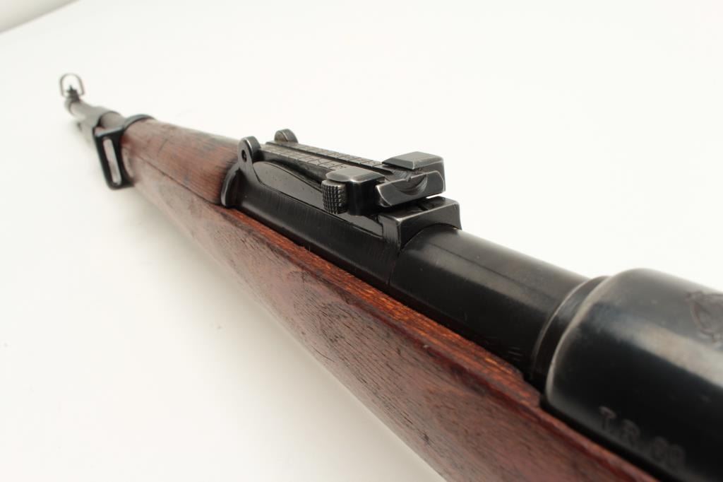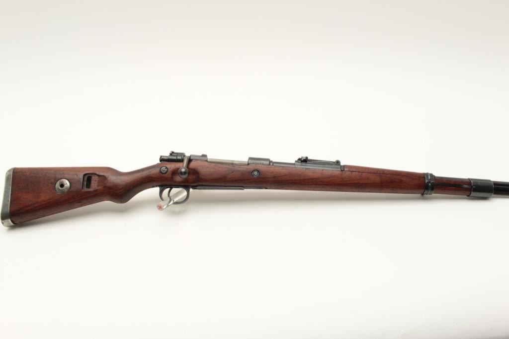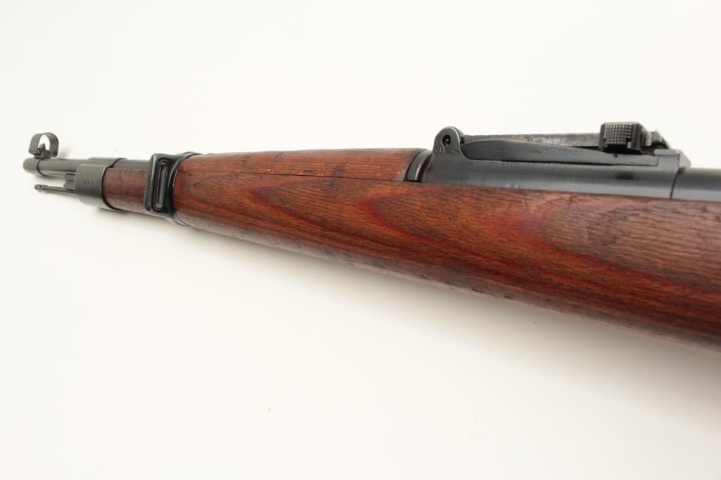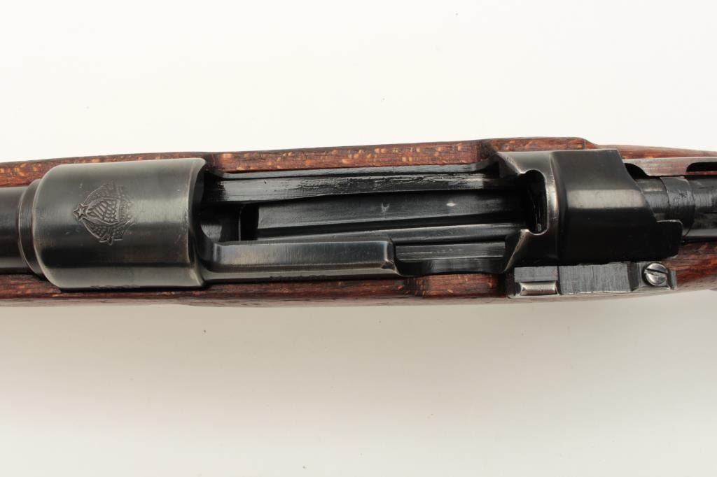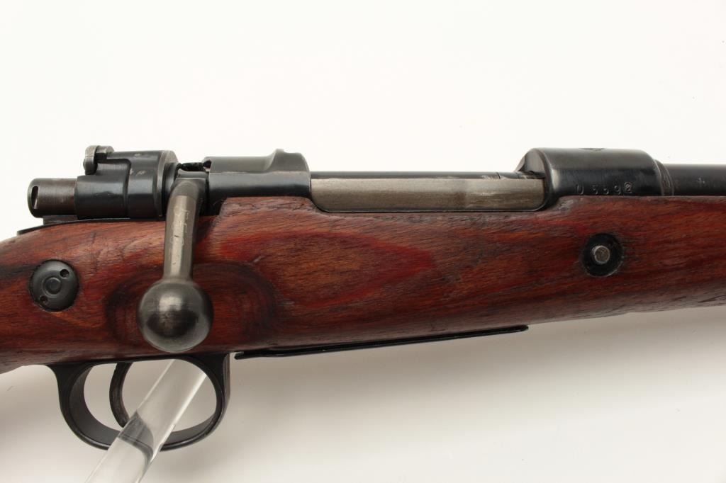 Yugoslavian K98 bolt action rifle, 8mm caliber, Serial #U5592. The rifle is in very good overall condition with a 24” import marked barrel with a hooded front and military tangent style rear sights. The Lot Title metal surfaces retain a significant amount of their blue finish wear at the muzzle. The floor plate is marked, “byf” and the front ring features the Yugoslavian crest. The smooth wood stock is in good condition with Lot Title small mars and compressions consistent with service use and cartouches behind the trigger guard. The butt stock is serialized to the action and ends with a smooth, steel butt plate. The bore is good, the action crisp Lot Title and markings are sharp. Est.: $200-$400. (C+R).