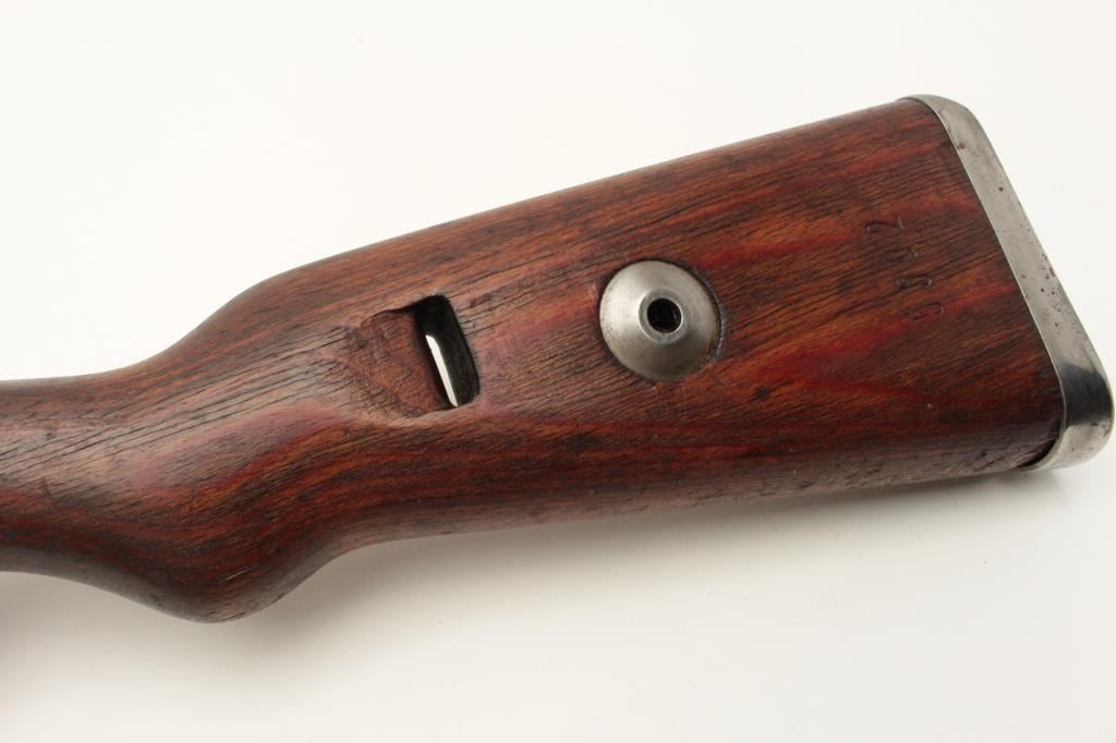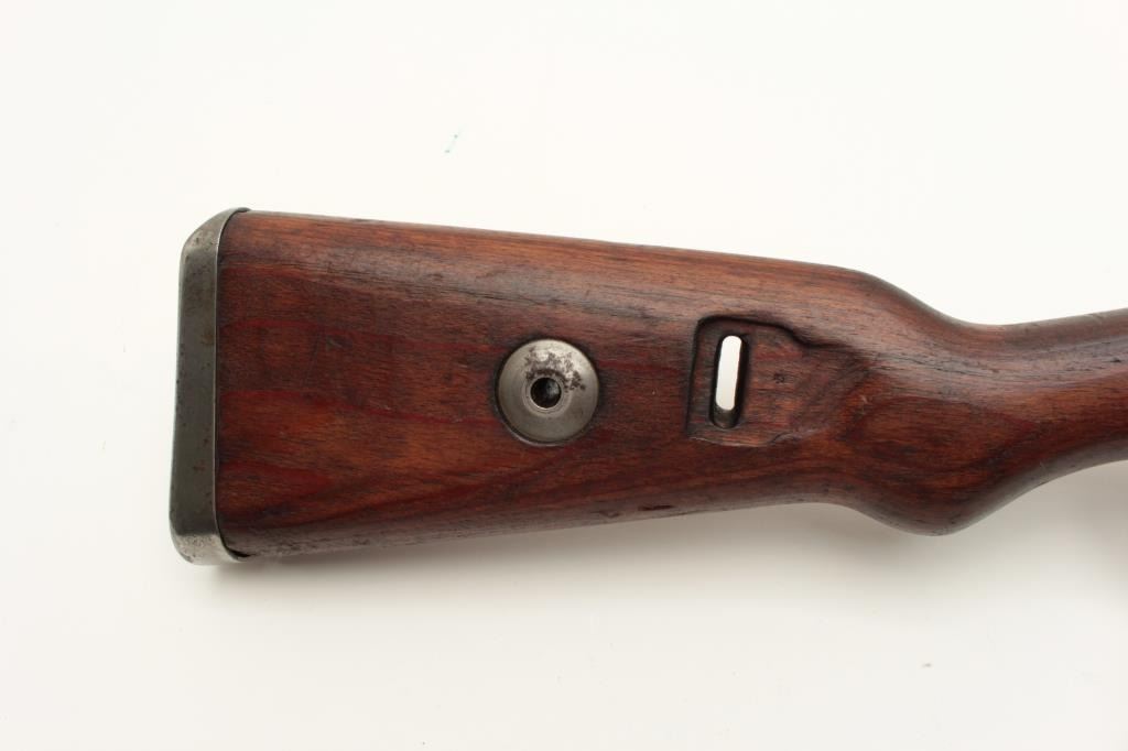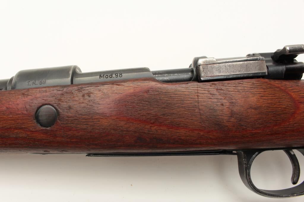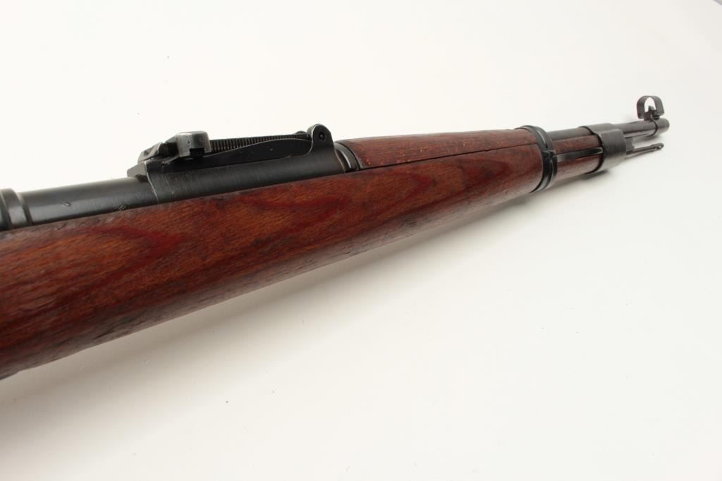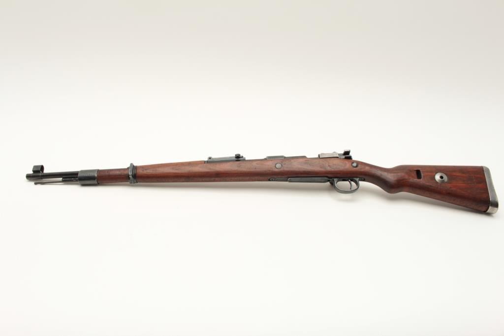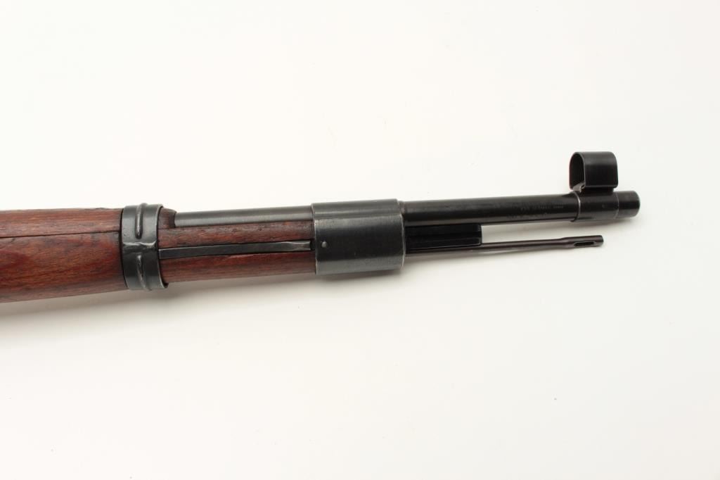 Yugoslavian K98 bolt action rifle, 8mm caliber, Serial #U5592. The rifle is in very good overall condition with a 24” import marked barrel with a hooded front and military tangent style rear sights. The Lot Title metal surfaces retain a significant amount of their blue finish wear at the muzzle. The floor plate is marked, “byf” and the front ring features the Yugoslavian crest. The smooth wood stock is in good condition with Lot Title small mars and compressions consistent with service use and cartouches behind the trigger guard. The butt stock is serialized to the action and ends with a smooth, steel butt plate. The bore is good, the action crisp Lot Title and markings are sharp. Est.: $200-$400. (C+R).