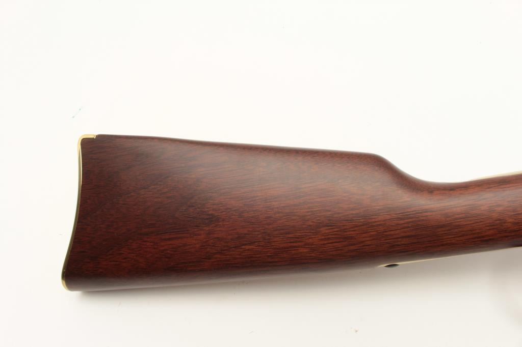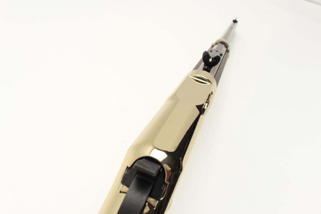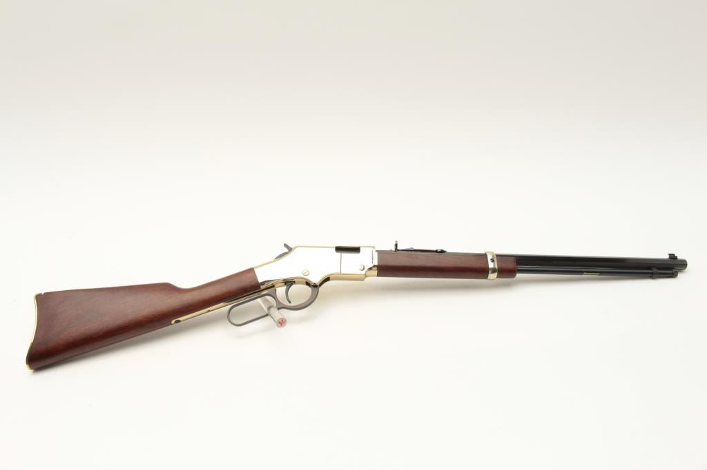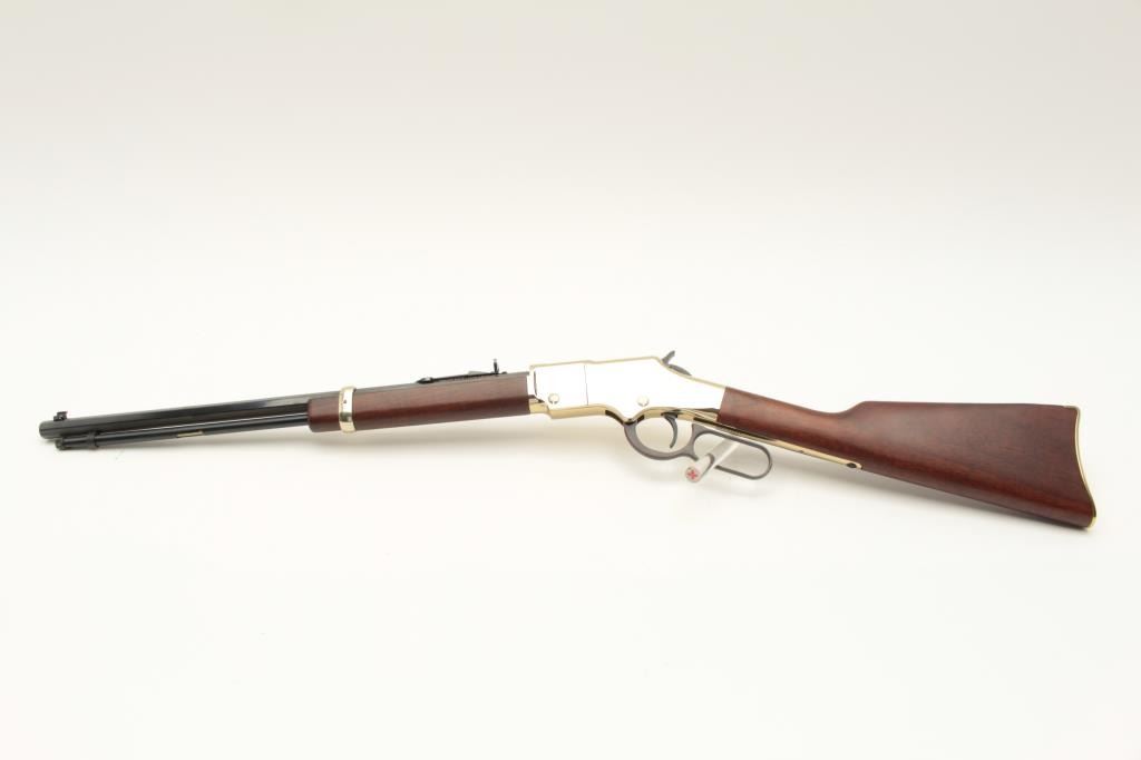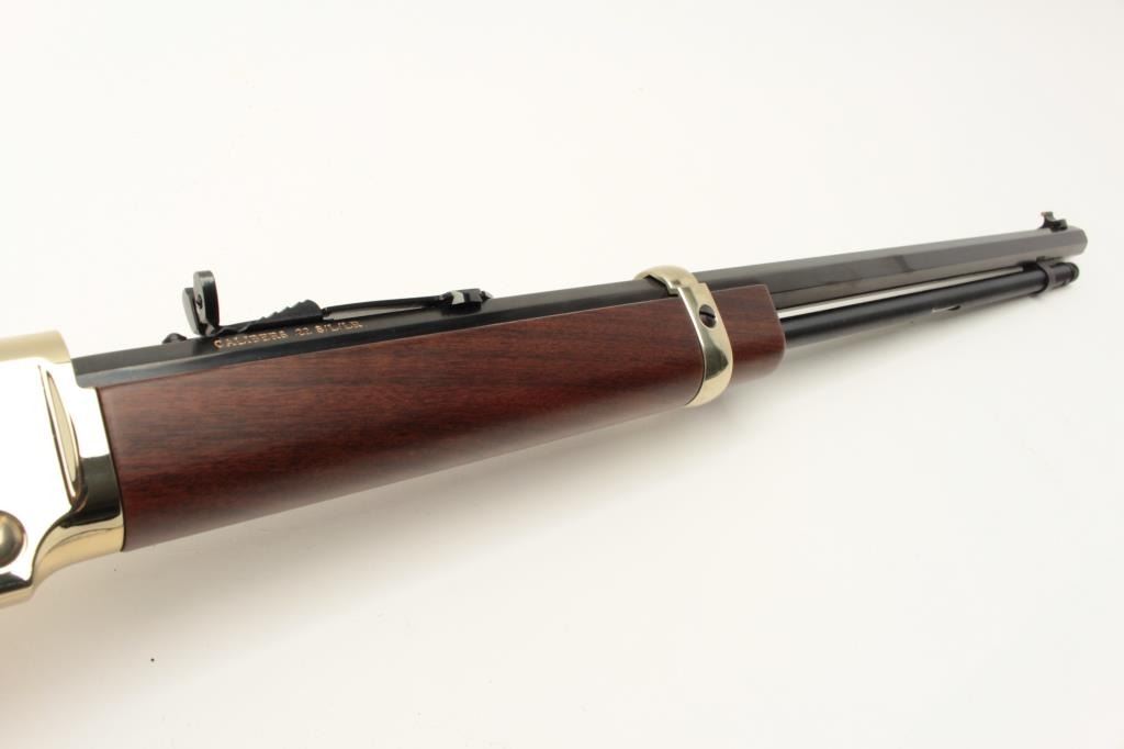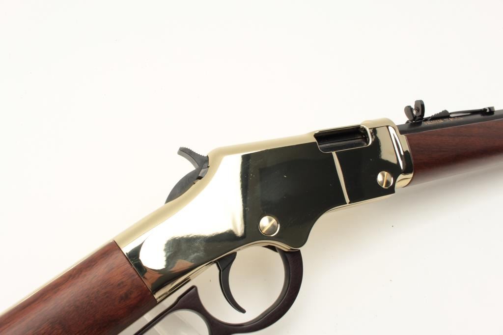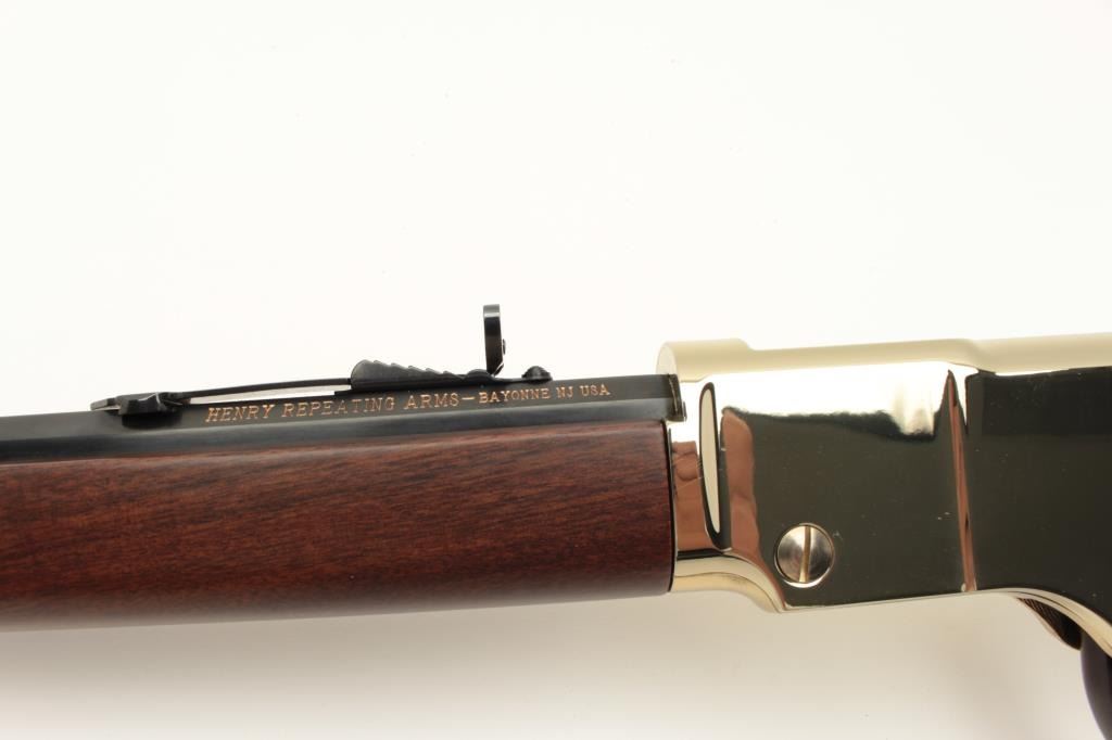Henry Repeating Arms Model H004 lever action rifle, .22 LR caliber, Serial #GB231892. The rifle is as new in the factory box with a 20” octagon barrel. The barrel and full-length magazine retain nearly all of Lot Title their blue finish while the receiver is completed in polished brass. The butt plate and barrel band are also polished brass. The smooth wood stocks show nice figure and grain. The rifle is as new in the factory Lot Title box with all associated packaging materials and paperwork. Est.: $300-$600. (Modern).