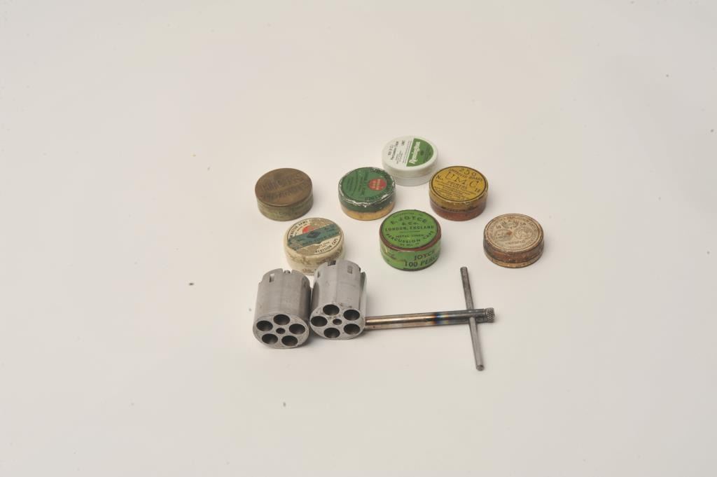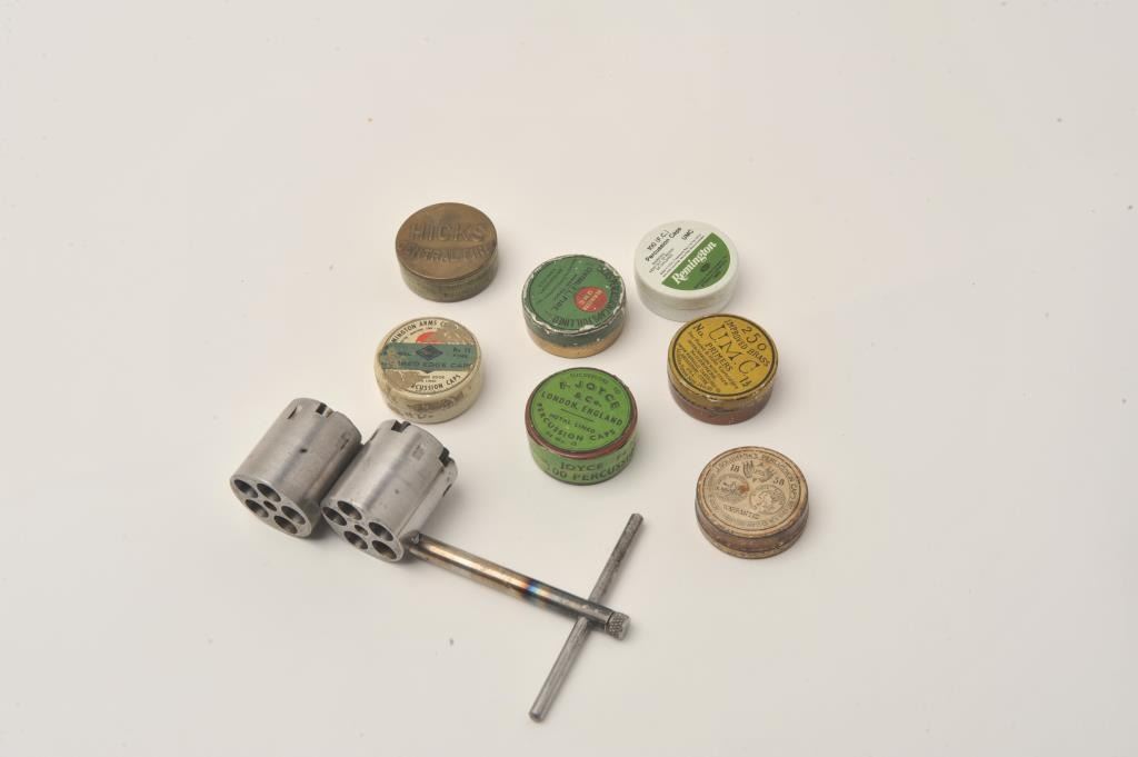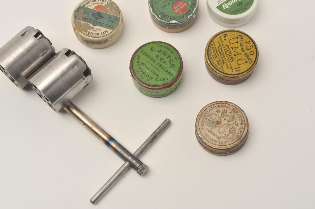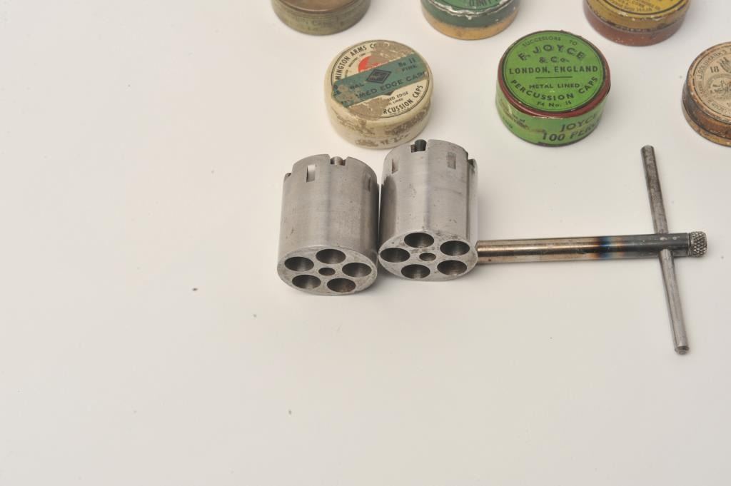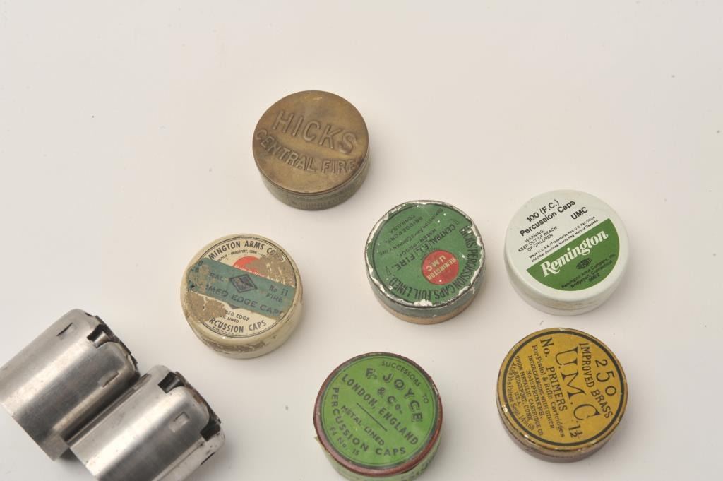 Lot consisting of 2 Bob Allen reproduction .36 caliber percussion cylinders for Remington Police Models. 7 cap tins. 1 excellent cap tin by Joyce unopened and partial quantities of caps. Est.: $150-$300