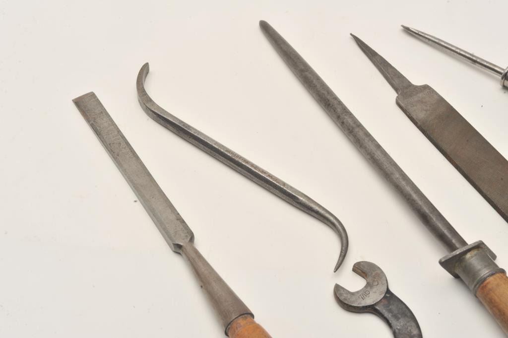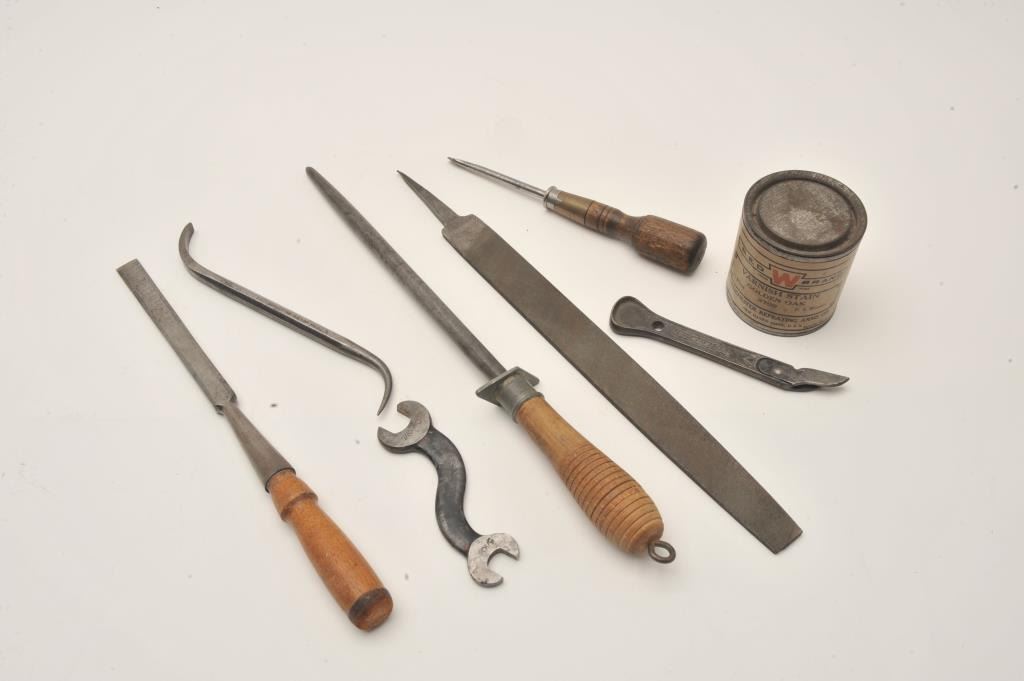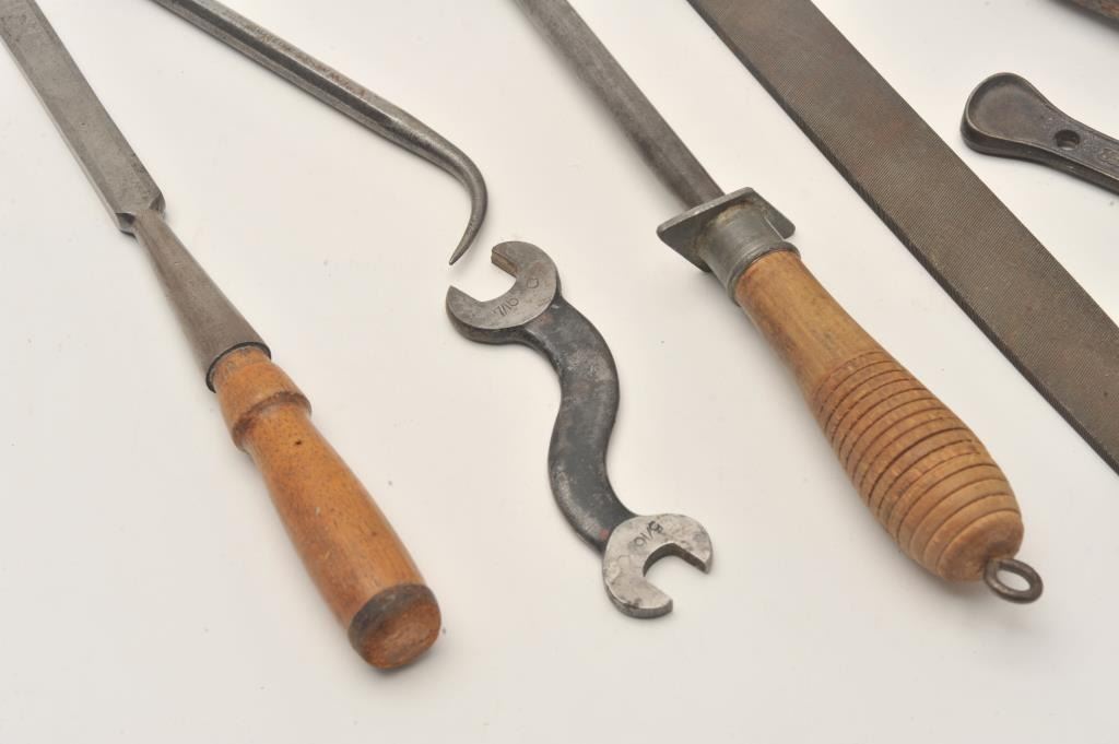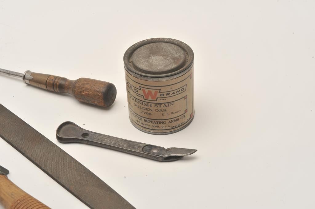 Winchester-related smalls lot including 7 tools and implements and a stain can with label (8 pieces total). Est.: $150-$300.