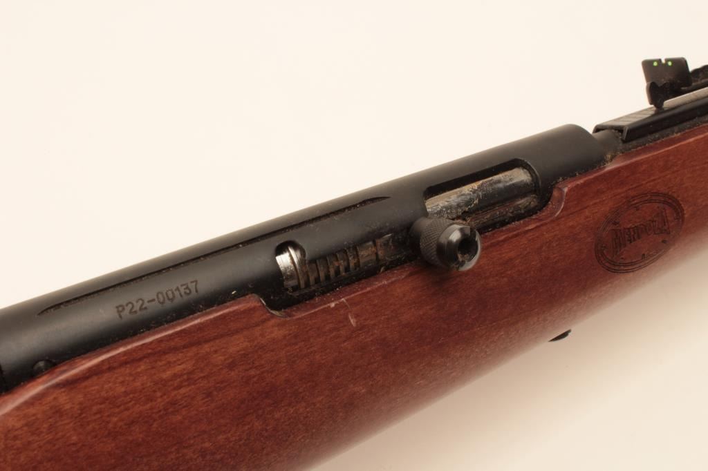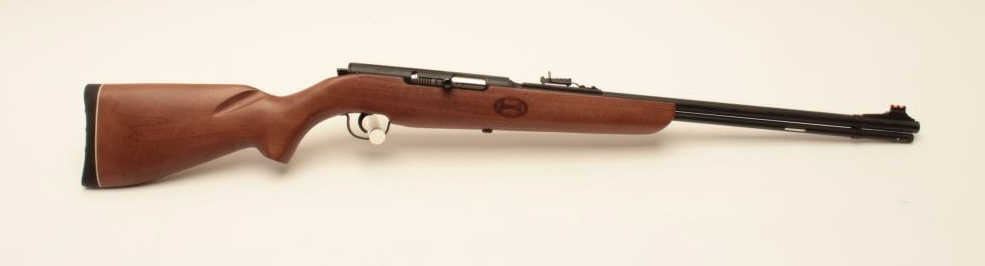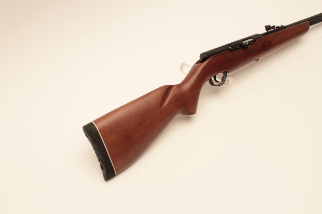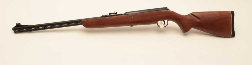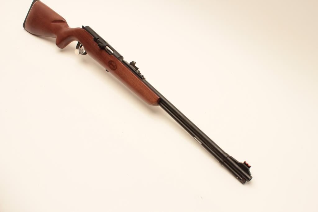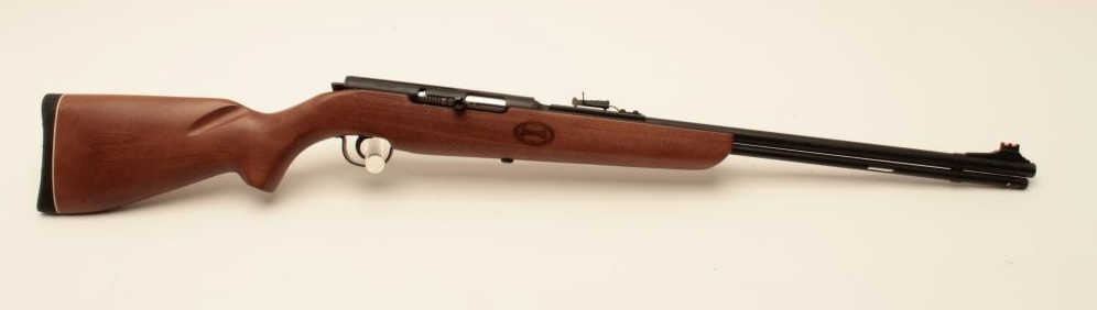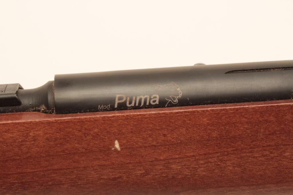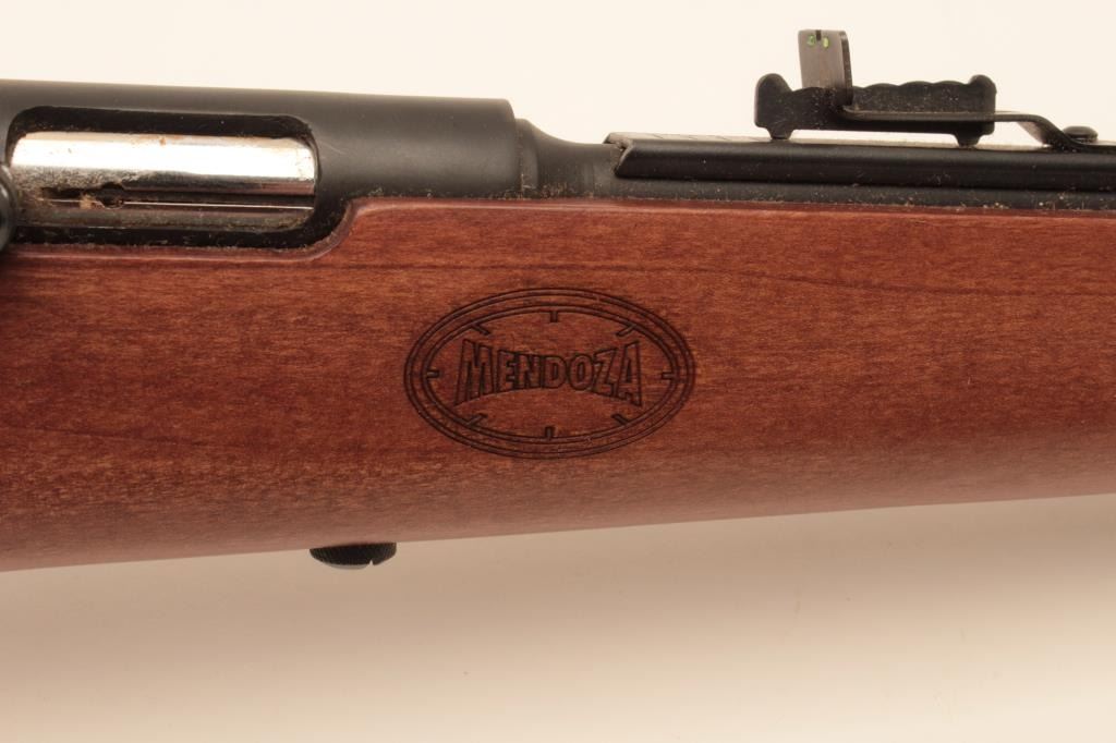 Mendoza Puma Model semi-automatic rifle, .22 LR caliber, Serial #P22-00137. The rifle is as new in the factory box with a 21 ¼” barrel with a high-viz front and adjustable rear sights. The metal surfaces retain nearly all Lot Title of their blue finish with the import marks on the left side. The smooth wood stock is in good condition with small dents and handling marks. The butt ends with a rubber butt pad. The bore is very good, the action Lot Title crisp and markings are sharp on this new rifle manufactured in Mexico for Mendoza. Est.: $125-$250. (Modern).