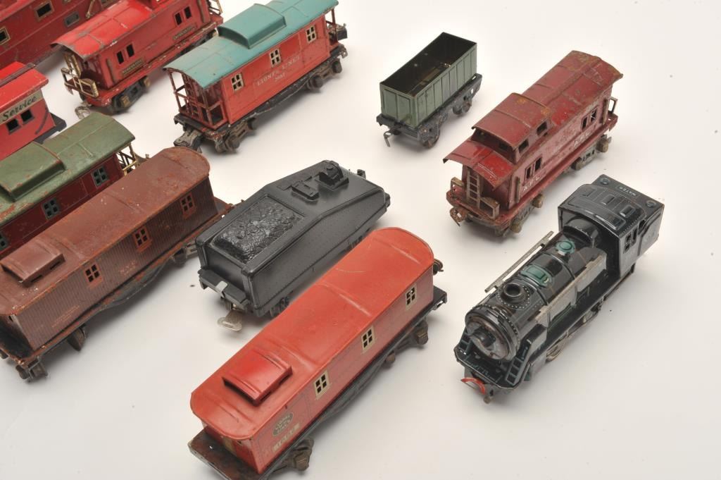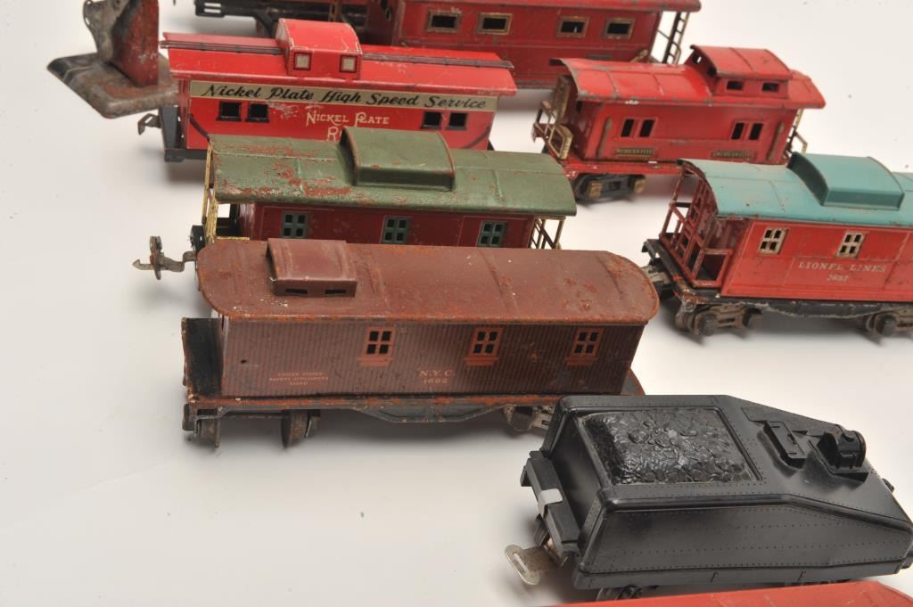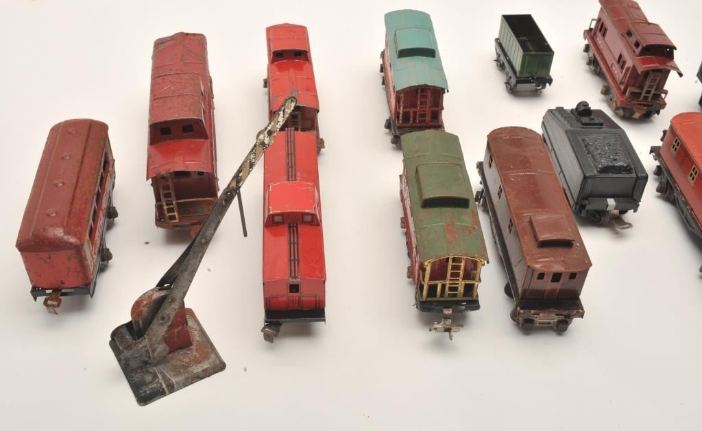 Lot of 12 old toy train cars, ca. 1930s-40s, by Lionel and American Flyer with a railroad crossing guard; metal construction and ranging in condition from good to very good. Est.: $200-$400.
