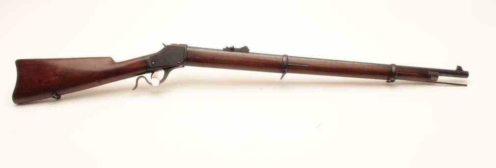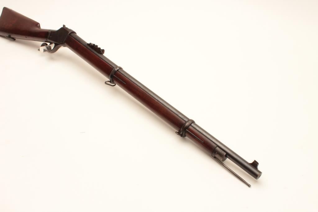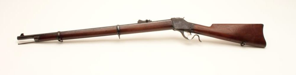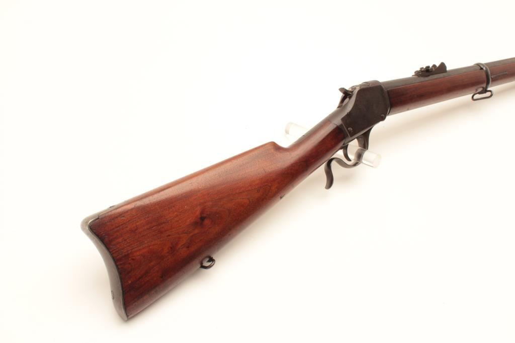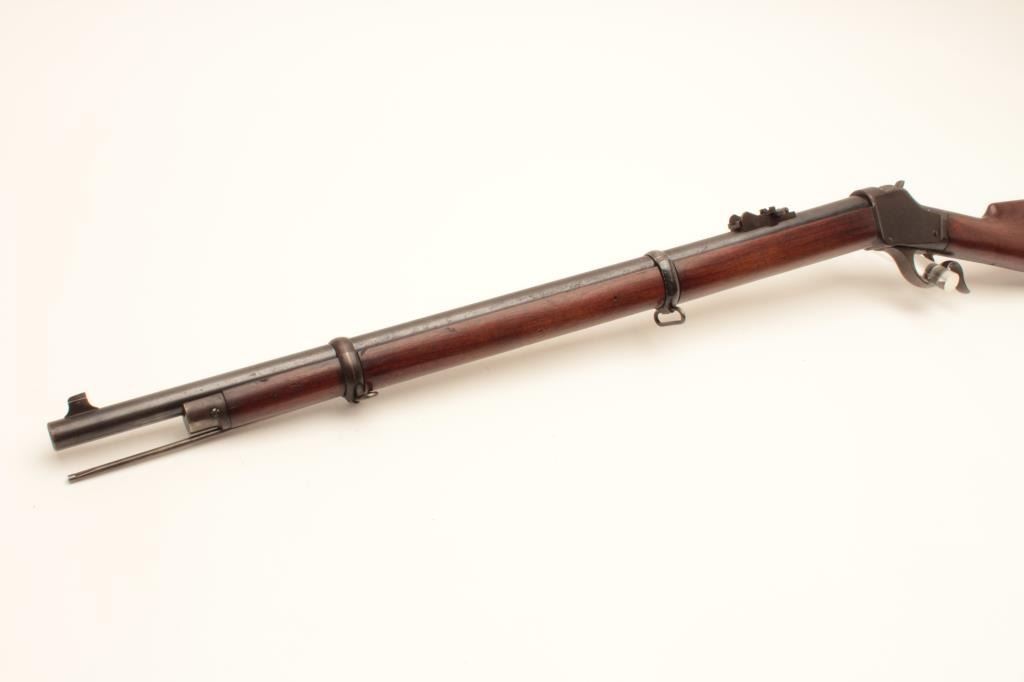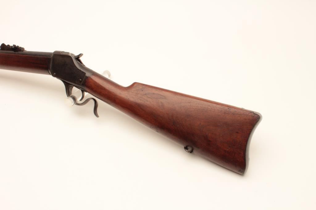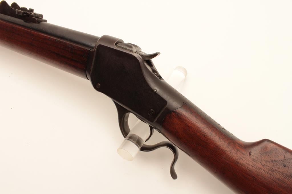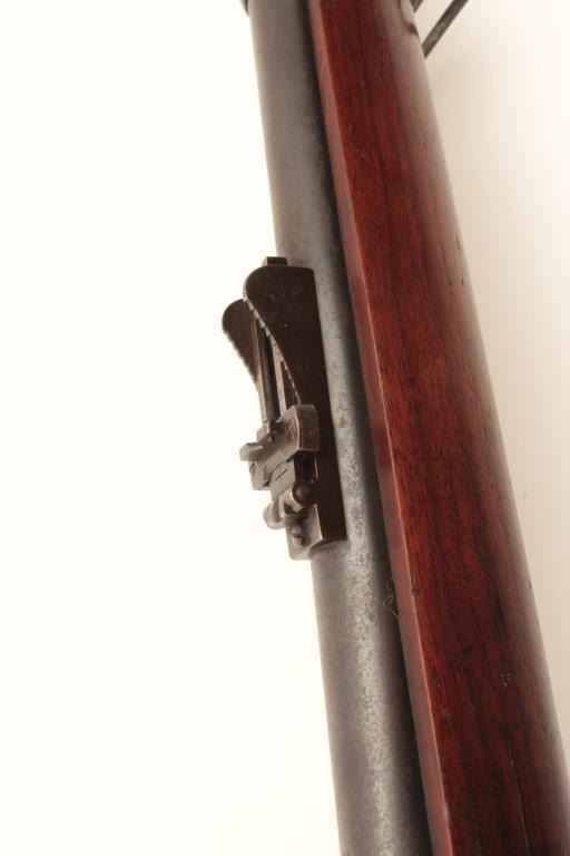 Winchester Hi-Wall single shot musket, .22 LR caliber, Serial #99981. The musket is in fine overall condition with a 28” round barrel with a ramped blade front and military tangent style rear sights. The barrel Lot Title retains 60%-70% of its original blue finish with small mars and light surface erosion in areas. The receiver too retains a significant amount of original blue finish with light surface erosion. The lever and hammer show Lot Title considerable old, muted case hardening. The smooth wood stock is in very good condition with barrel band swivels, ramrod and smooth steel butt plate. The bore is fair, the action crisp and markings are sharp on this Lot Title desirable Hi-Wall rarely encountered in the .22 Long Rifle chambering. Est.: $600-$1,200. (C+R).