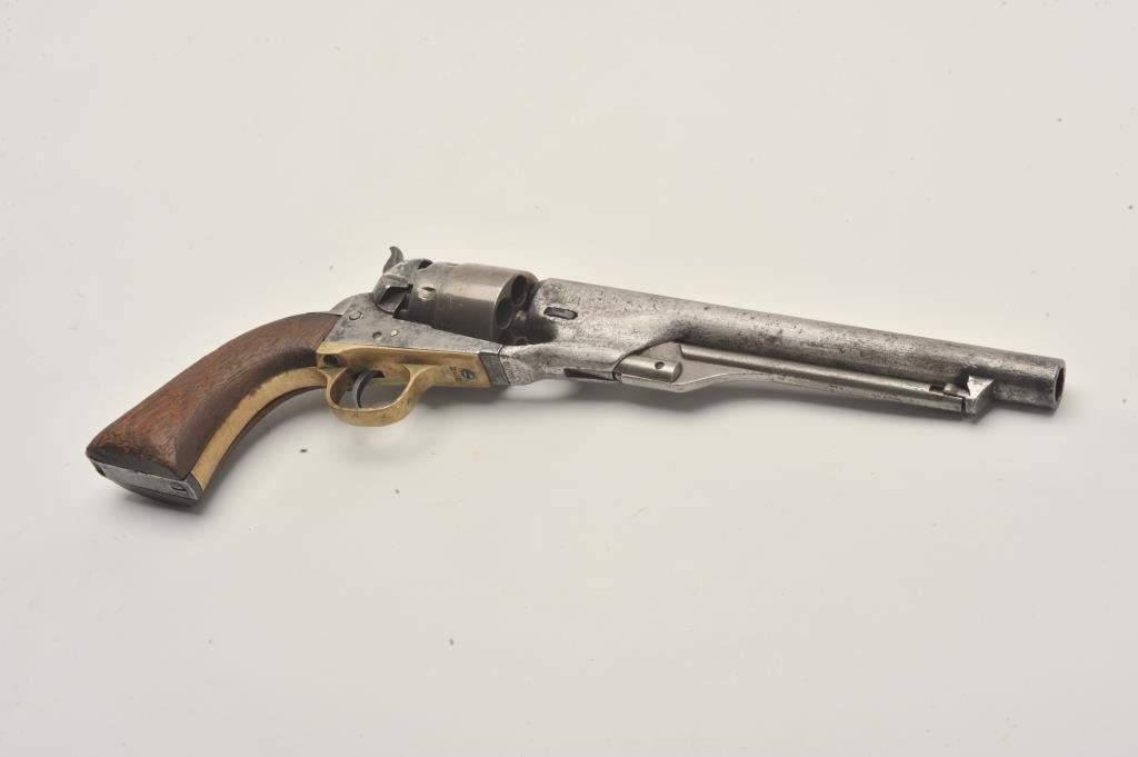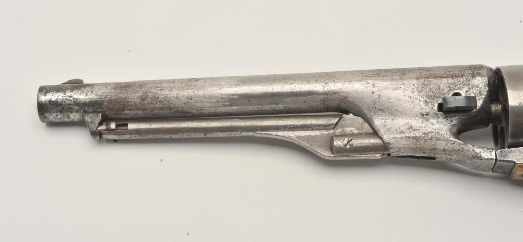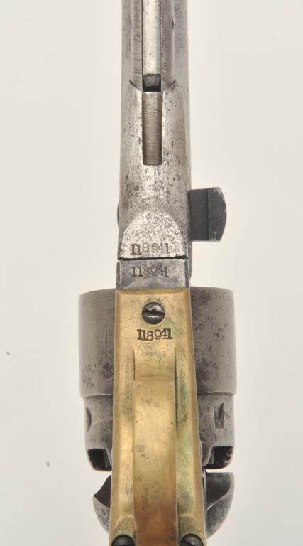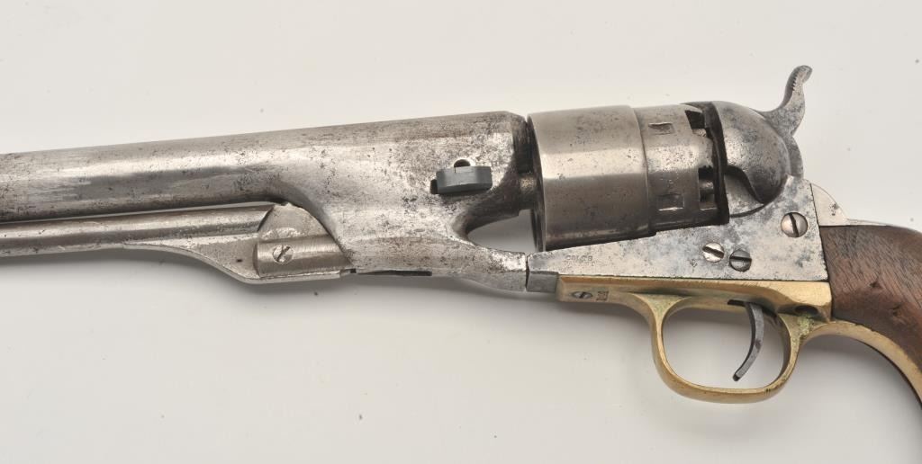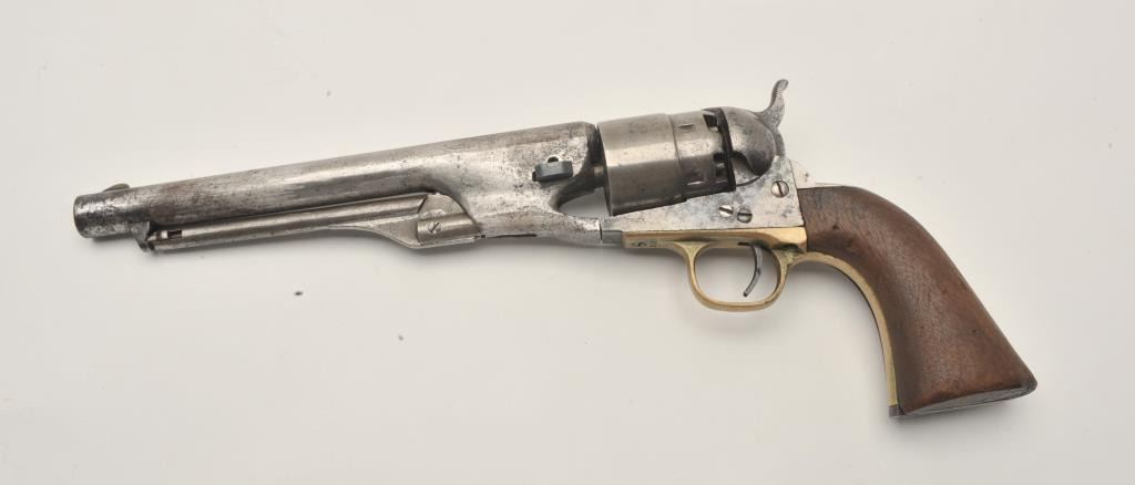 Colt 1860 Army percussion revolver, .44 caliber, Serial #118941. The pistol is in fair overall condition with an 8” barrel. The pistol has been polished clean with the barrel a bright silver patina and barrel Lot Title address still visible. The barrel has numerous dents, mars and light pitting. The cylinder has been polished smooth with no visible cylinder scene. The frame shows some old pin prick pitting, with brass trigger Lot Title guard and iron back strap. The bottom of the pistol has matching visible serial numbers except the butt and wedge. The smooth wood grips are in good overall condition with mars and scrapes consistent with use. The action Lot Title is not functioning at the time of description, the bore is fair and markings are legible. Est.: $800-$1,600. (Antique).