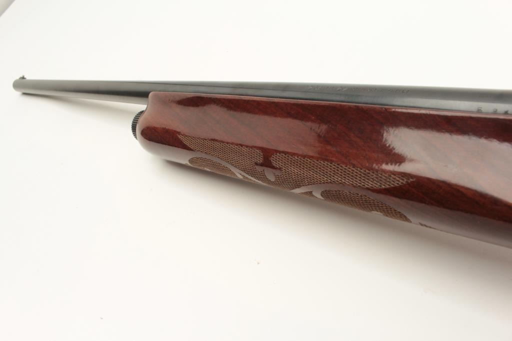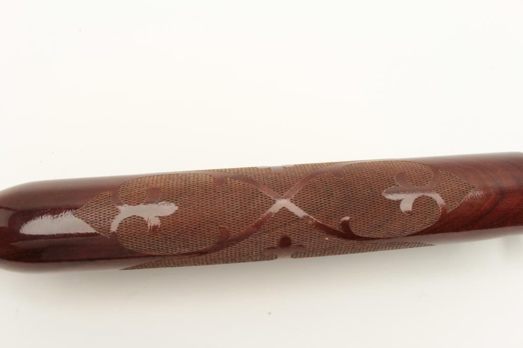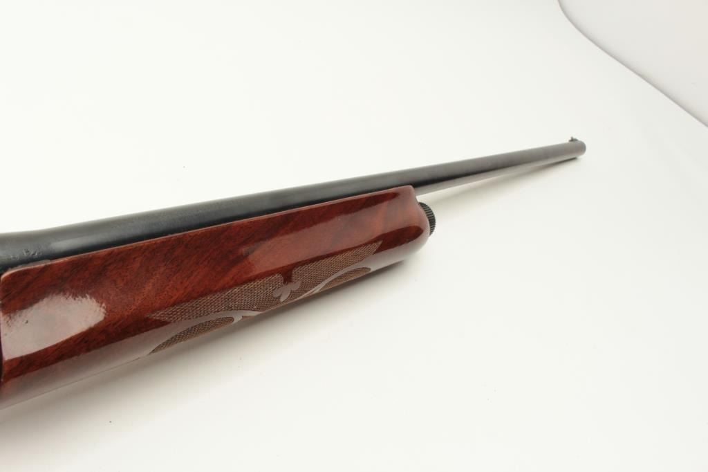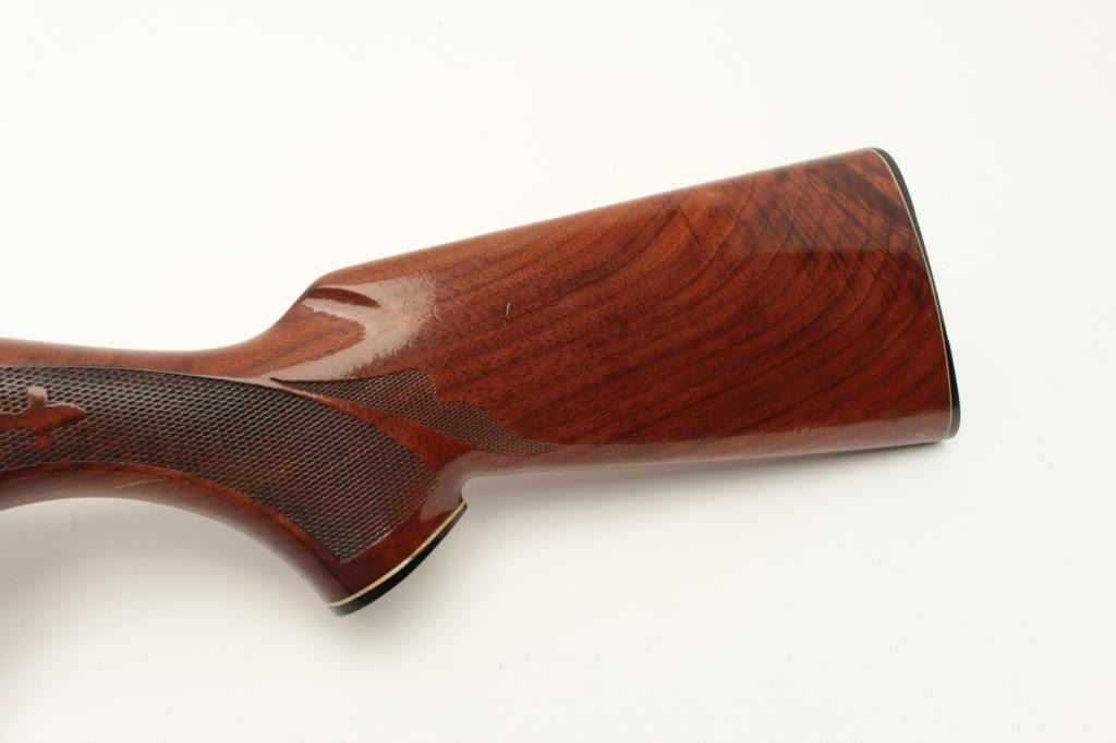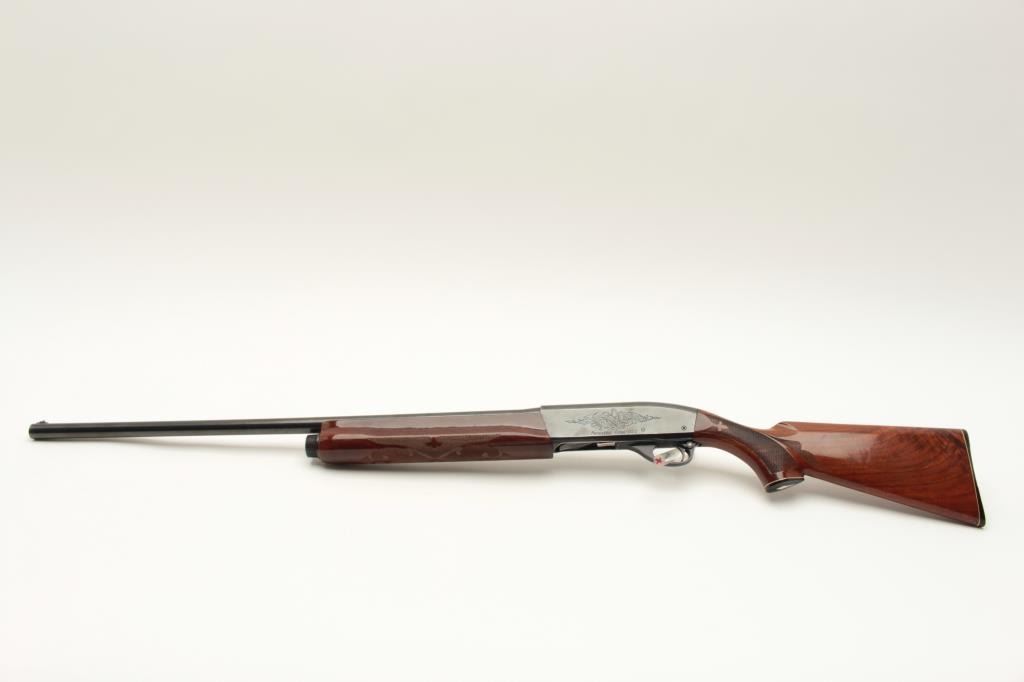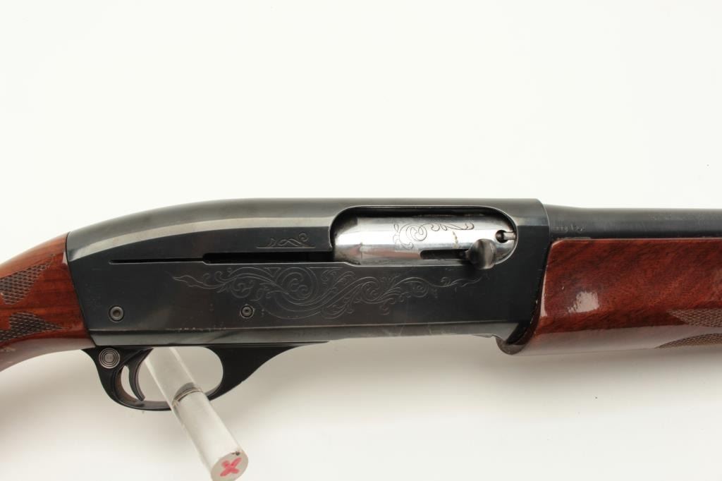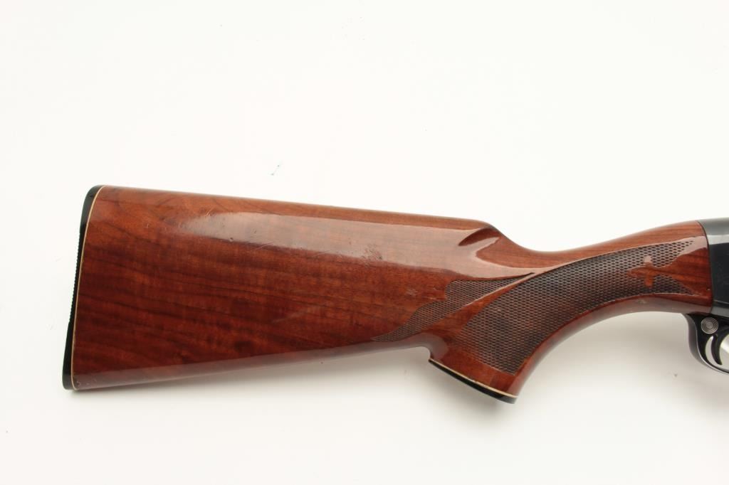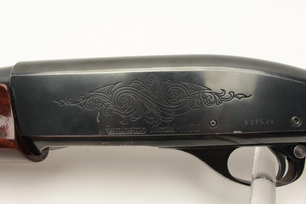 Remington Model 1100 semi-automatic shotgun, 12 gauge, Serial #53753V. The shotgun is in good overall condition with a 28” barrel with a steel bead front sight. The metal surfaces retain the majority of their blue Lot Title finish with wear at the muzzle and high point edge wear. The checkered wood stocks are in very good condition with mars and compressions consistent with field use. The butt stock ends with ribbed plastic butt Lot Title plate providing a 14” LOP. The bore is good, the action crisp and markings are sharp. Est.: $200-$400. (Modern).