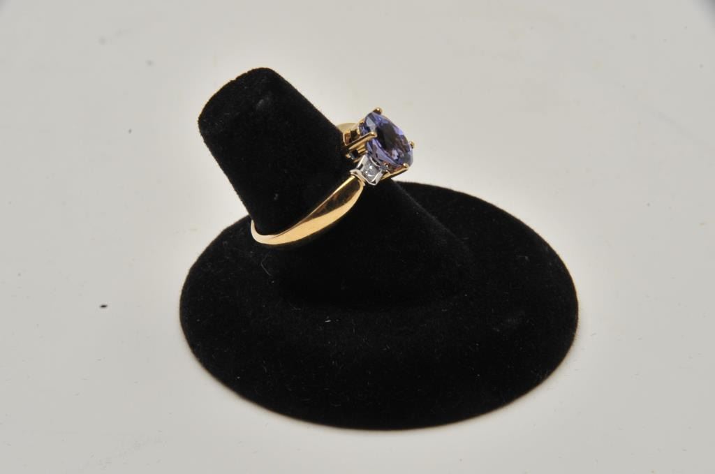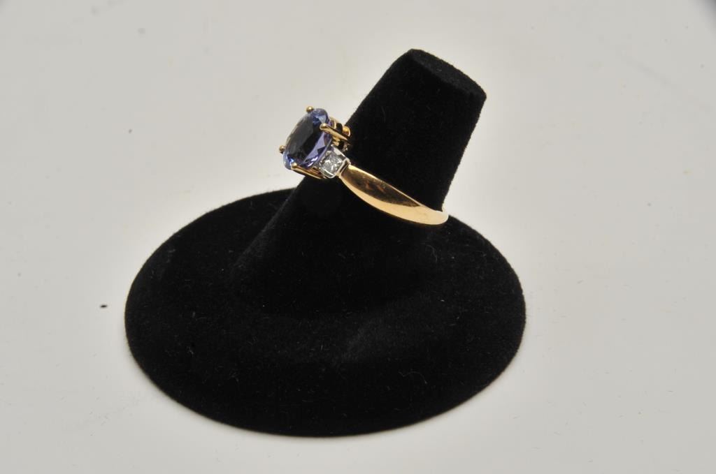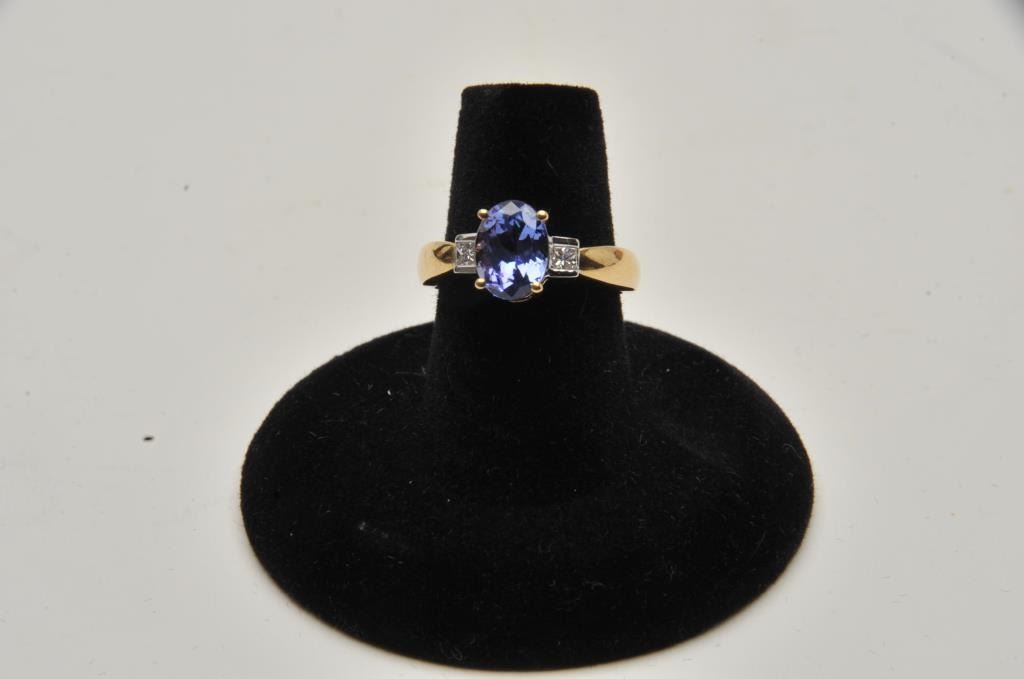 One ladies ring in 18k yellow gold set with a oval tanzanite wt approx 2.5ct and 2 princess cut diamonds Est:$1,000-1,200