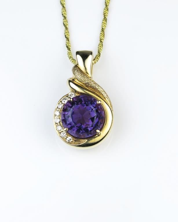 Striking Amethyst and Diamond Pendant featuring an approx. 5.00 carat Amethyst accented with 8 ‘IDEAL’ cut Diamonds weighing approx. 0.25 carats of G-H colors and VS clarity on a heavy custom made 14 karat Lot Title yellow gold setting. Retail $2,500-$3,000 Estimate $1,500-$2,000