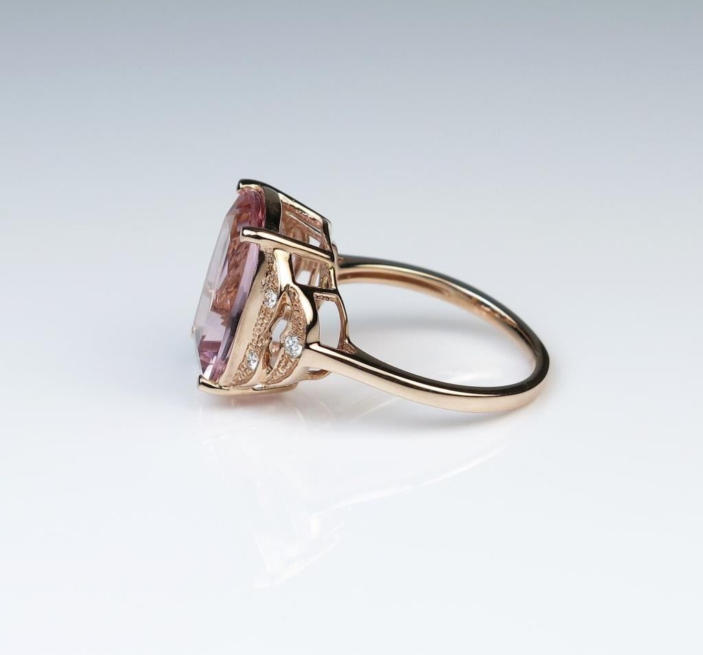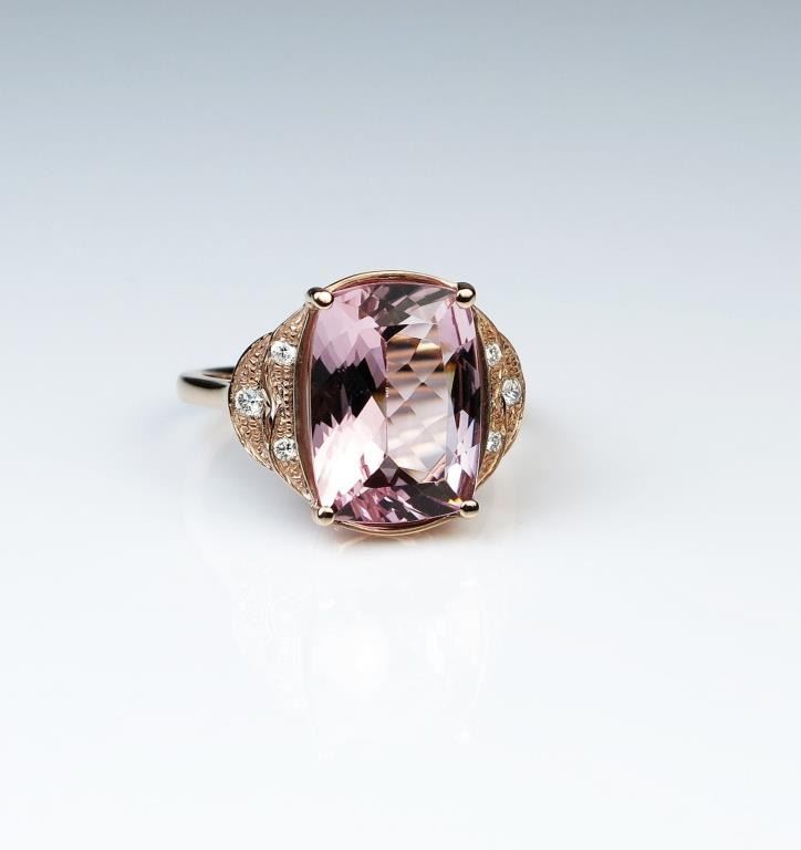 Sophisticated Morganite and Diamond ring featuring a cushion cut Morganite weighing approx. 7.00-8.00 carats accented with 6 side Diamonds set in a 14 karat Rose gold setting. Retail $2,000-$3,000 Estimates Lot Title $1,200-$1,800