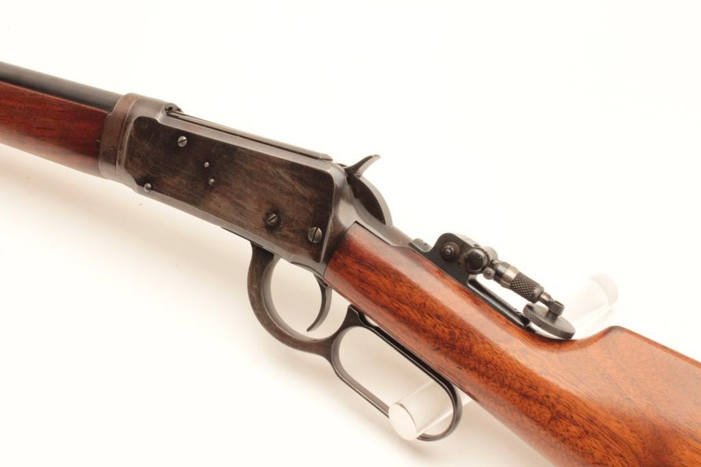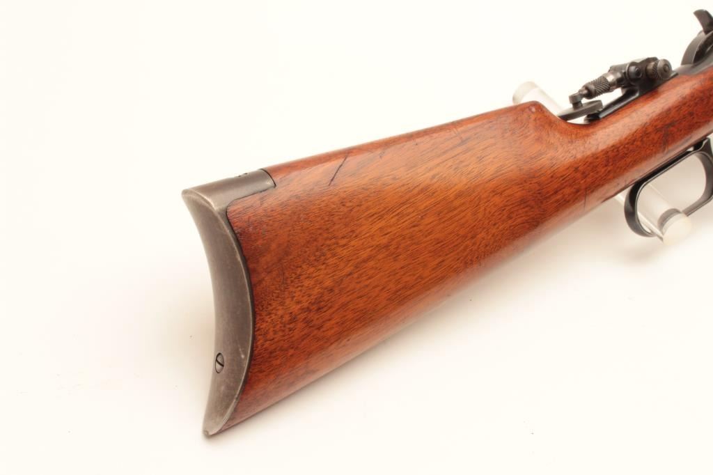 Special Order Winchester Model 1894 takedown lever action rifle, .32-40 caliber, Serial #923953. The rifle is in very good to nearly fine condition with a 26” round barrel with custom adjustable front target sight and Lot Title Lyman tang sight added. The barrel and full-length magazine retain 90%-95% of their blue finish with small mars and handling marks. The receiver shows 40%-60% of its drifting blue finish with sharp edges. The Lot Title smooth wood stock is in very good condition with minor scratches and slight imperfections. The butt stock ends with a smooth, steel crescent butt plate. The bore is good, the action is crisp and markings are Lot Title sharp on this desirable special order Winchester. Est.: $1,250-$2,500. (C+R).