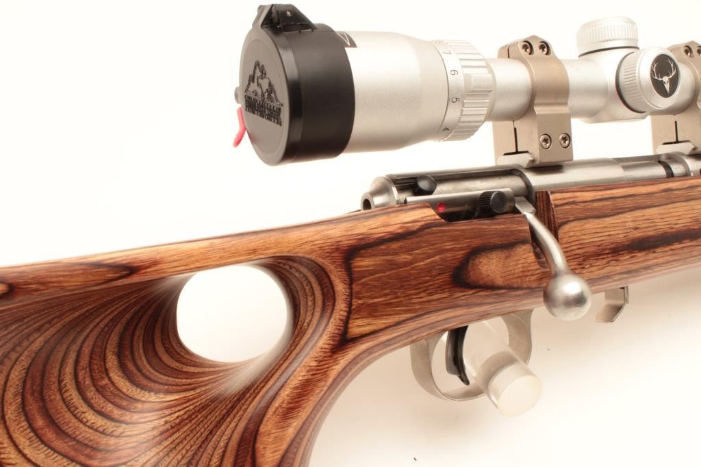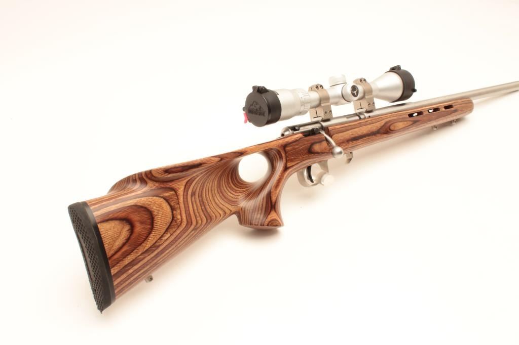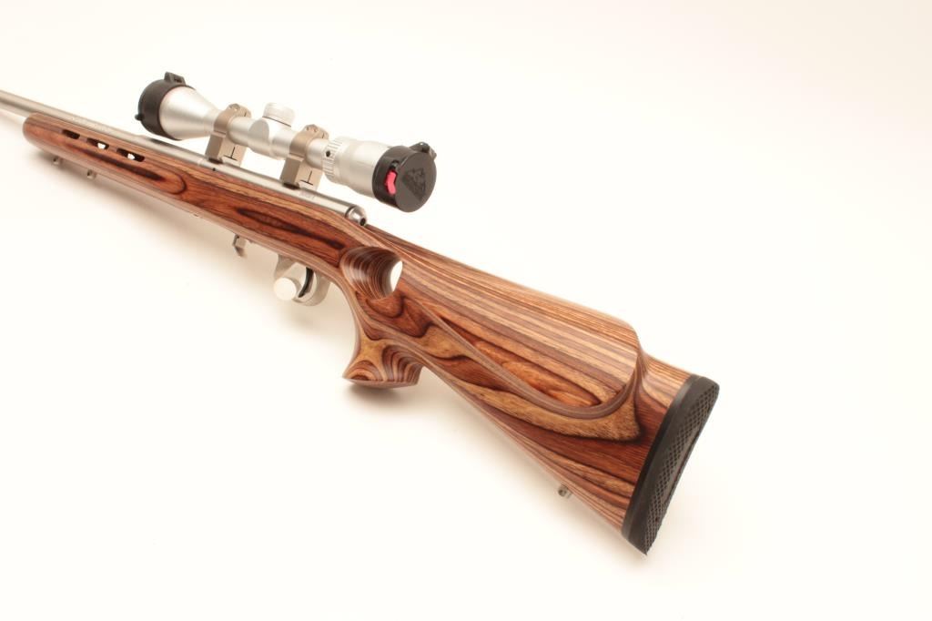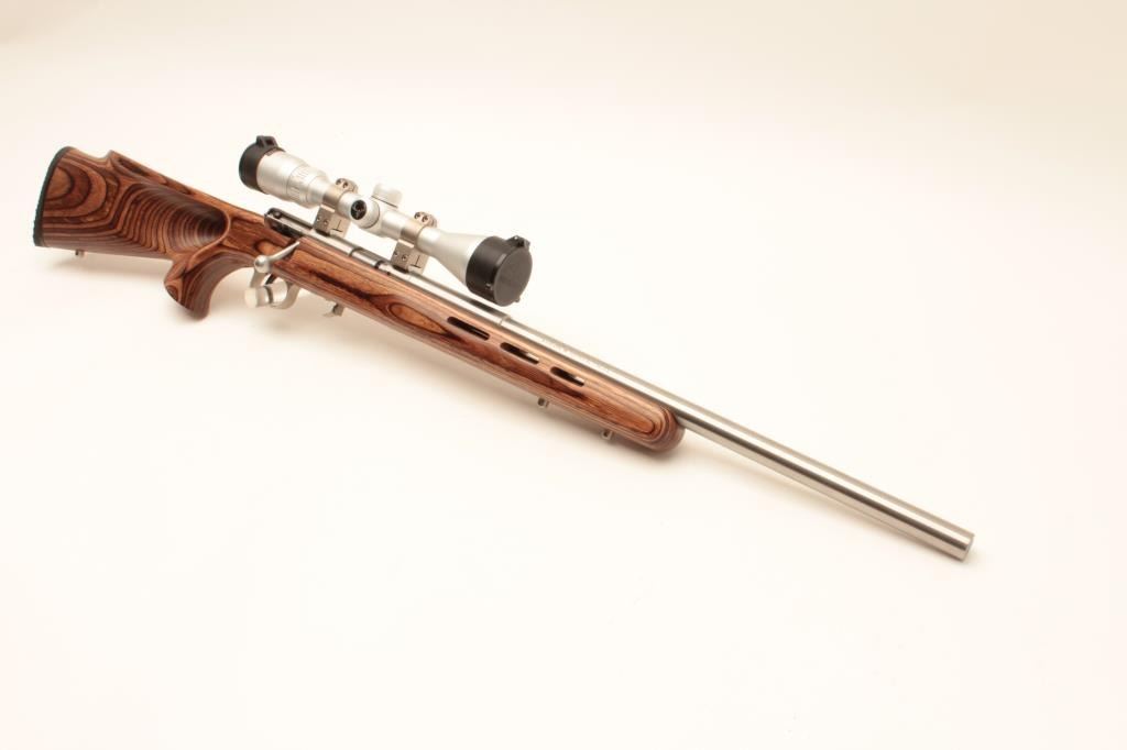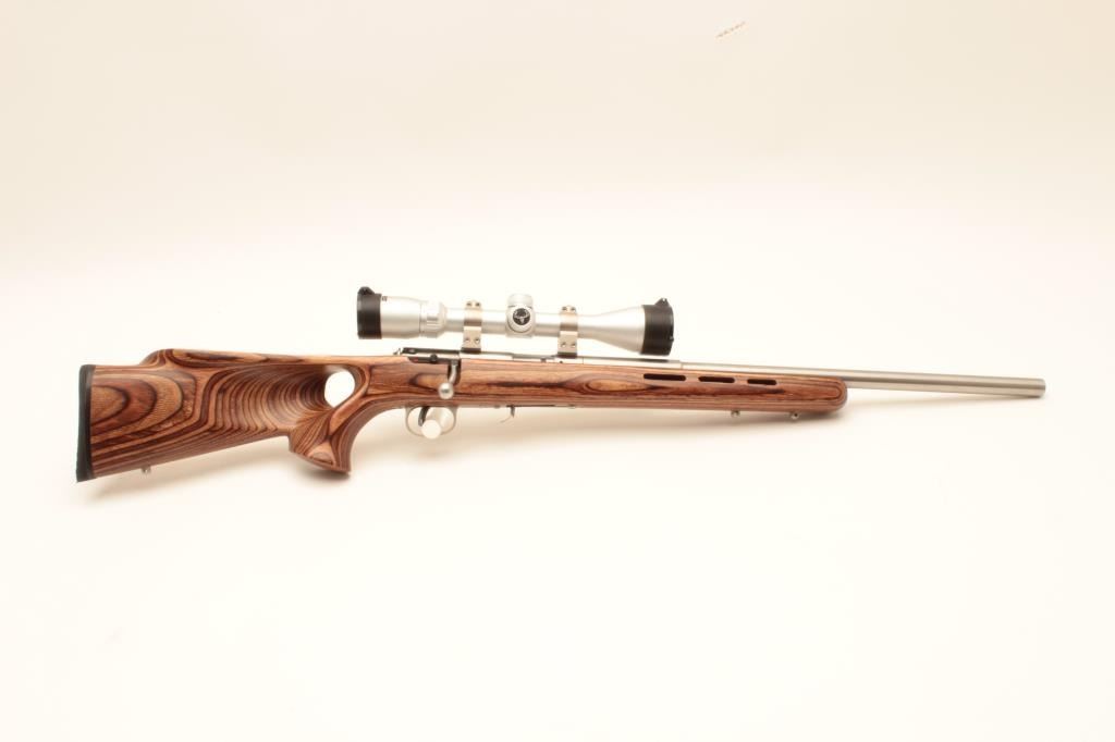 Savage Model 93R17 bolt action rifle, .17 HMR caliber, 21” barrel, stainless steel, thumb hole laminated wood stock with hard rubber butt pad, 3 extra magazines, S/N 0950915, in overall fine condition with a fine bore, Lot Title crisp action, sharp markings and fine stock; mounted with a Butler Creek scope displaying sharp optics. (Modern). Est.: $150-$300.