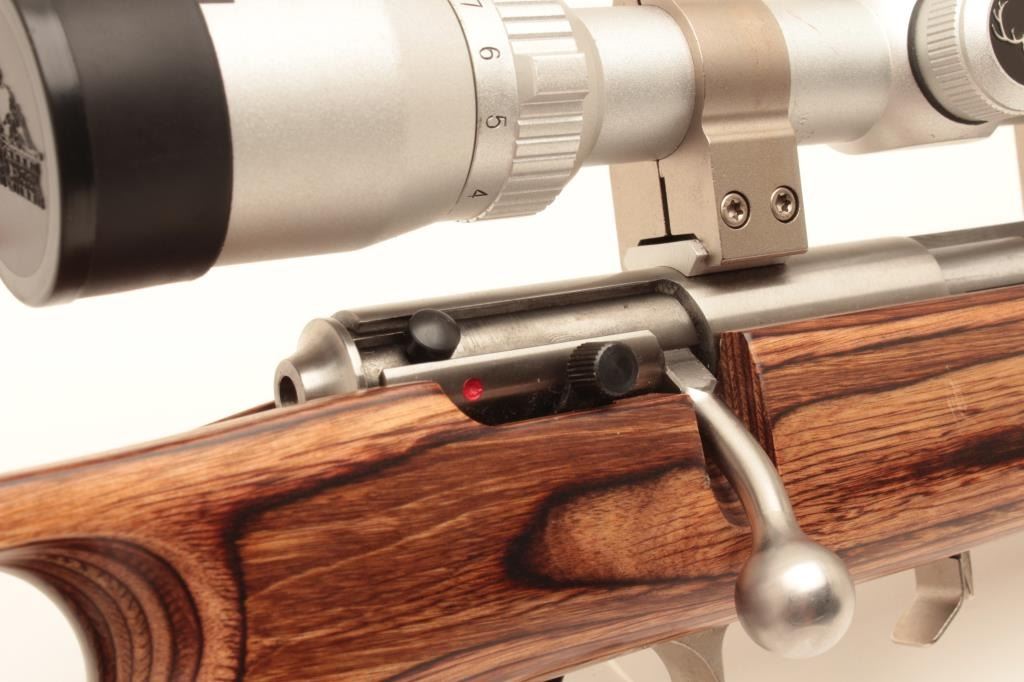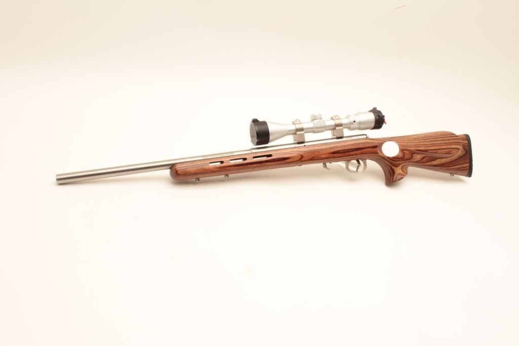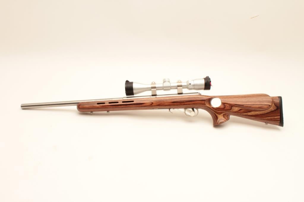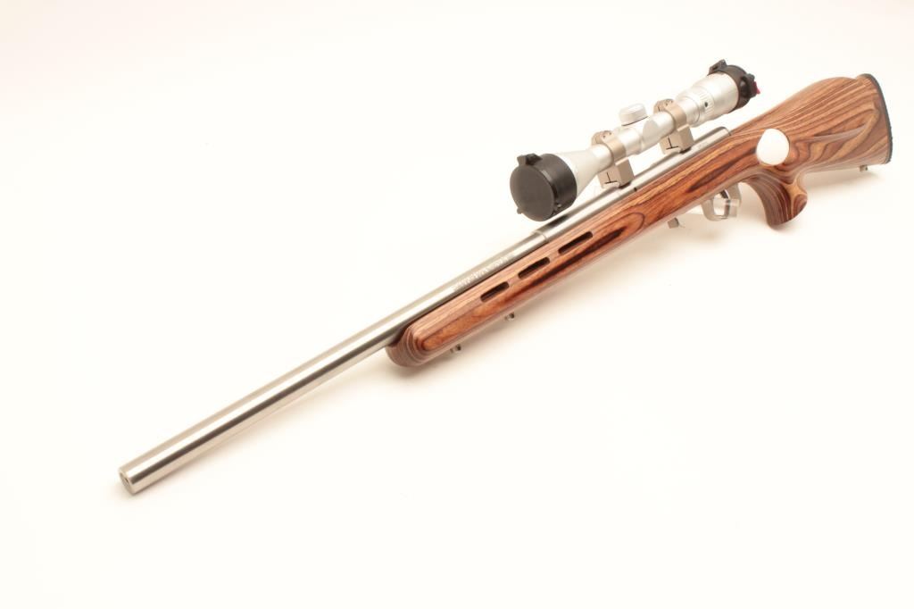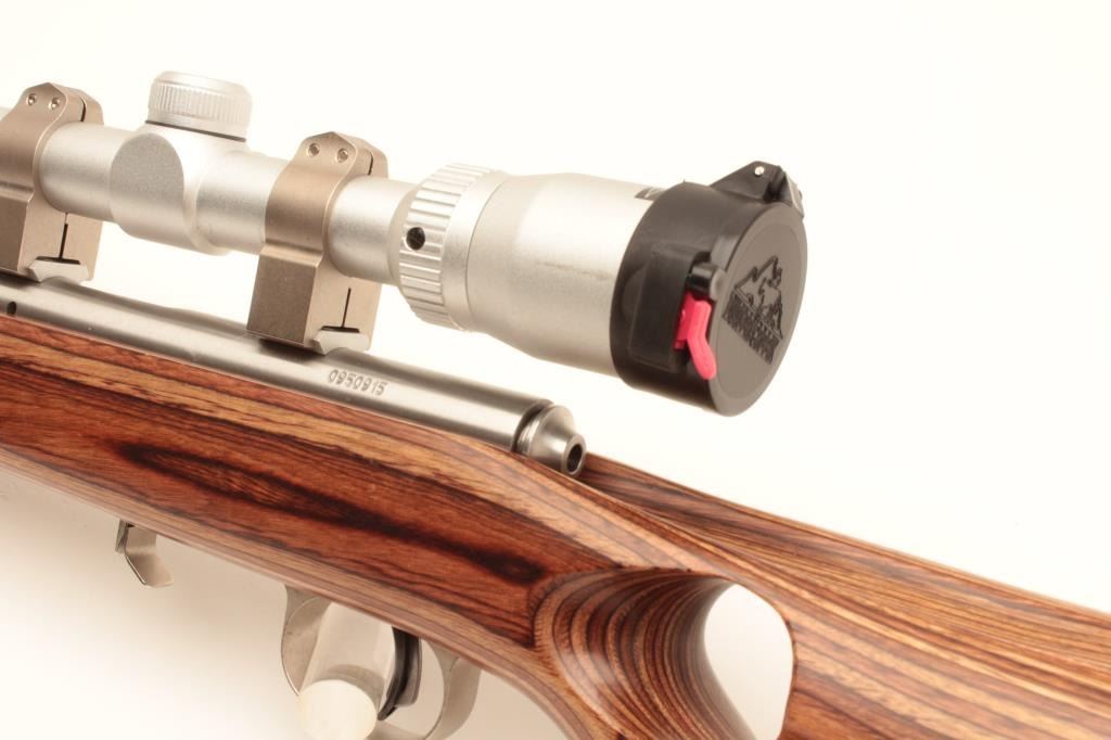 Savage Model 93R17 bolt action rifle, .17 HMR caliber, 21” barrel, stainless steel, thumb hole laminated wood stock with hard rubber butt pad, 3 extra magazines, S/N 0950915, in overall fine condition with a fine bore, Lot Title crisp action, sharp markings and fine stock; mounted with a Butler Creek scope displaying sharp optics. (Modern). Est.: $150-$300.