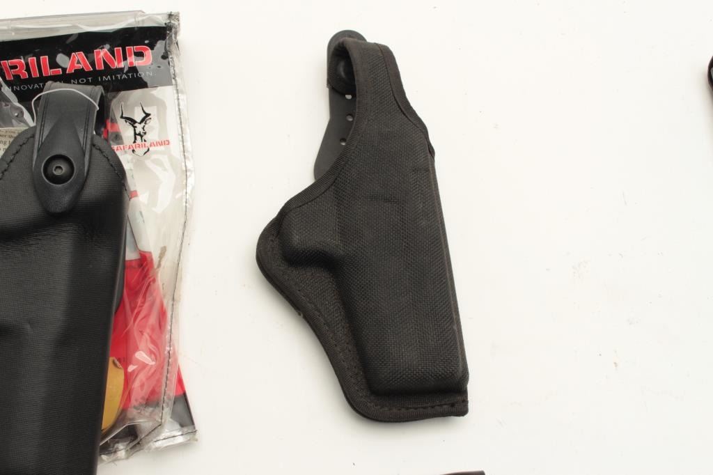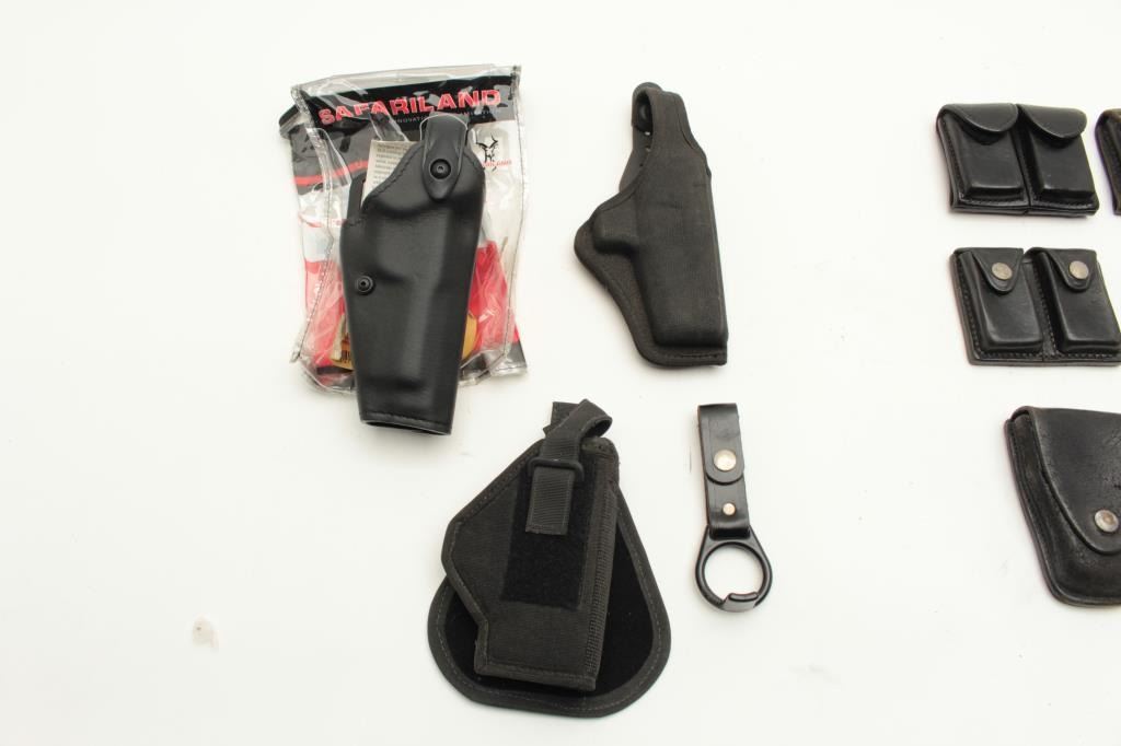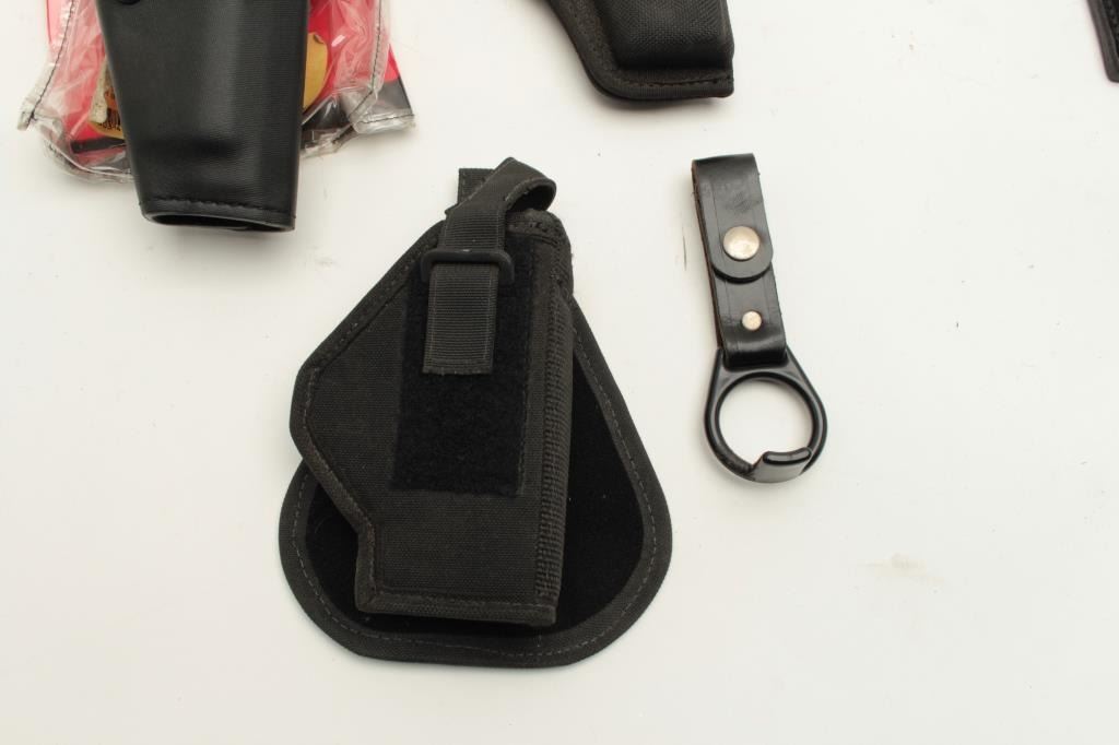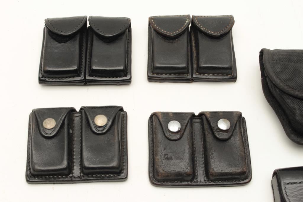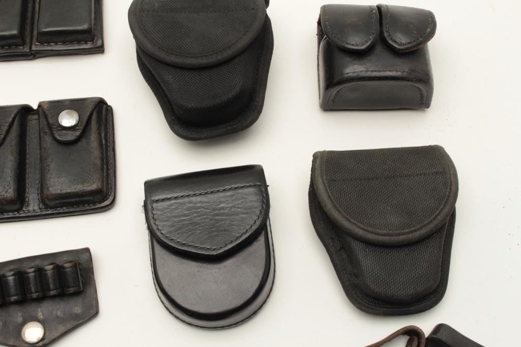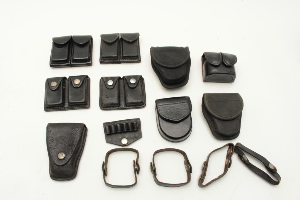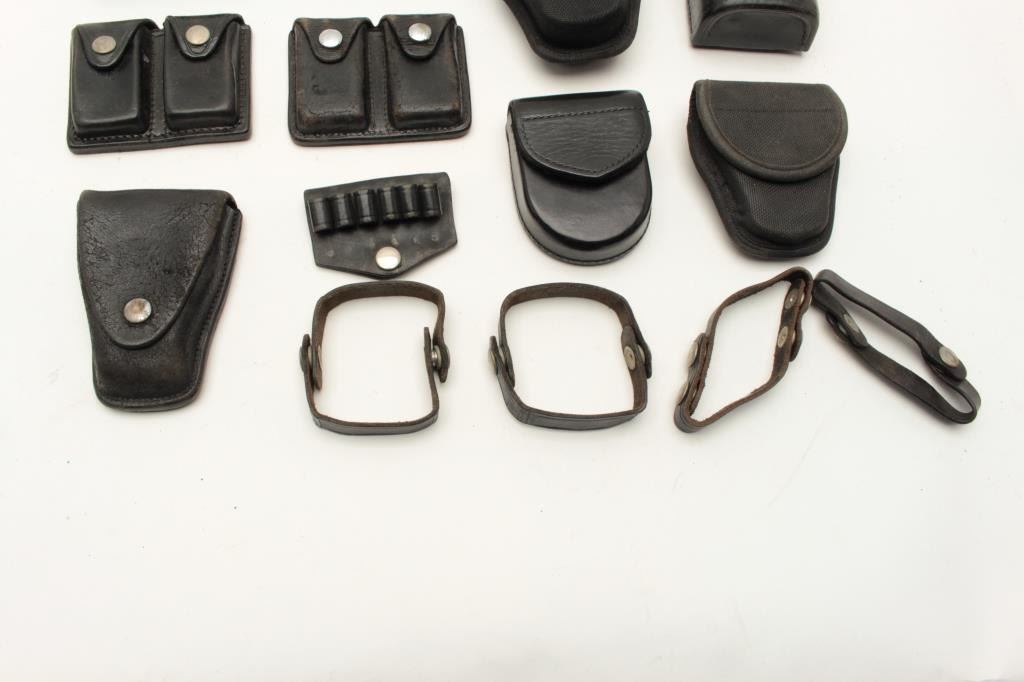 Lot of duty gear; Sam Brown, holsters, handcuff cases, ammo pouches, etc. Est.: $75-$150.