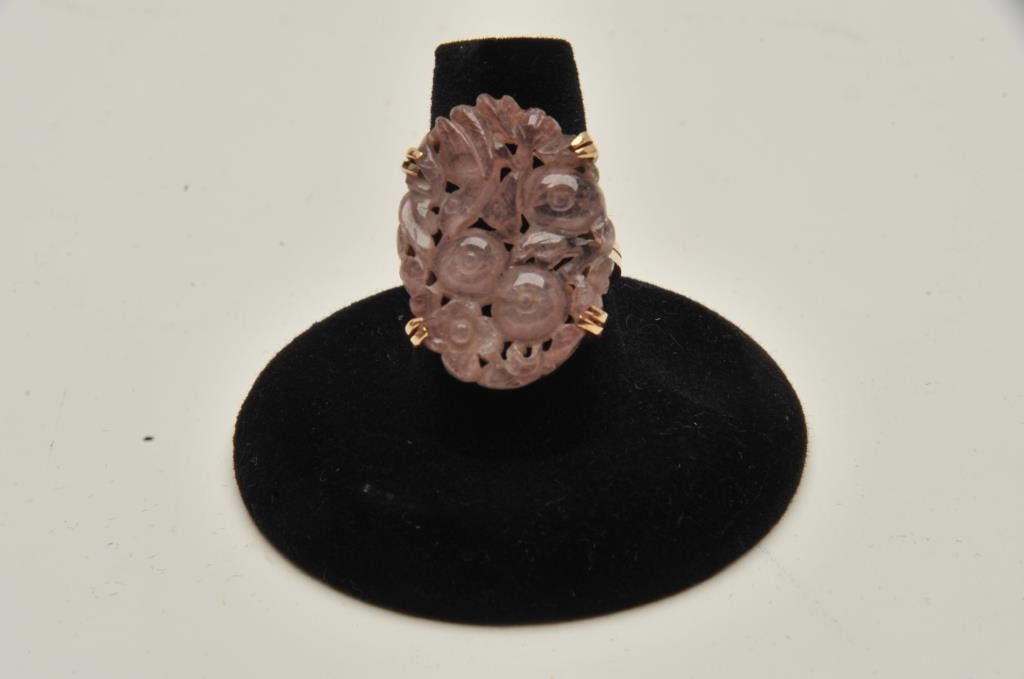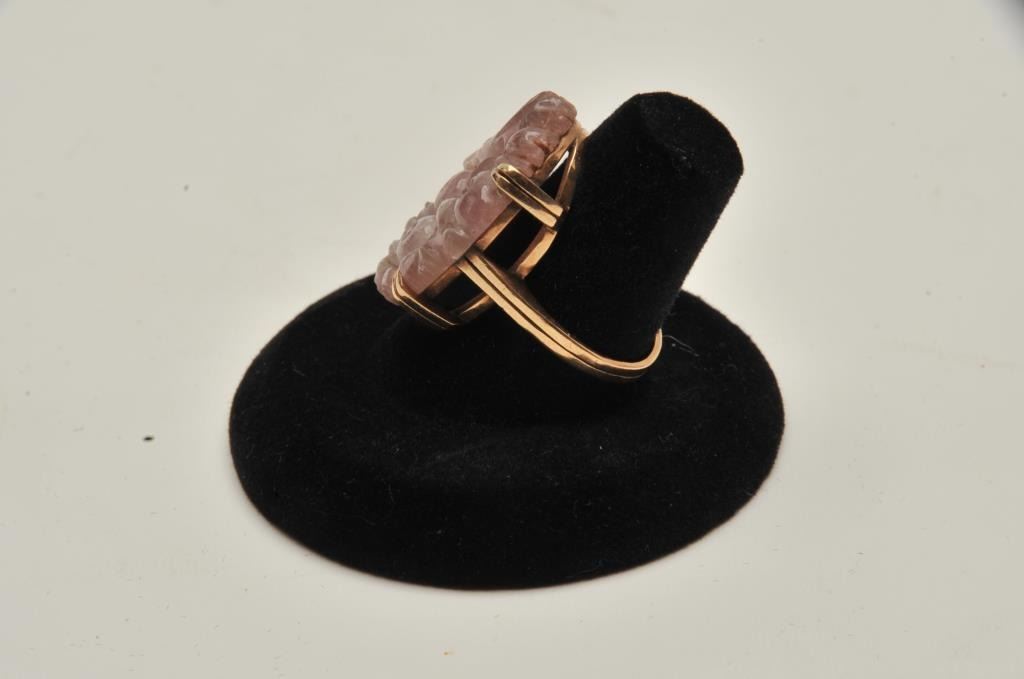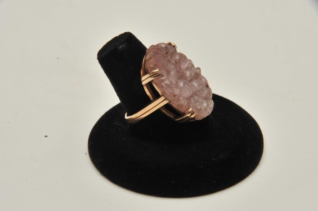 One carved pink quartz ring in 14k yellow gold ring Est:$450-550