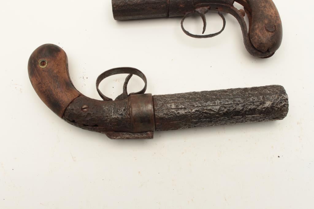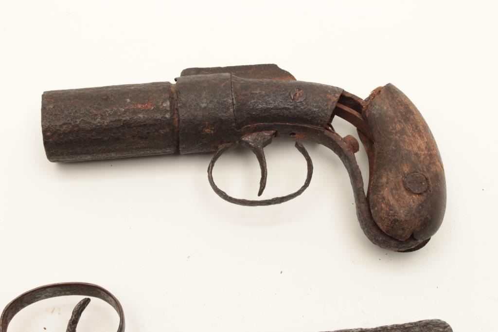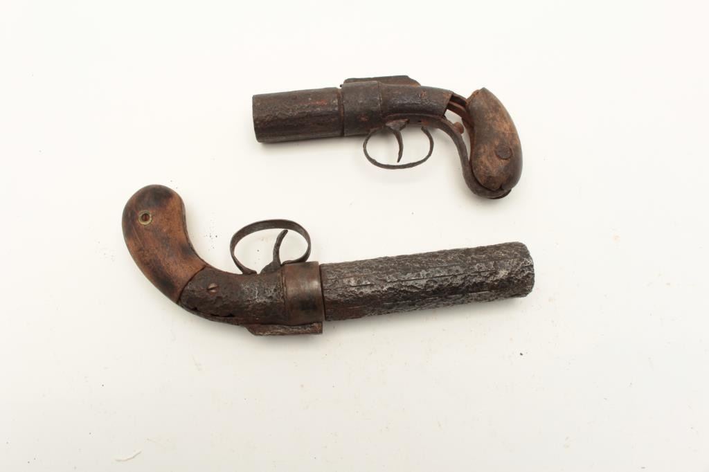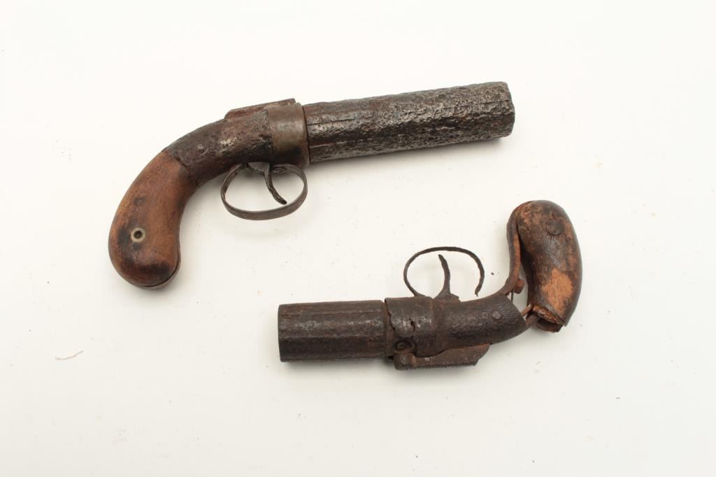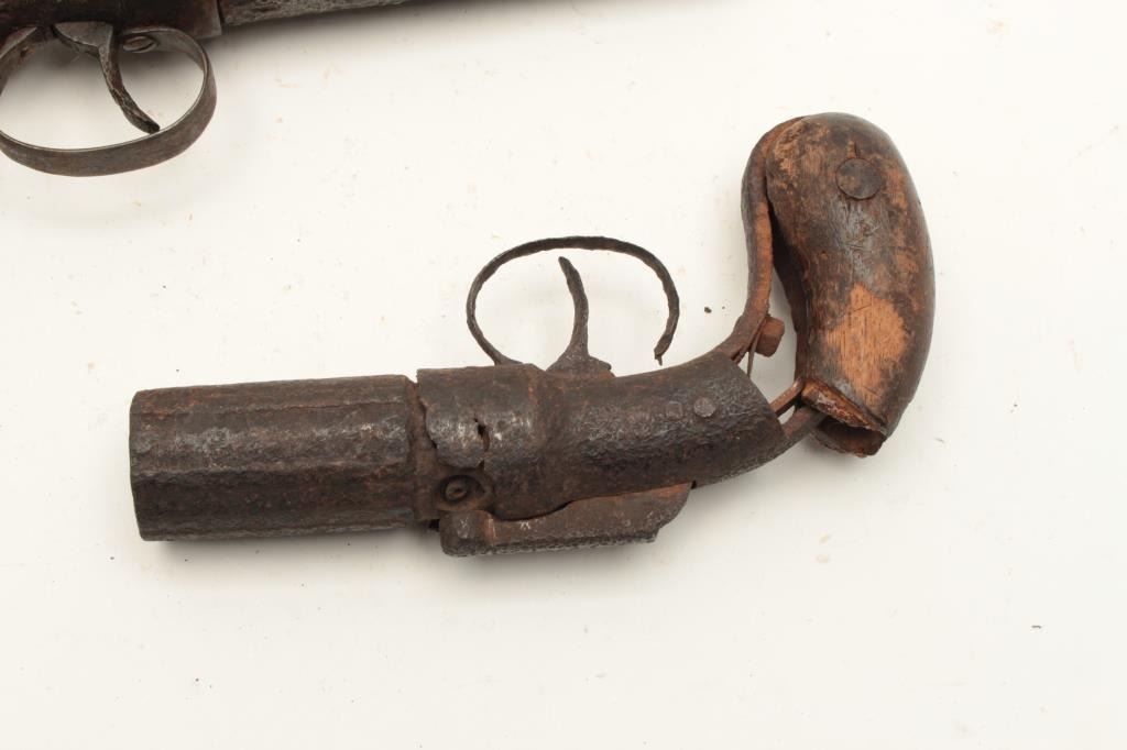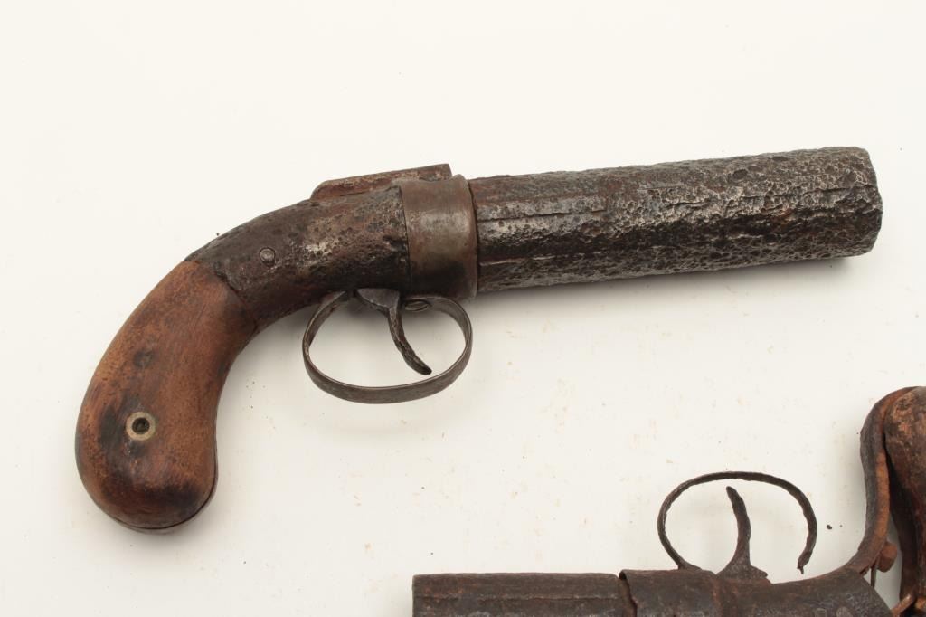 Lot of 2 rusty relic pepperbox pistols including a Dragoon size Allen & Thurber 6-shot with wood grips and a Marston 6-shot pepperbox, also with wood grips; both heavily rusted. From the collection of John O. Lot Title Beckwith. Est.: $300-$600.