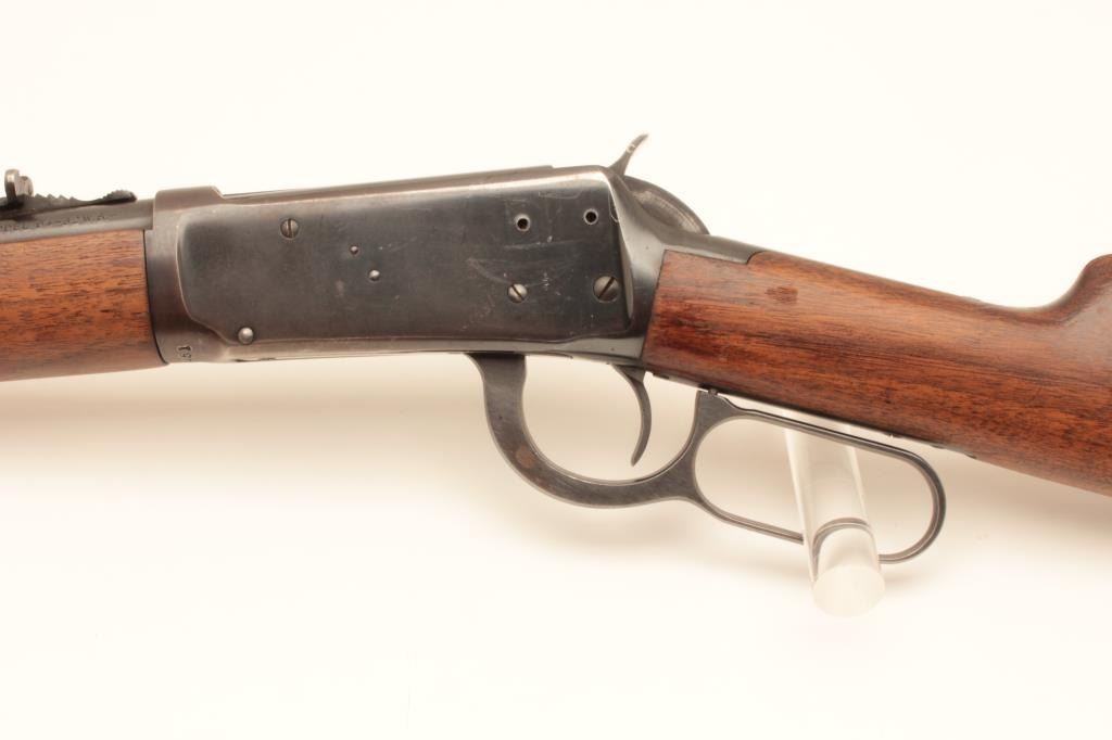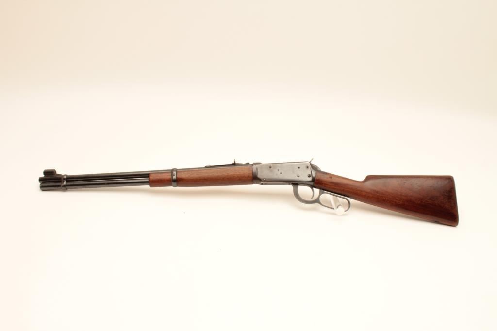 Winchester 94 Carbine #1636451, .32 Win Spl., 20" barrel, blued. Very good overall, blue is very good - 80-90%, stock is good, showing extra holes. Tap holes in the action. Good action and bore. (C&R / PPT) Est. $250-500